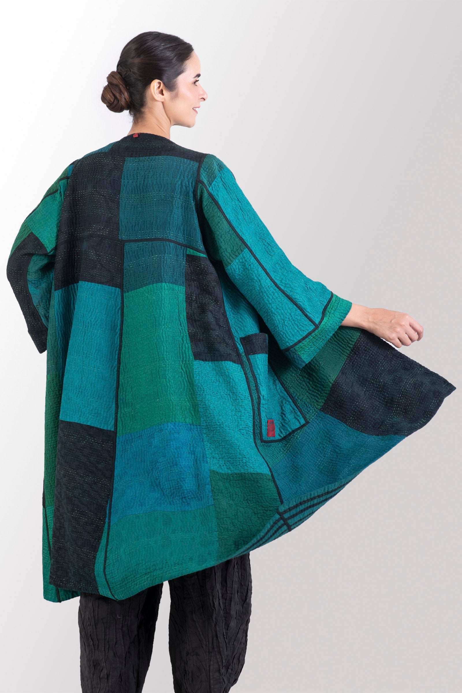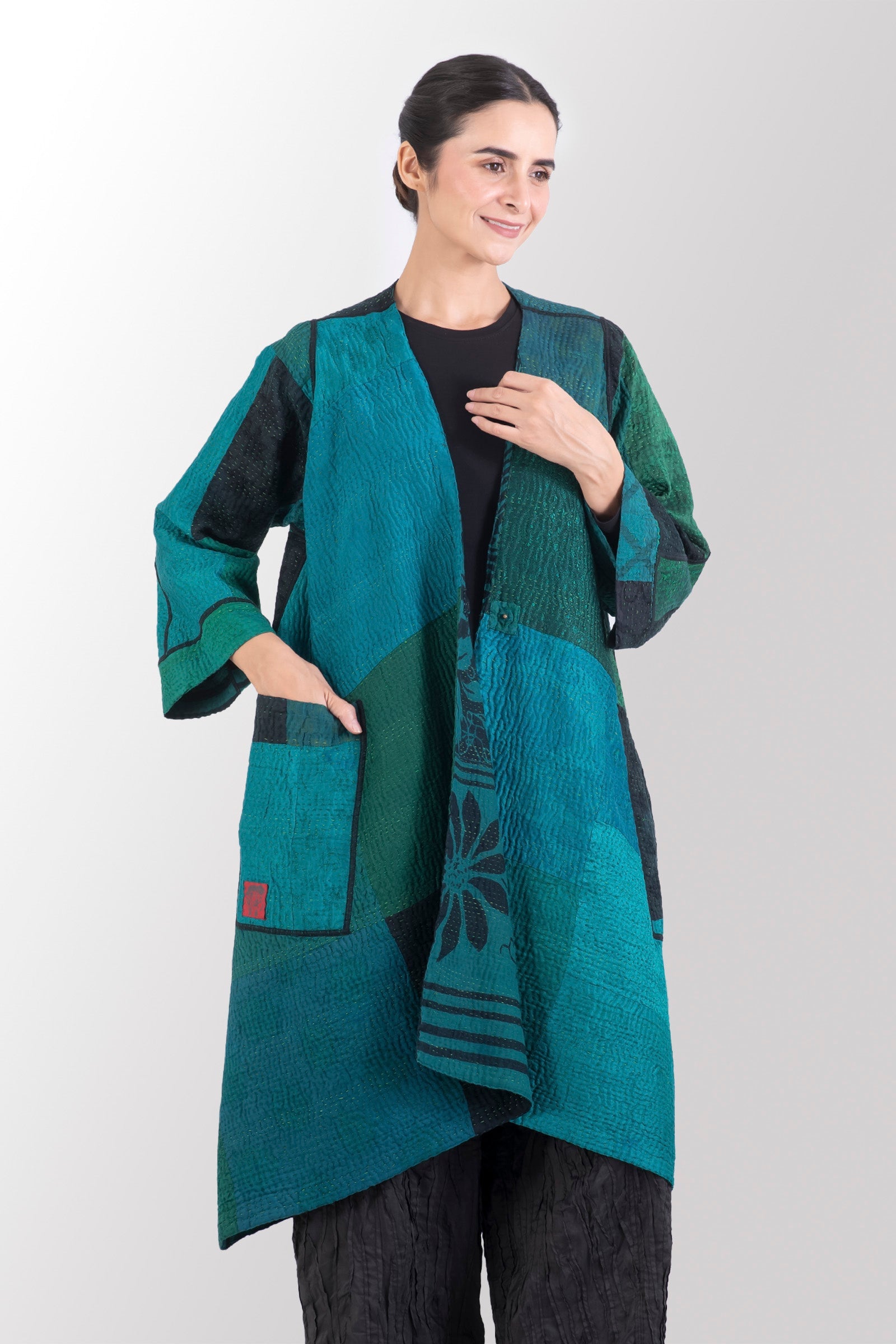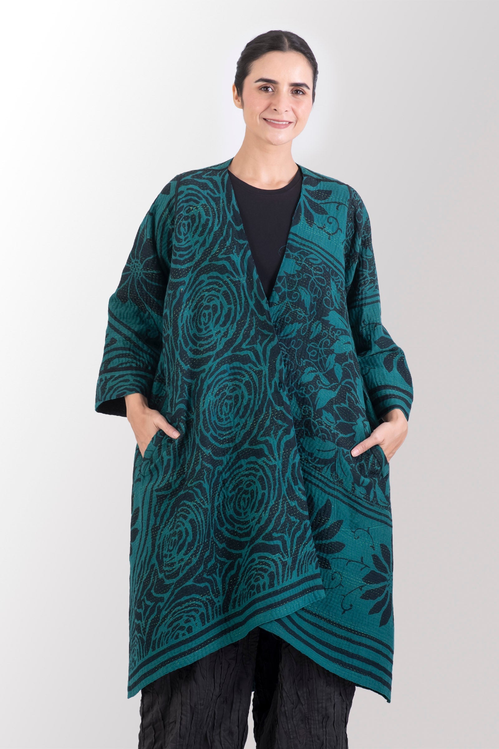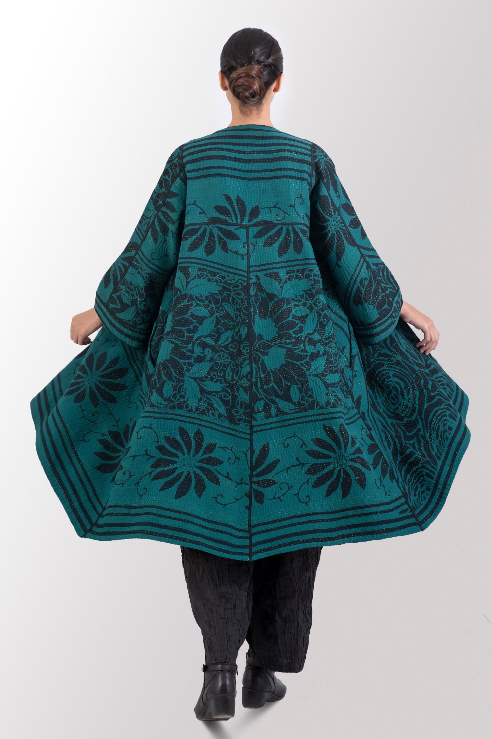 EMERALD GREEN KANTHA WRAP FLARE COAT - eg4330-tel -
