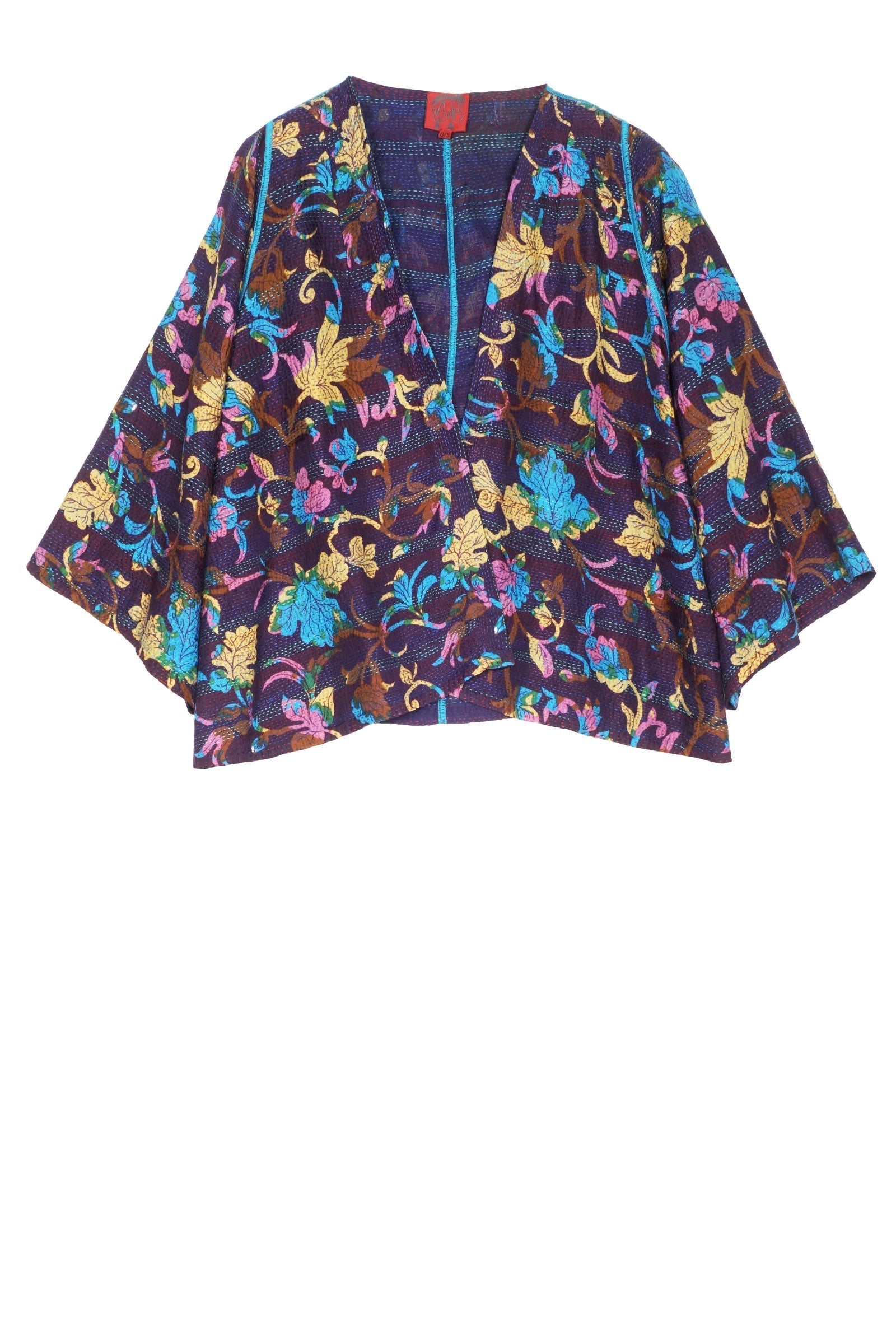 FLORAL SILK PRINT KANTHA BELL SHAPE JACKET - fs2048-nvy -