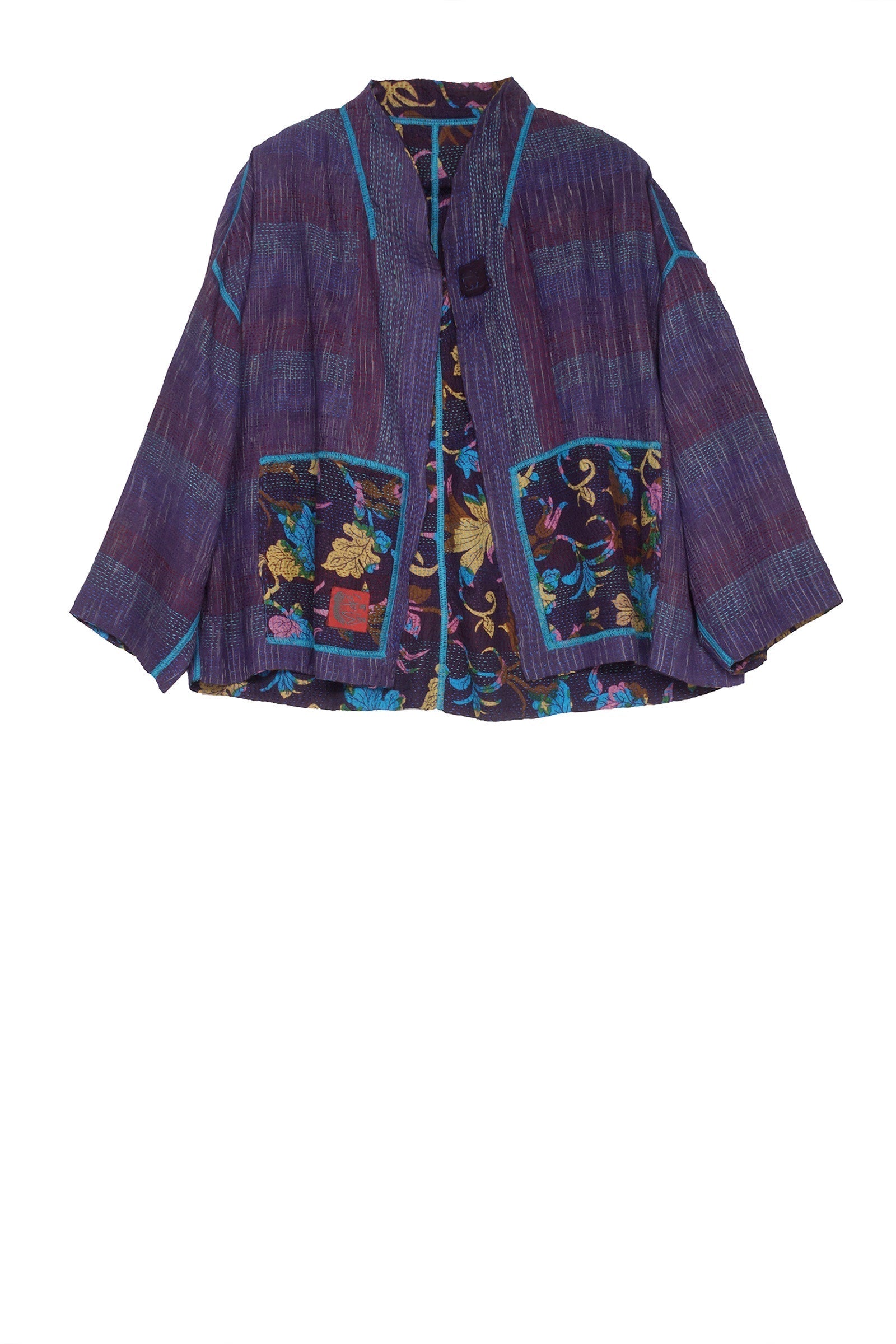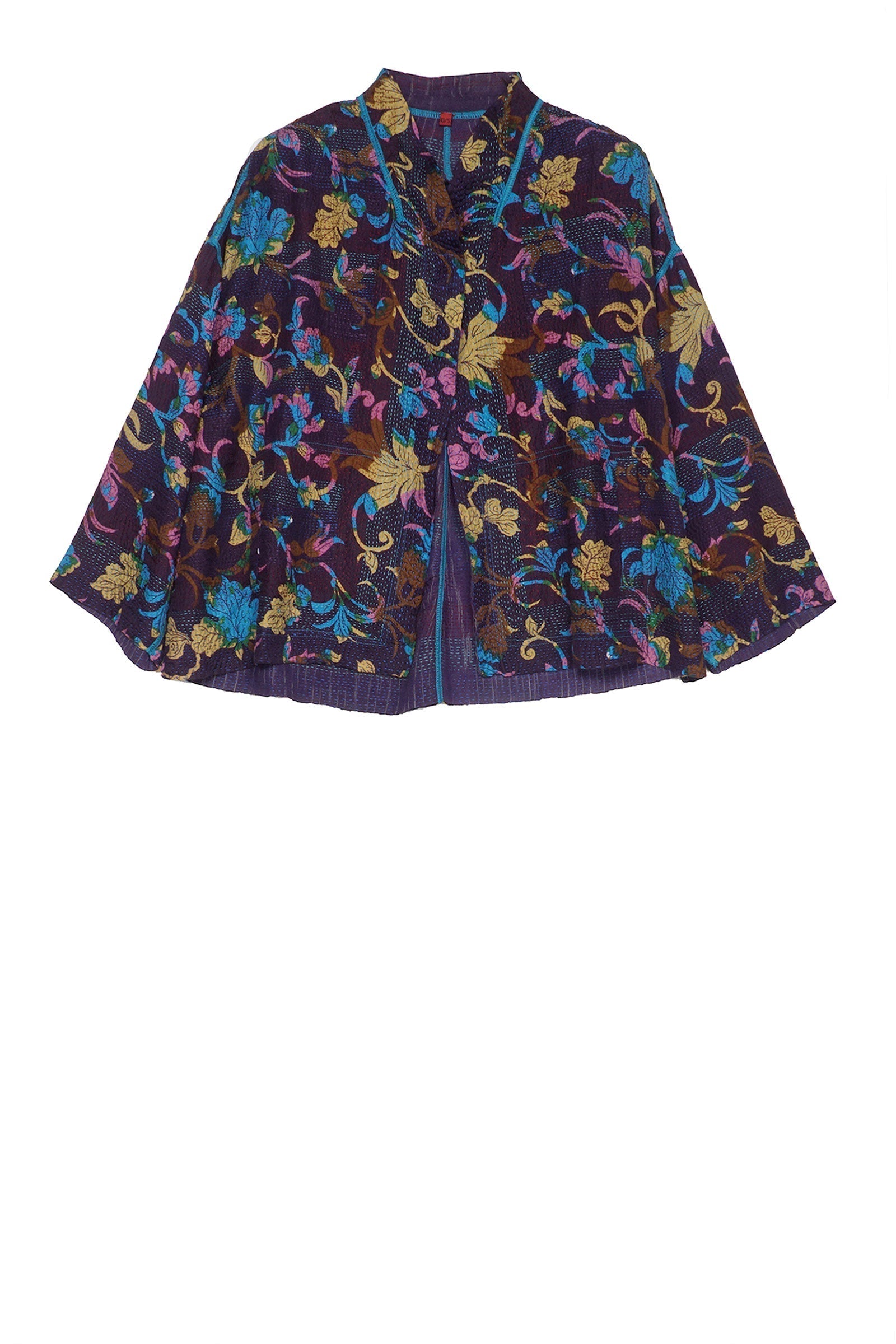 FLORAL SILK PRINT KANTHA STAND COLLAR CROPPED JKT - fs2034-nvy -