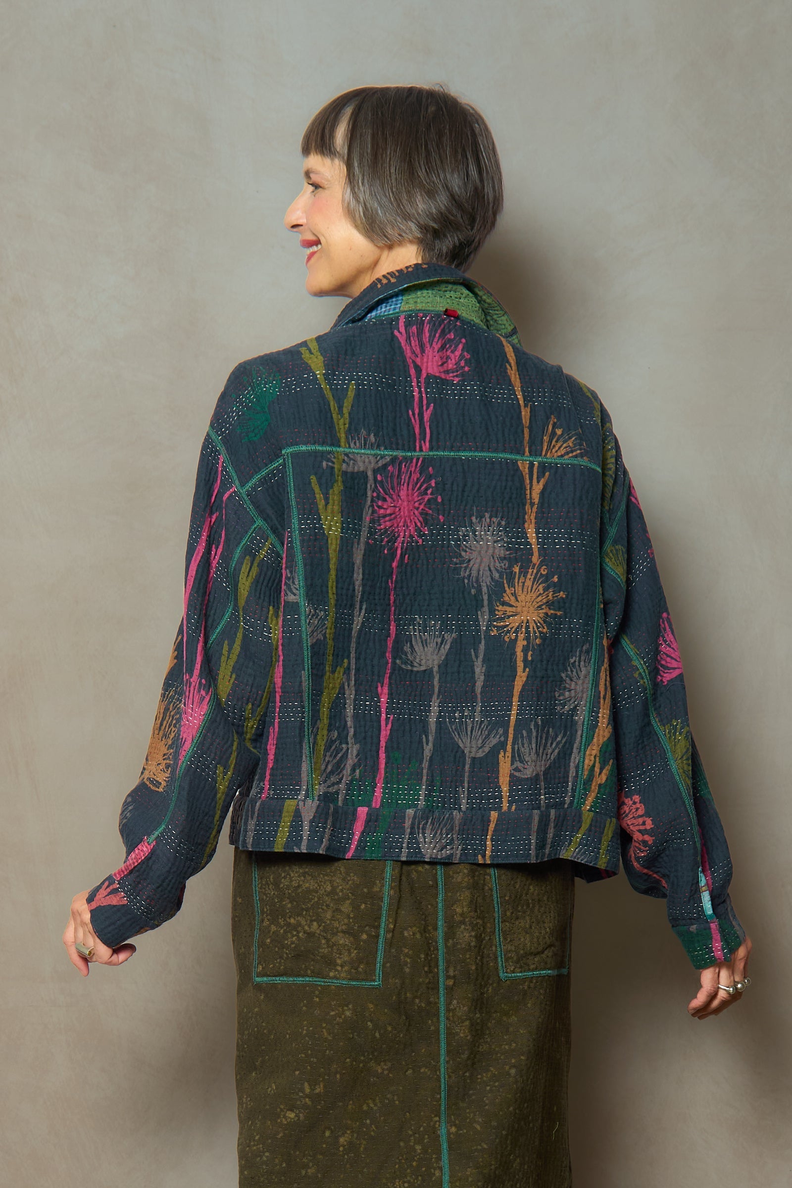 FLOWER PRINT WITH CHECKERED PATCH OVERSIZED TRUCKER JACKET - fc4j107-blk -