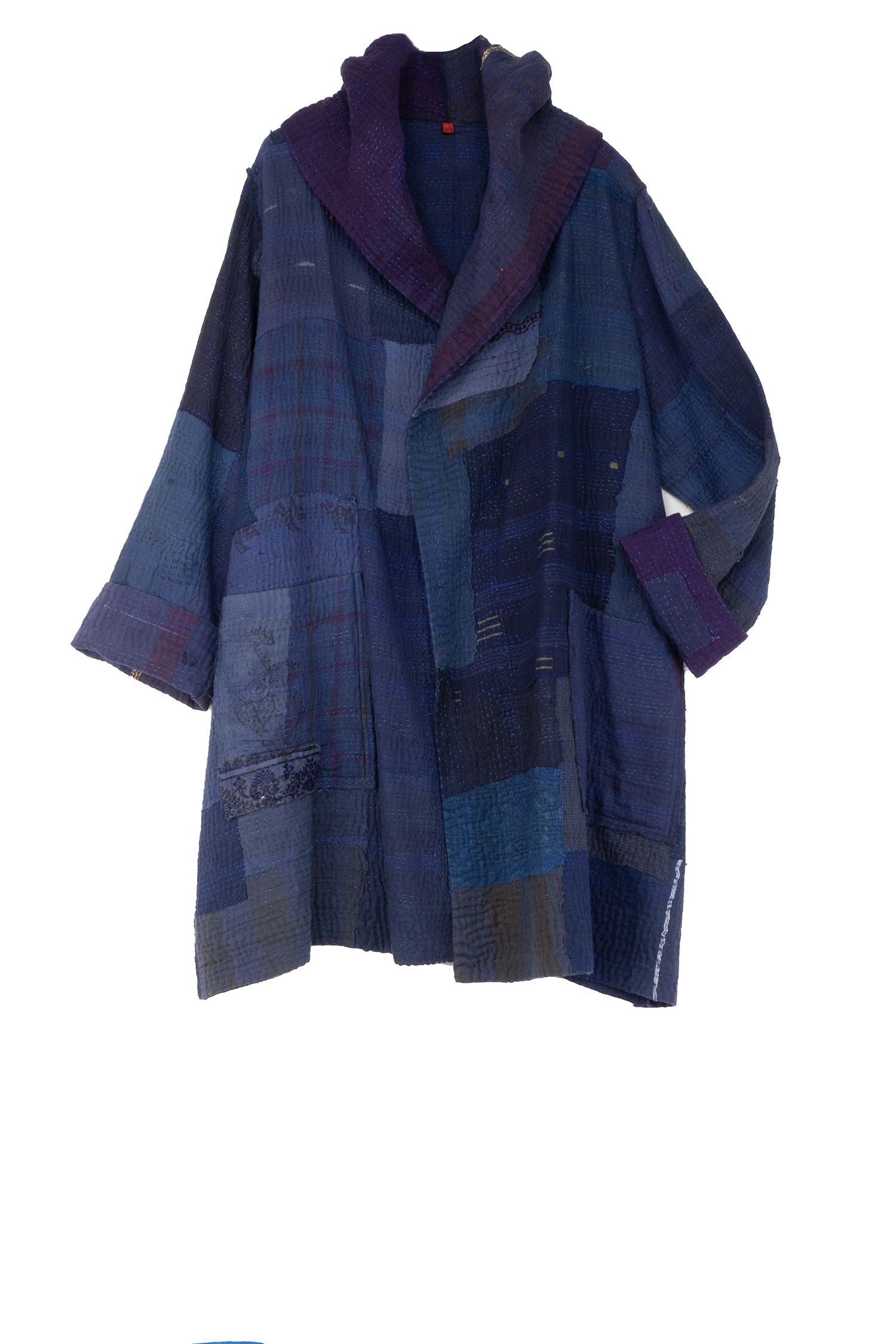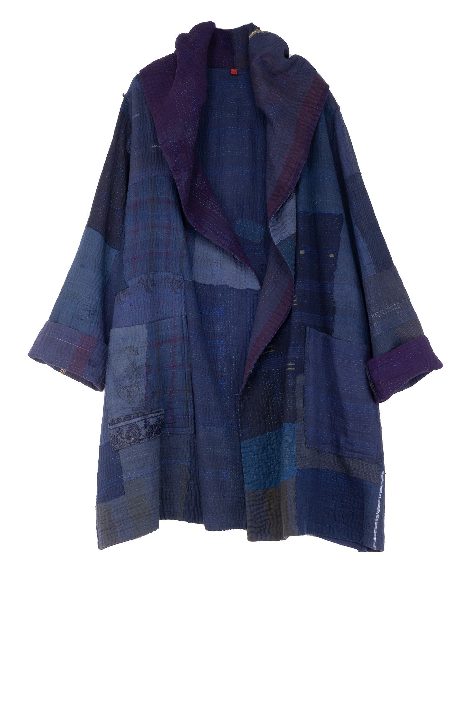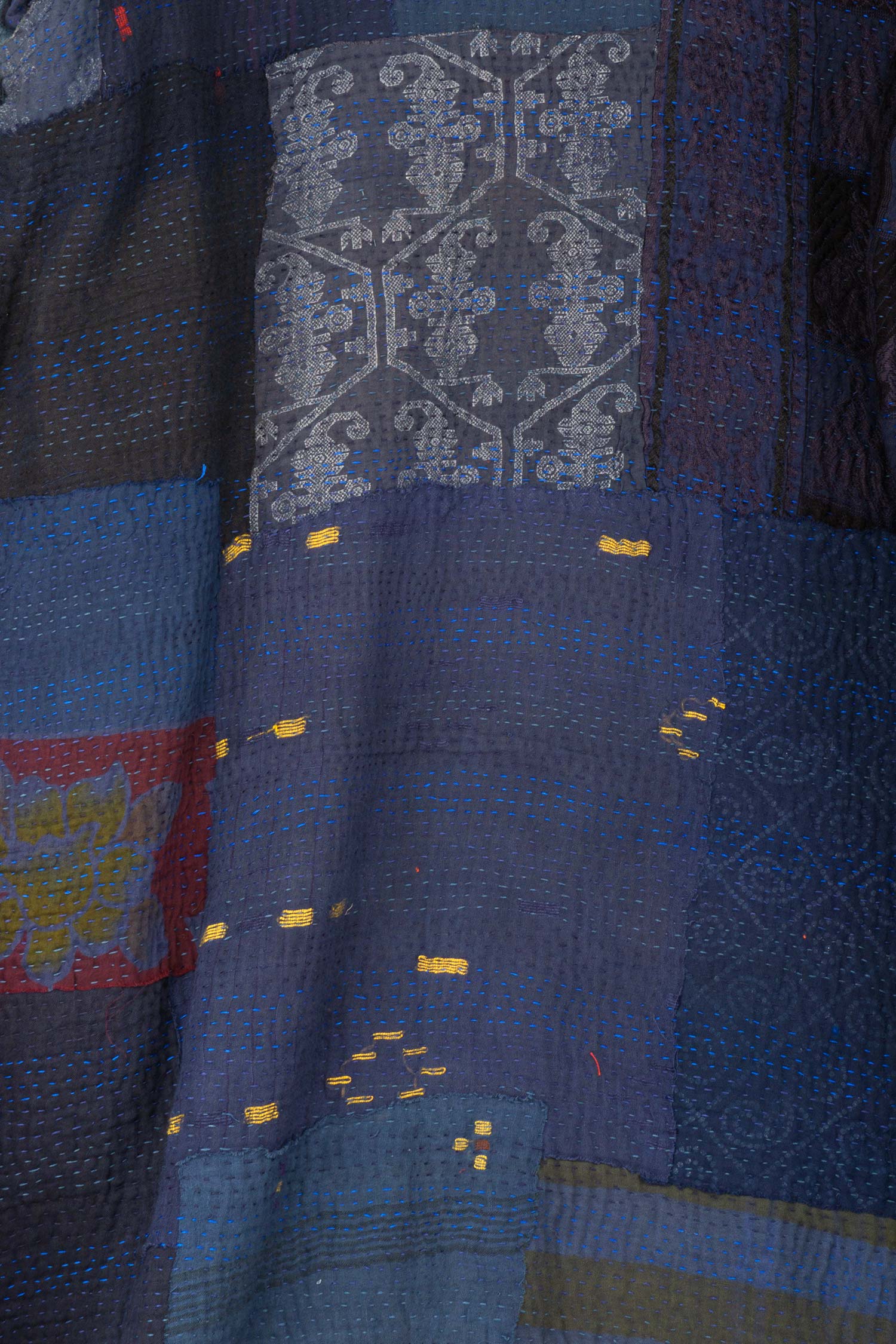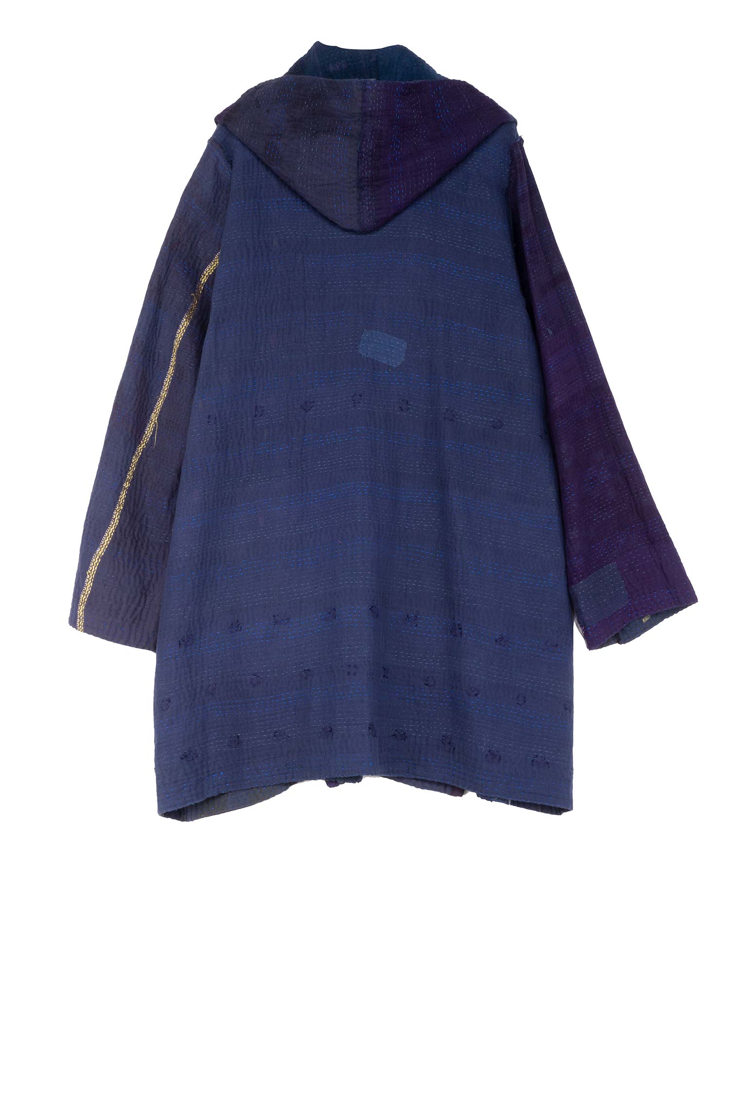 FRAYED PATCH KANTHA HOODED POCKET COAT - fi4303-nvy -