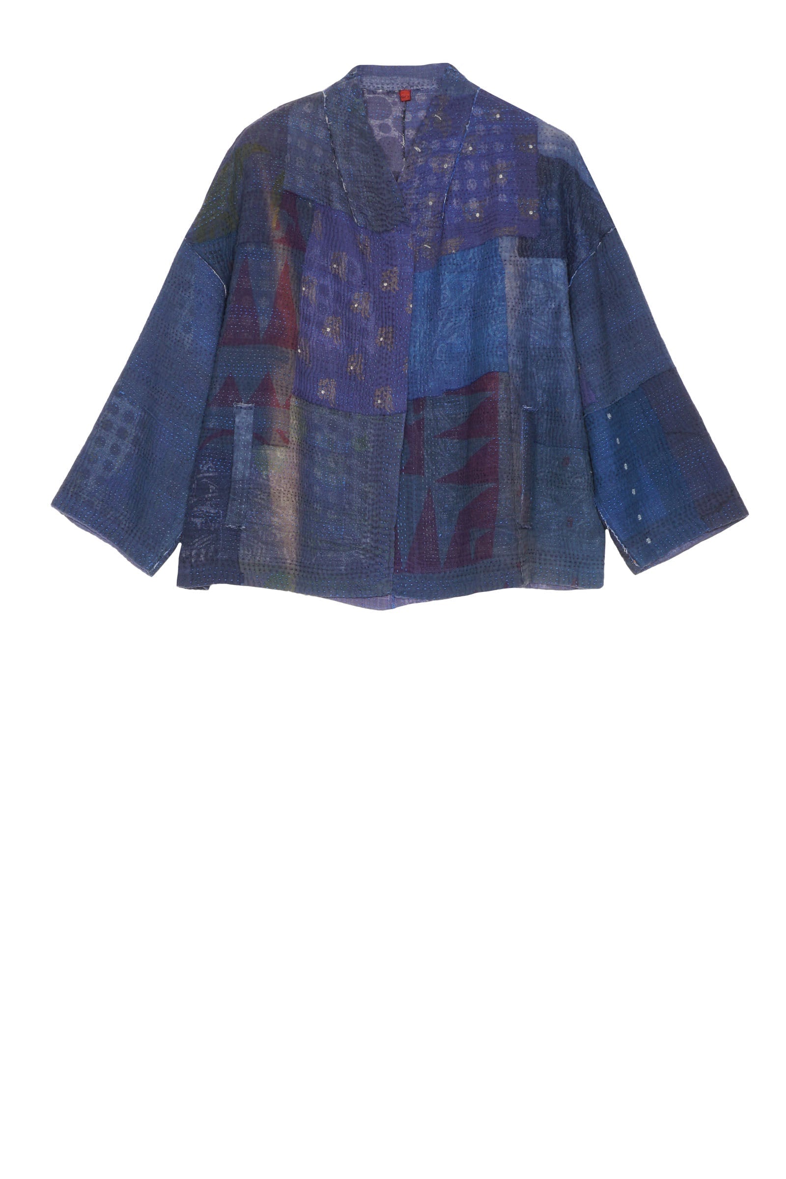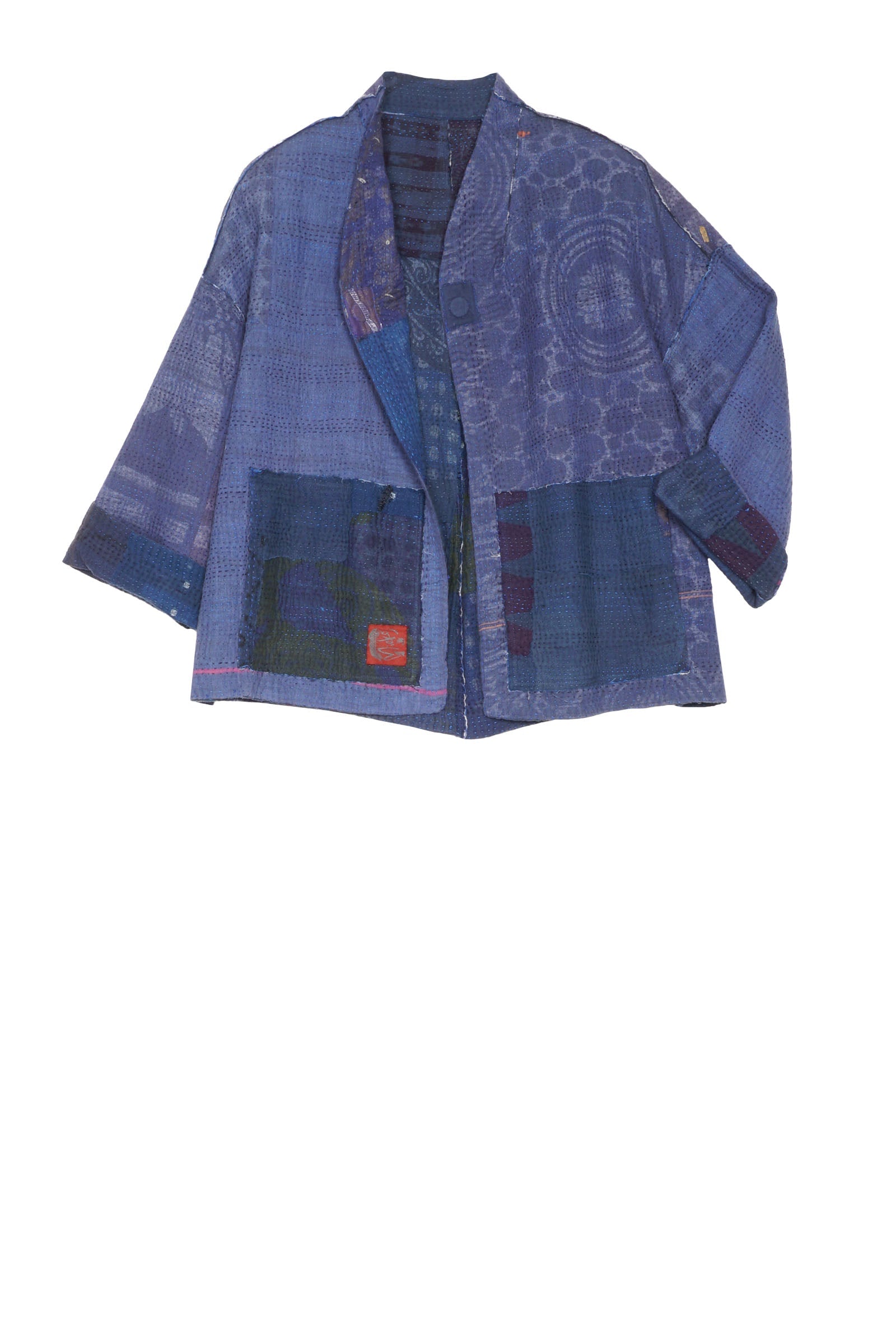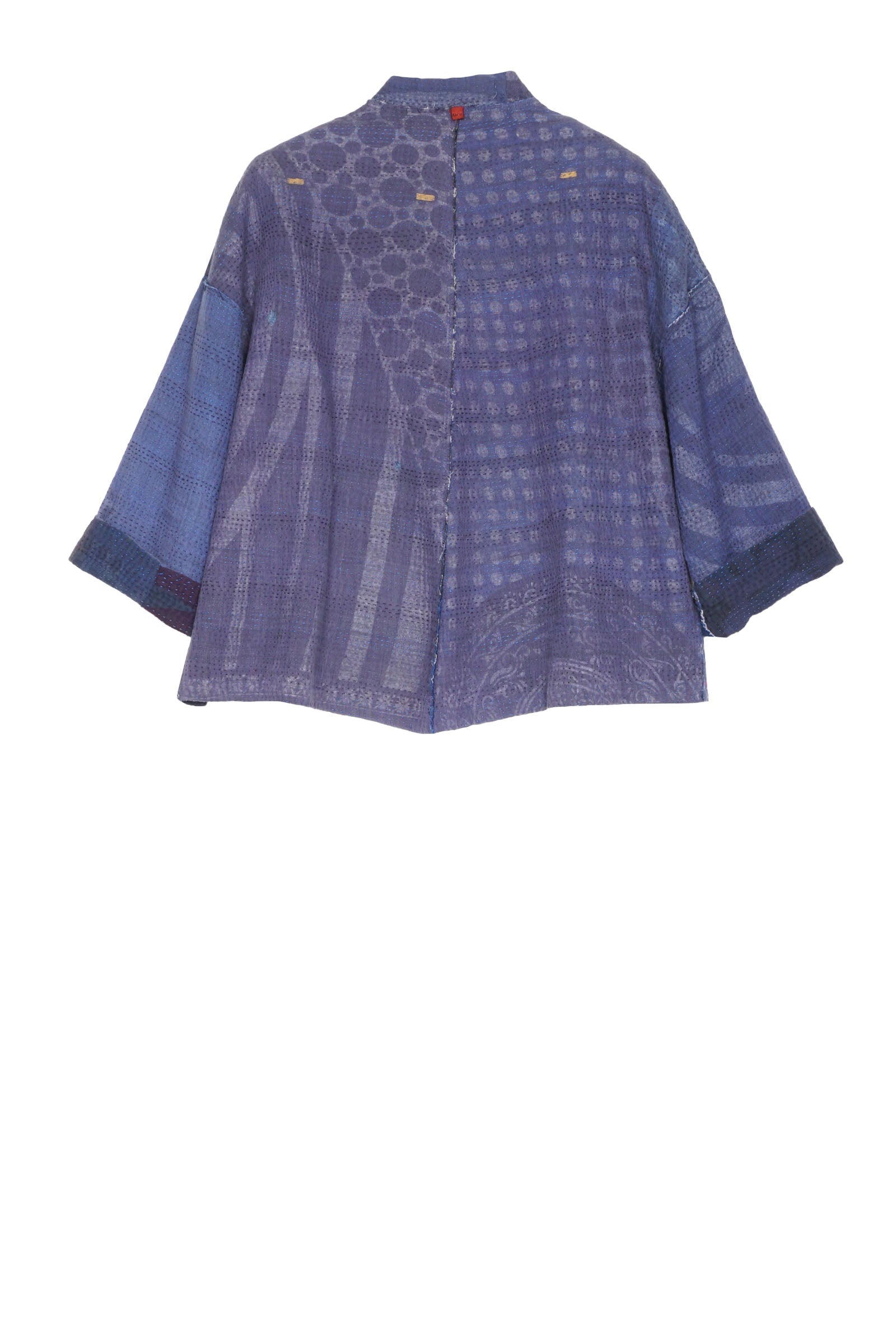 FRAYED PATCH KANTHA STAND COLLAR CROPPED JKT - fi4034-nvy -