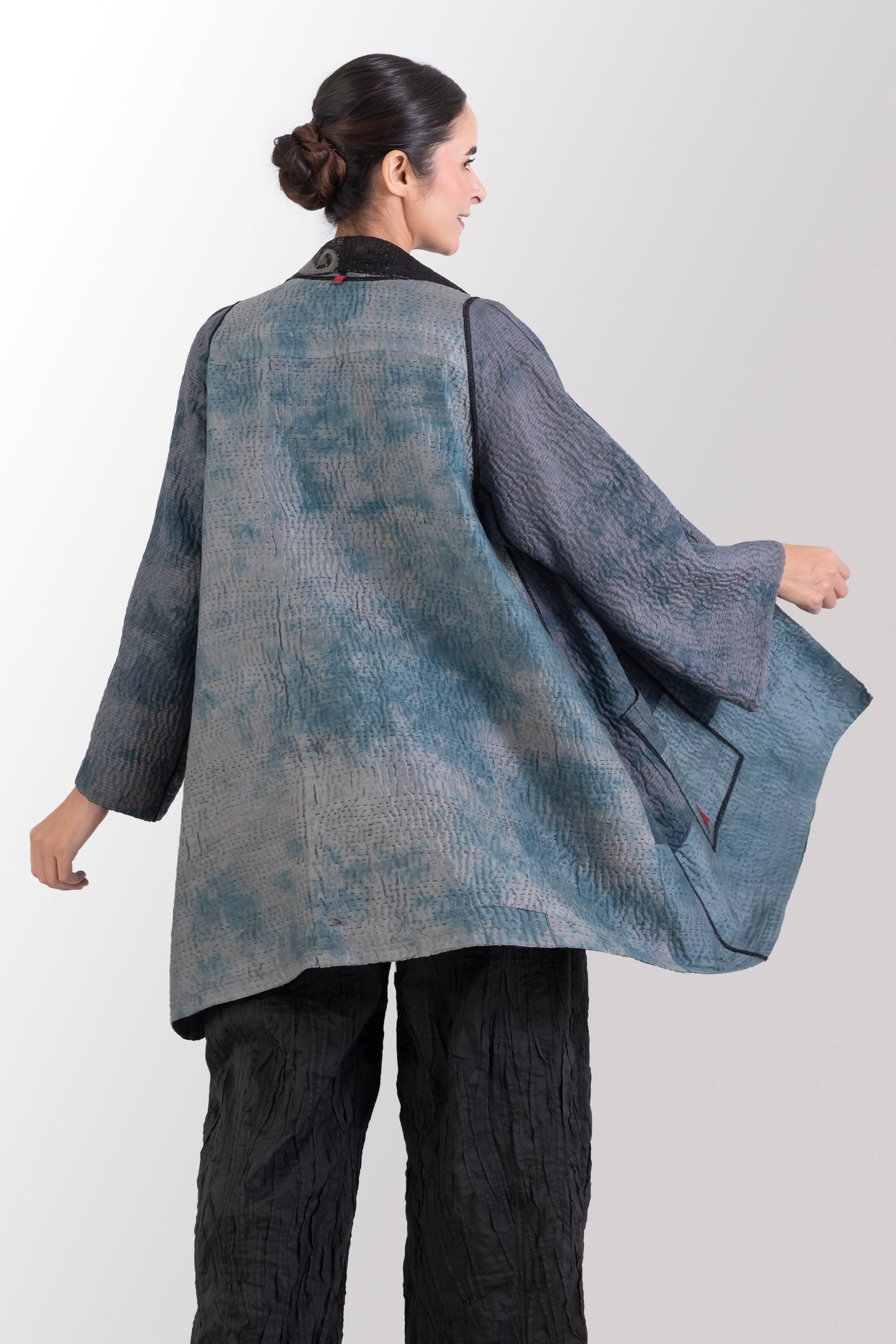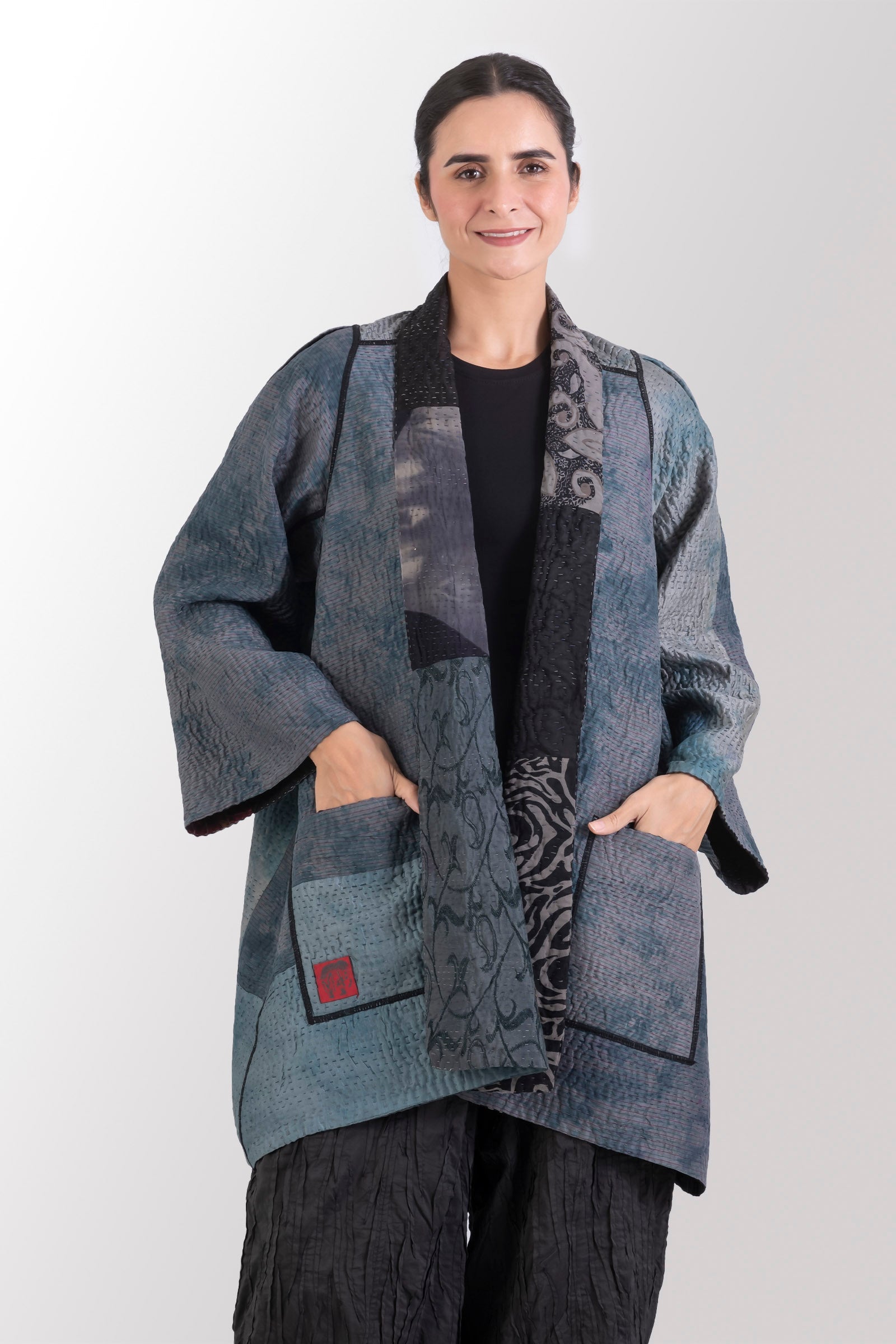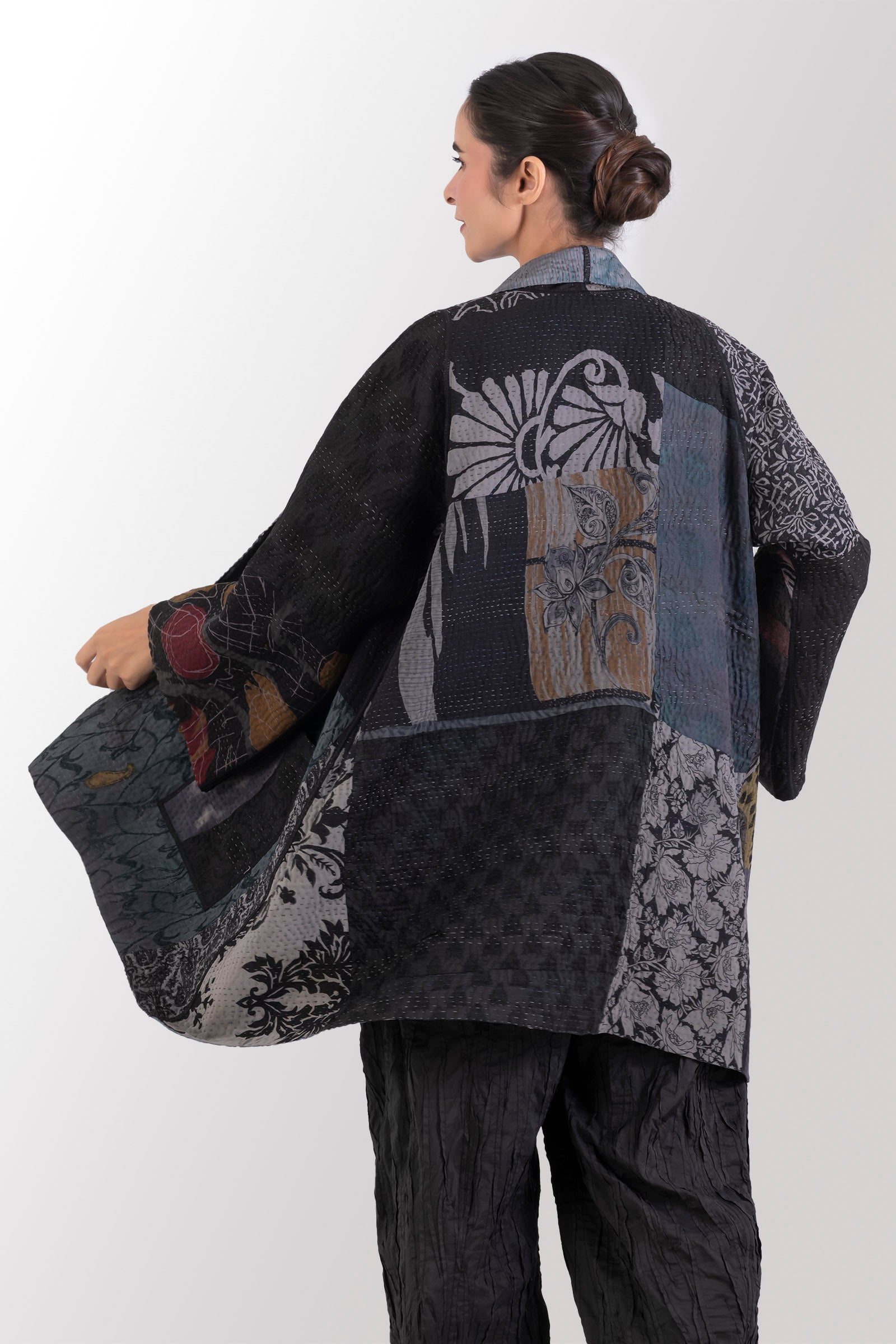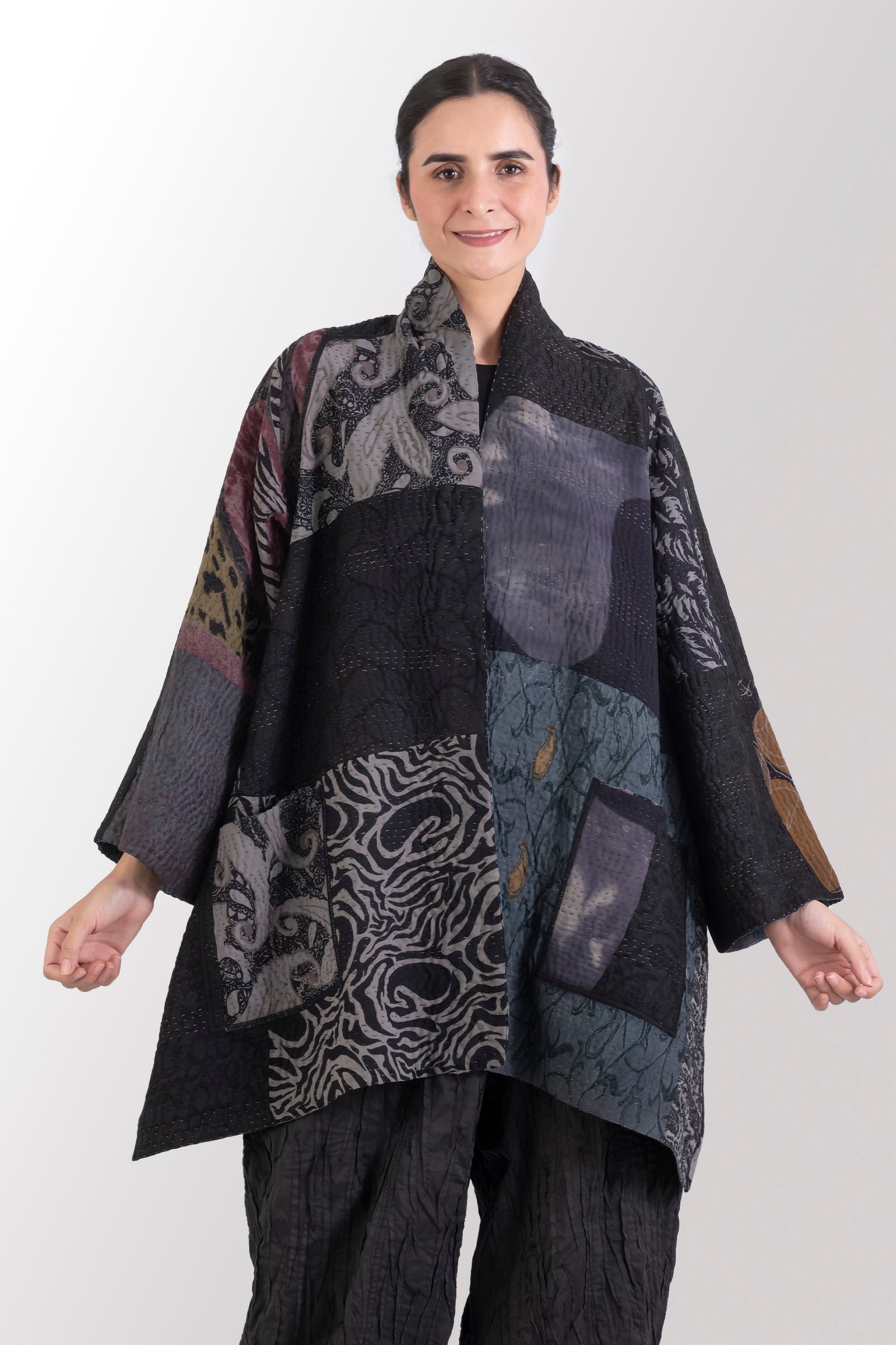 GEORGETTE JACQUARD VINTAGE SILK PATCH KANTHA A-LINE JACKET - gj4003-blk -