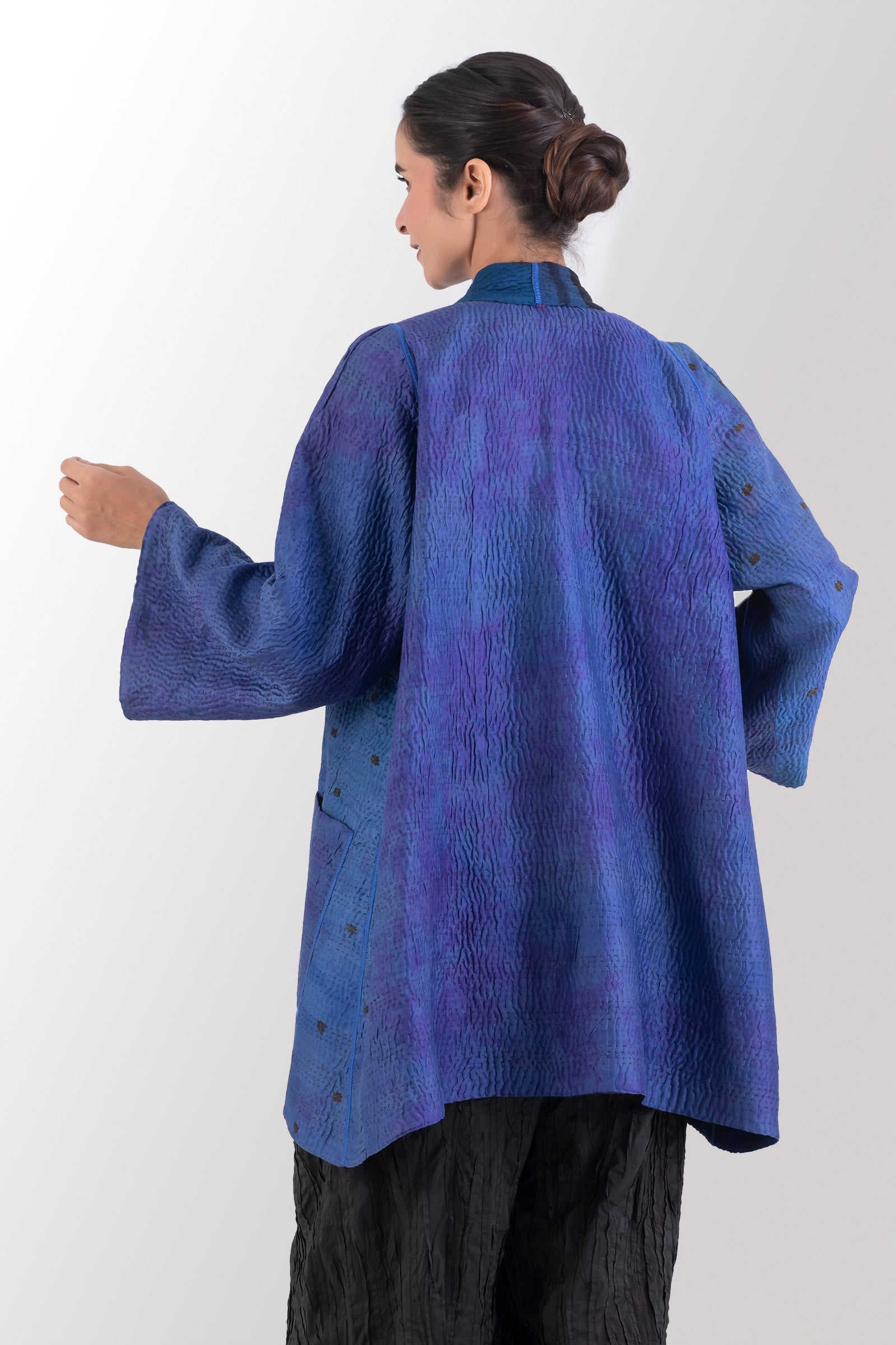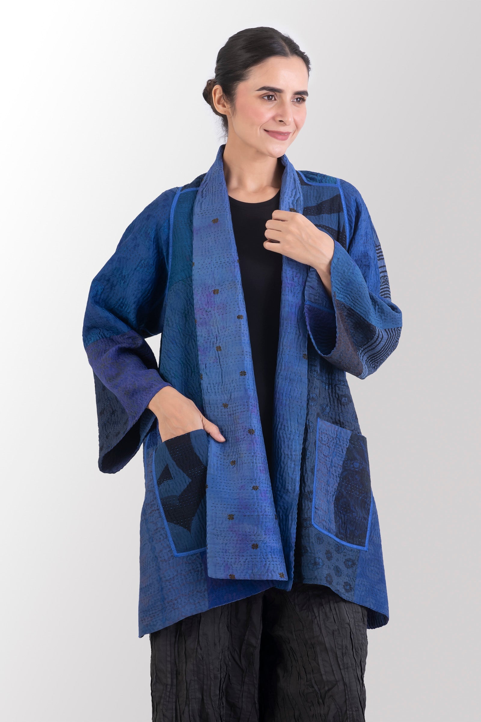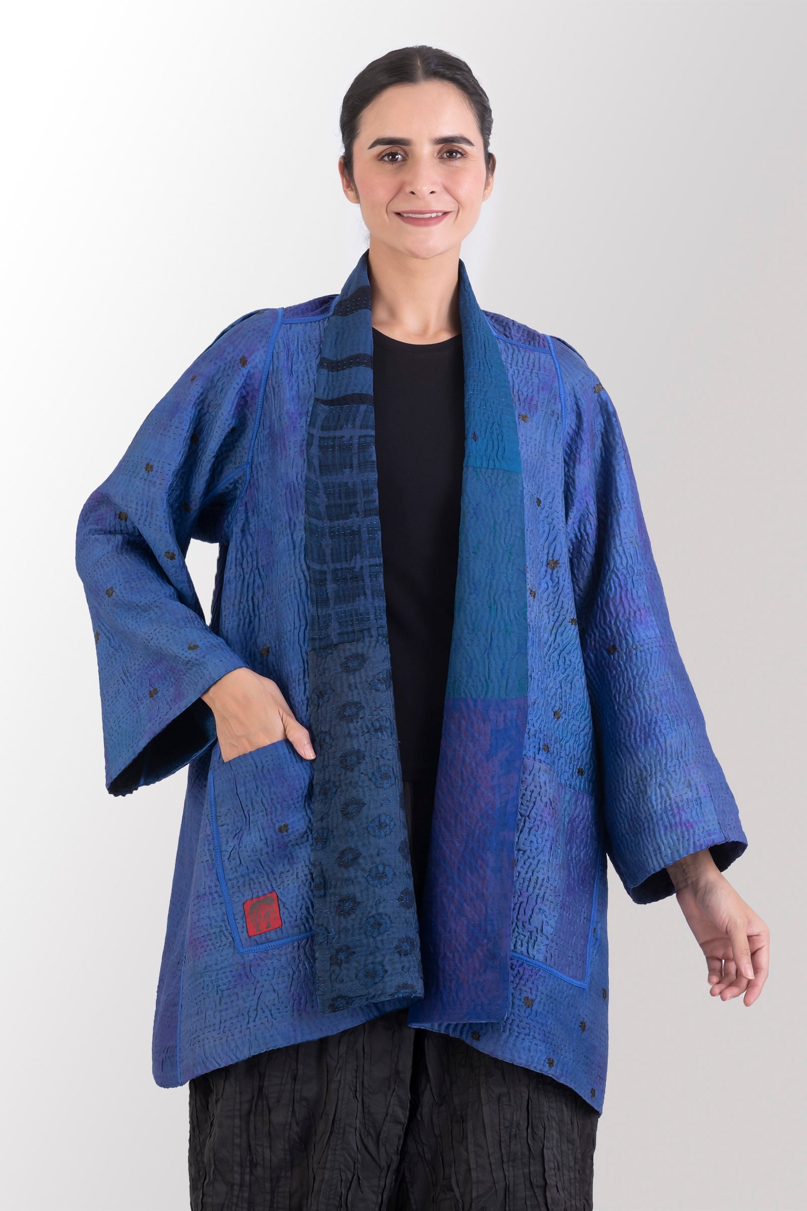 GEORGETTE JACQUARD VINTAGE SILK PATCH KANTHA A-LINE JACKET - gj4003-blu -