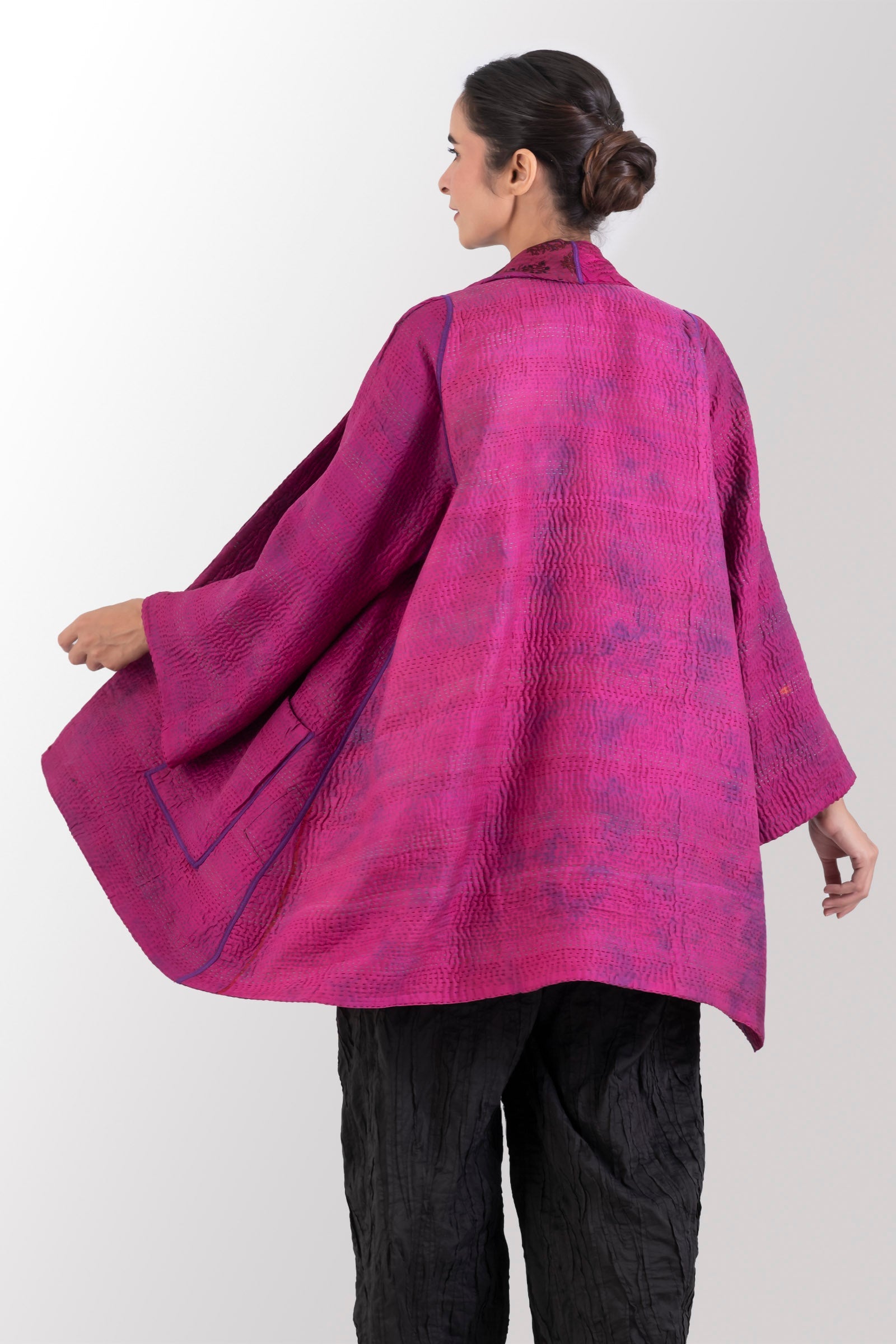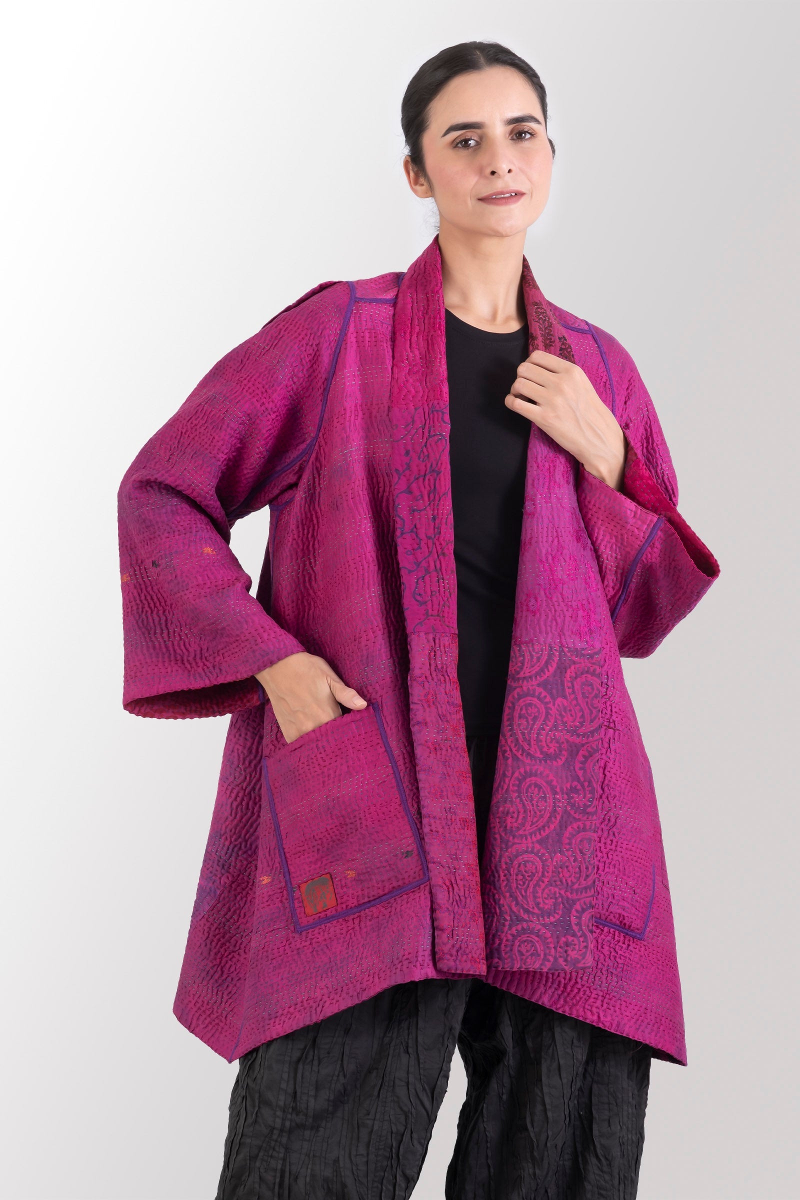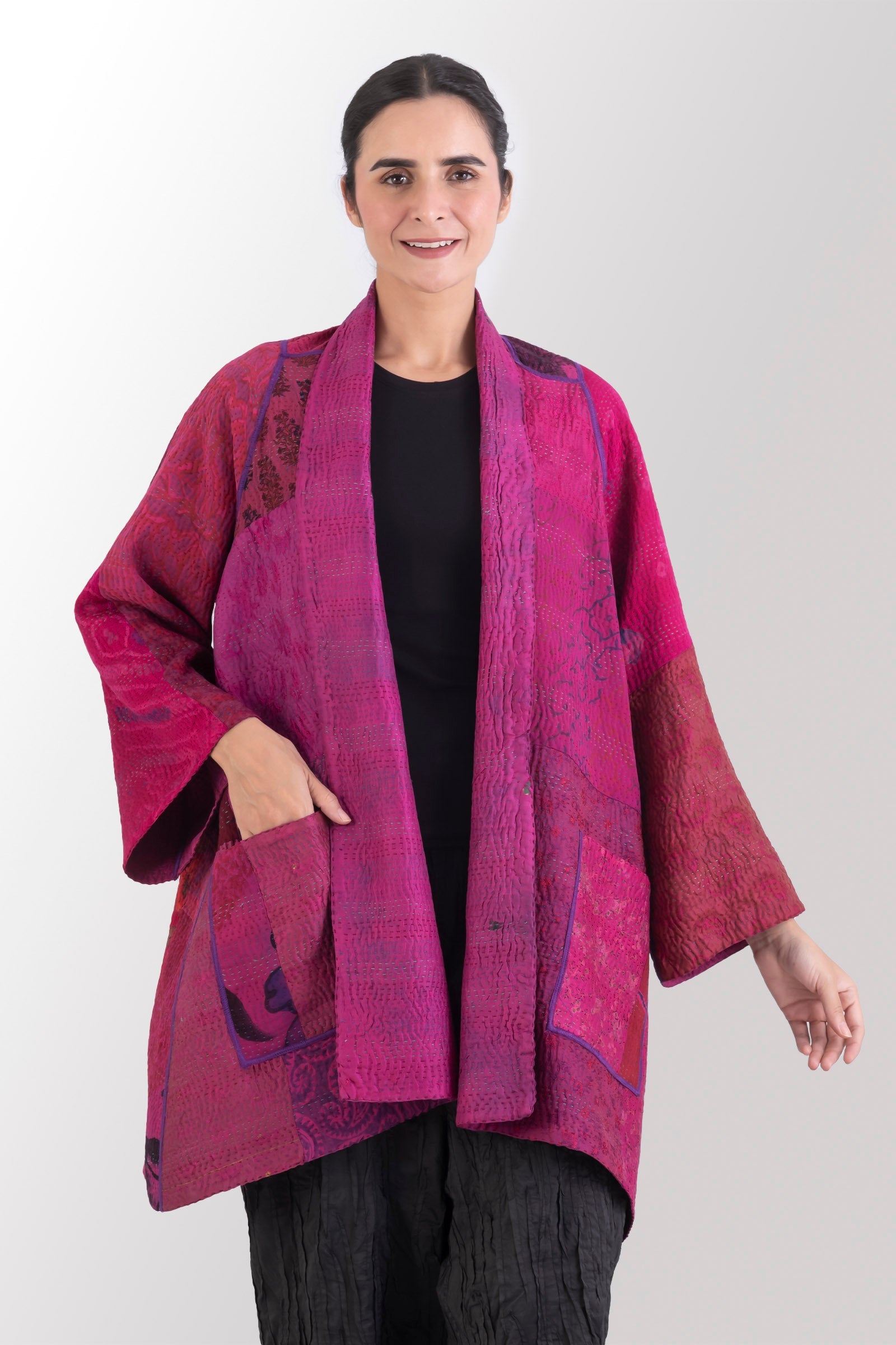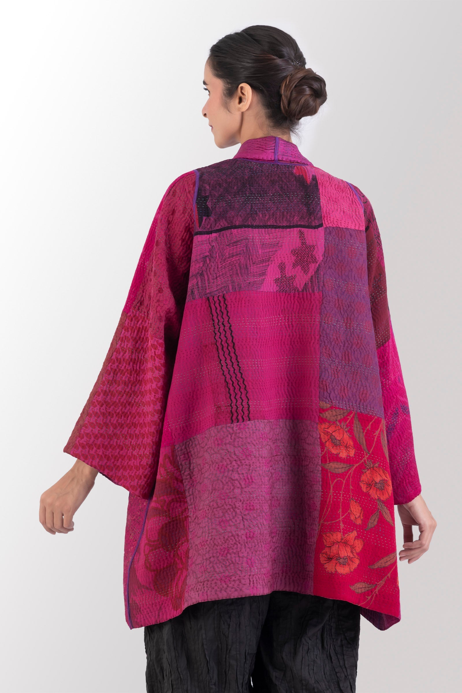 GEORGETTE JACQUARD VINTAGE SILK PATCH KANTHA A-LINE JACKET - gj4003-pik -