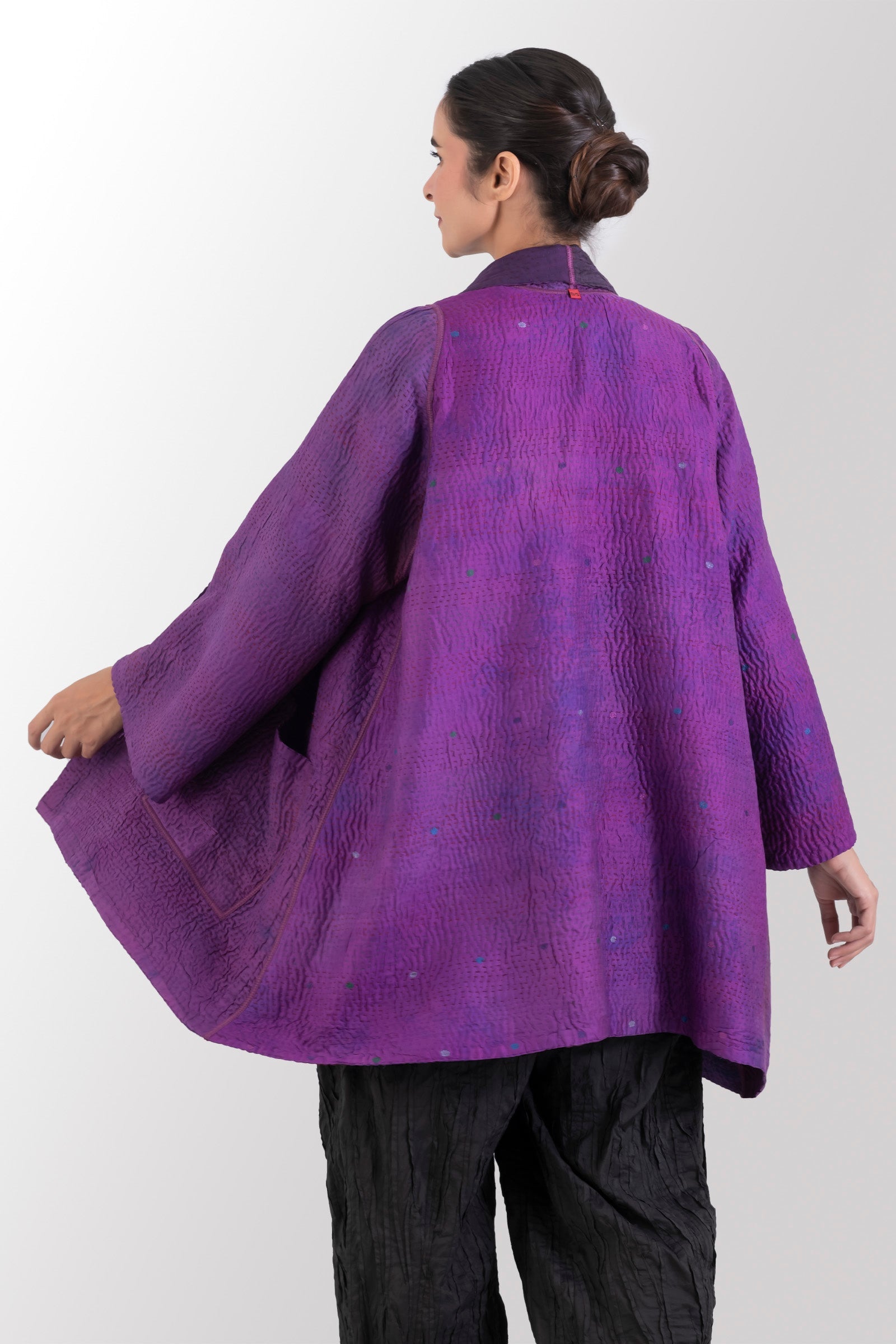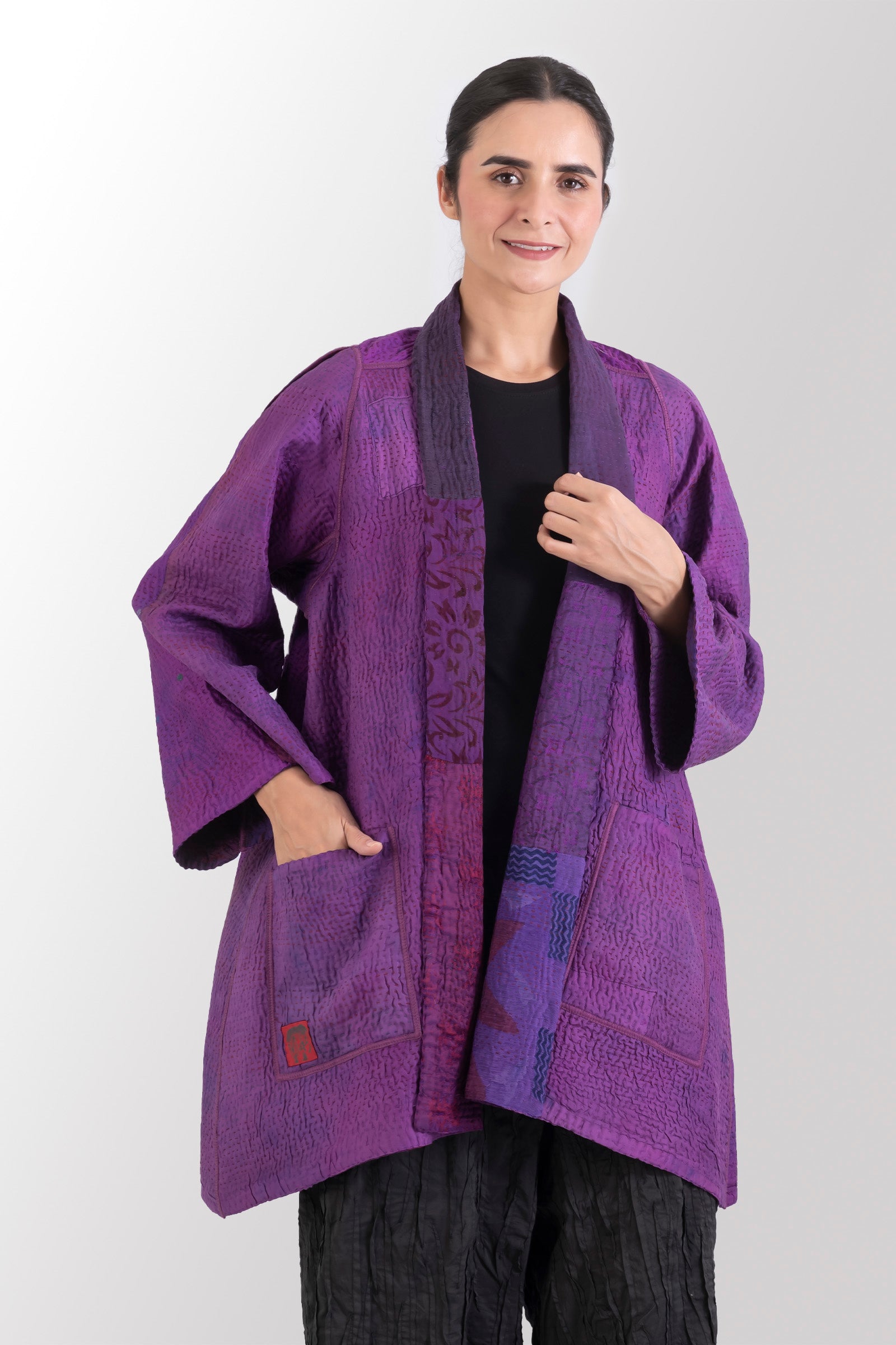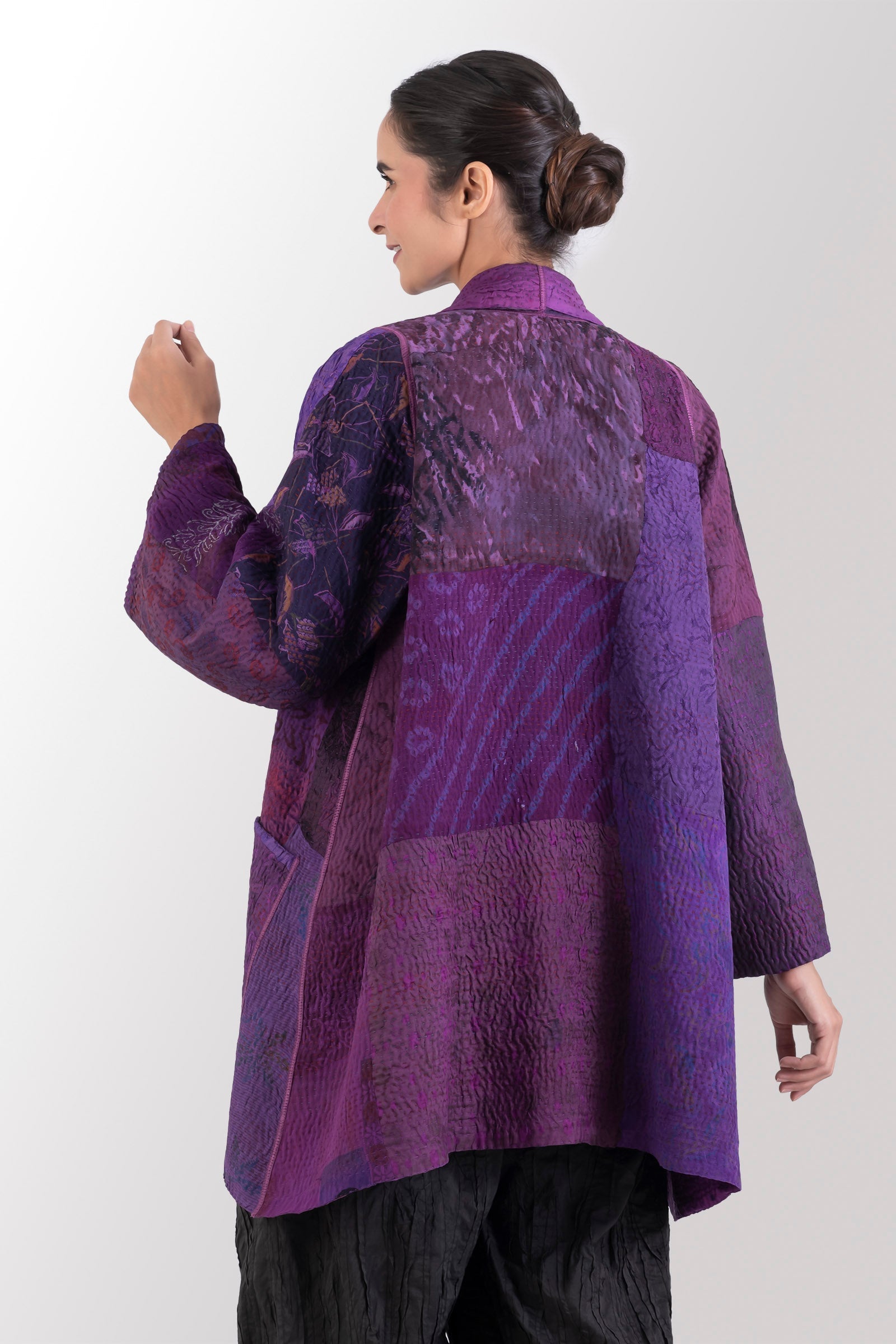 GEORGETTE JACQUARD VINTAGE SILK PATCH KANTHA A-LINE JACKET - gj4003-prp -