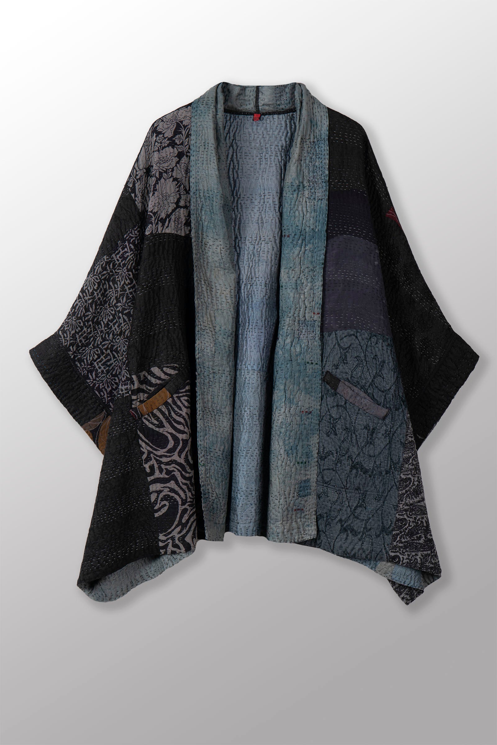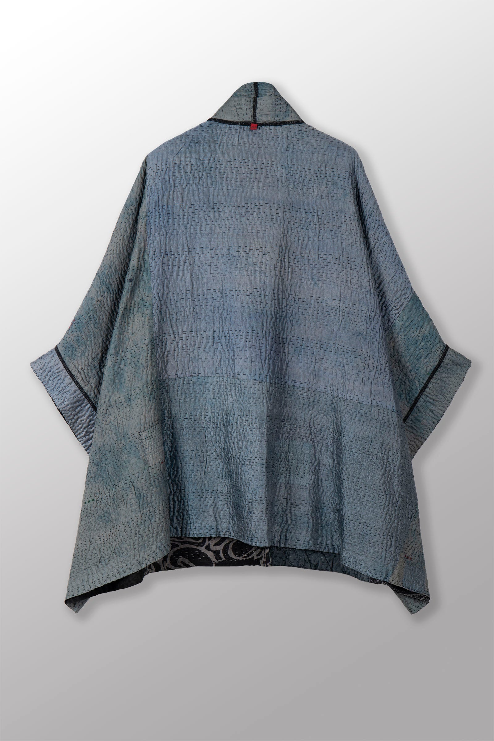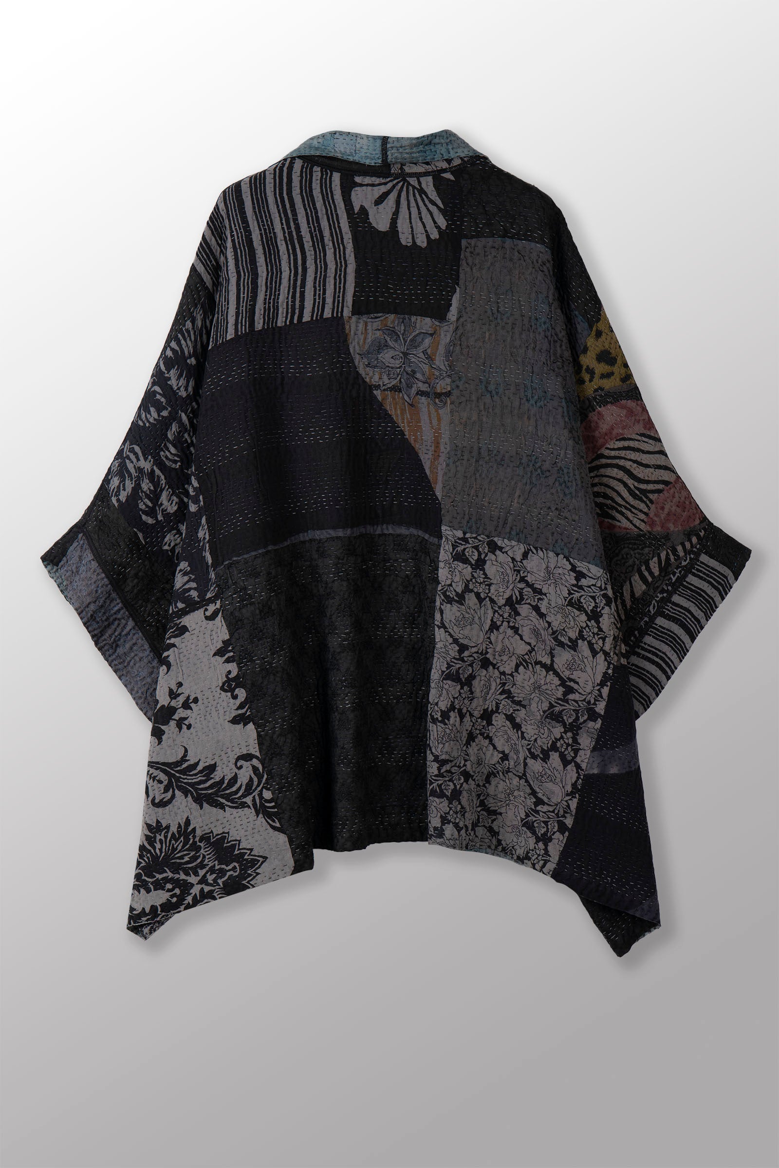 GEORGETTE JACQUARD VINTAGE SILK PATCH KANTHA DOUBLE COLLAR PONCHO - gj4323-blk -