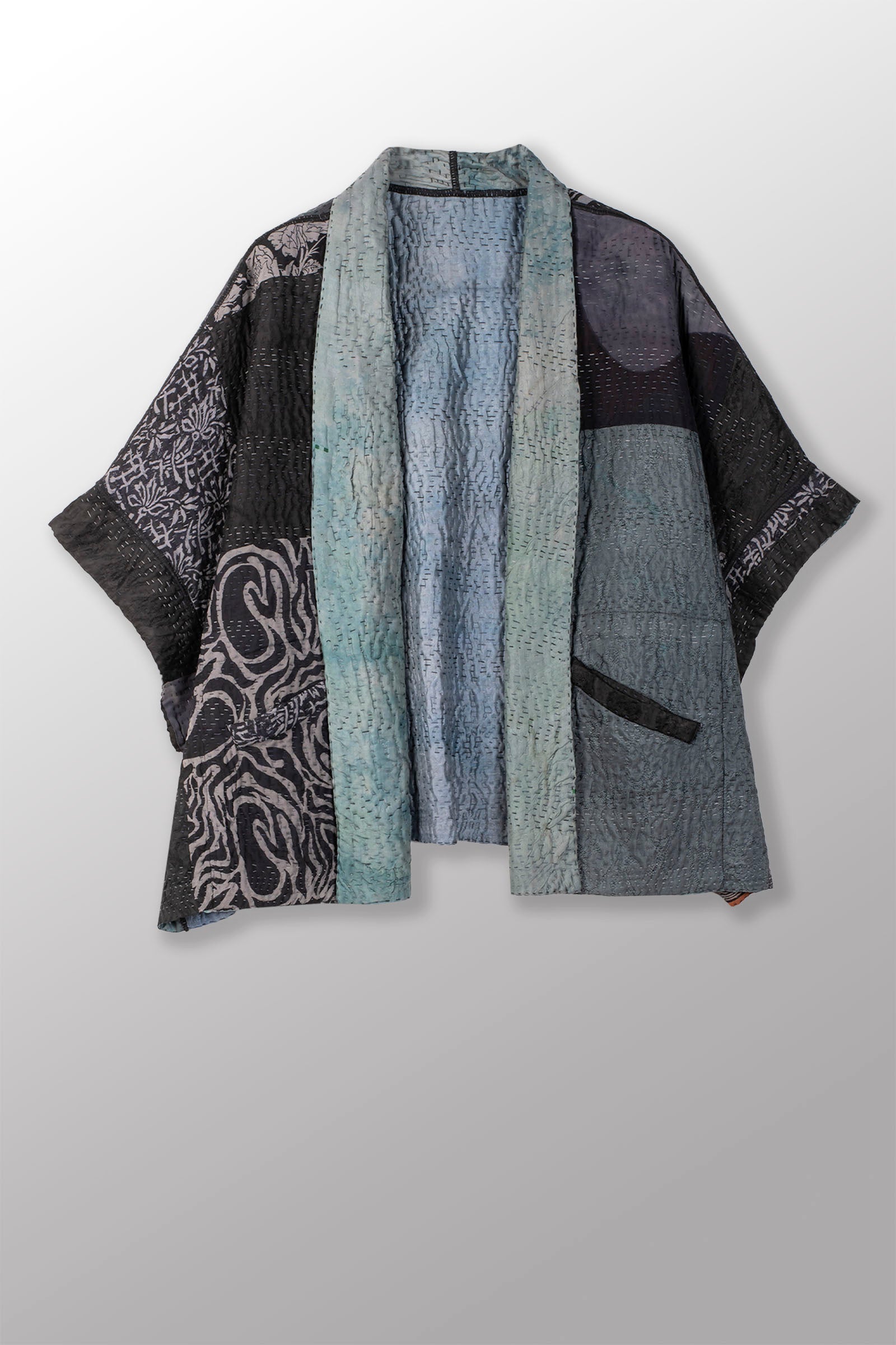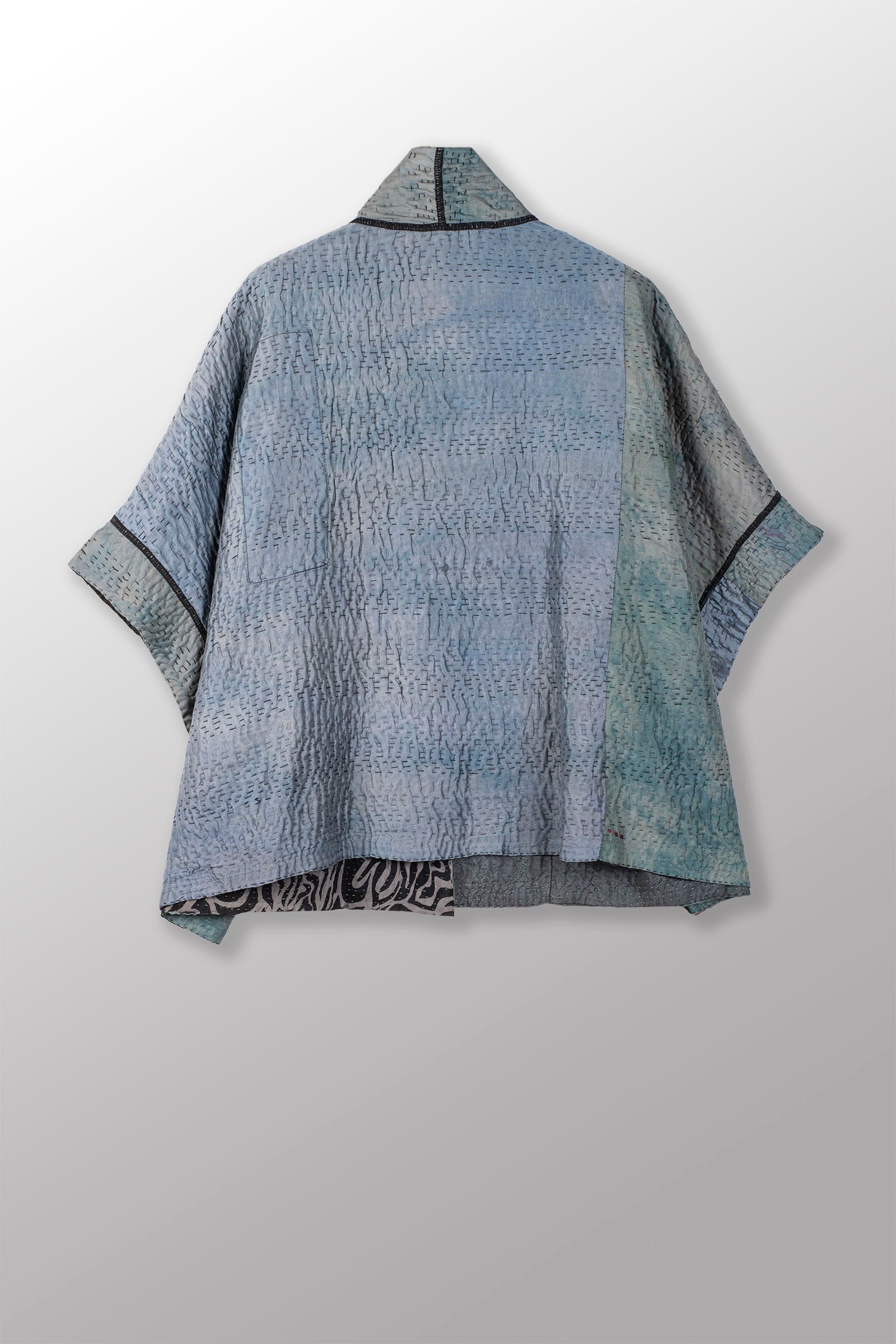 GEORGETTE JACQUARD VINTAGE SILK PATCH KANTHA MINI PONCHO - gj4060-blk -