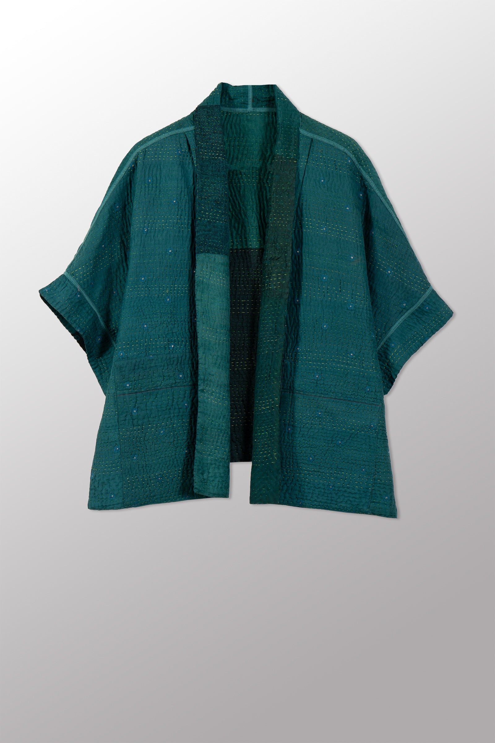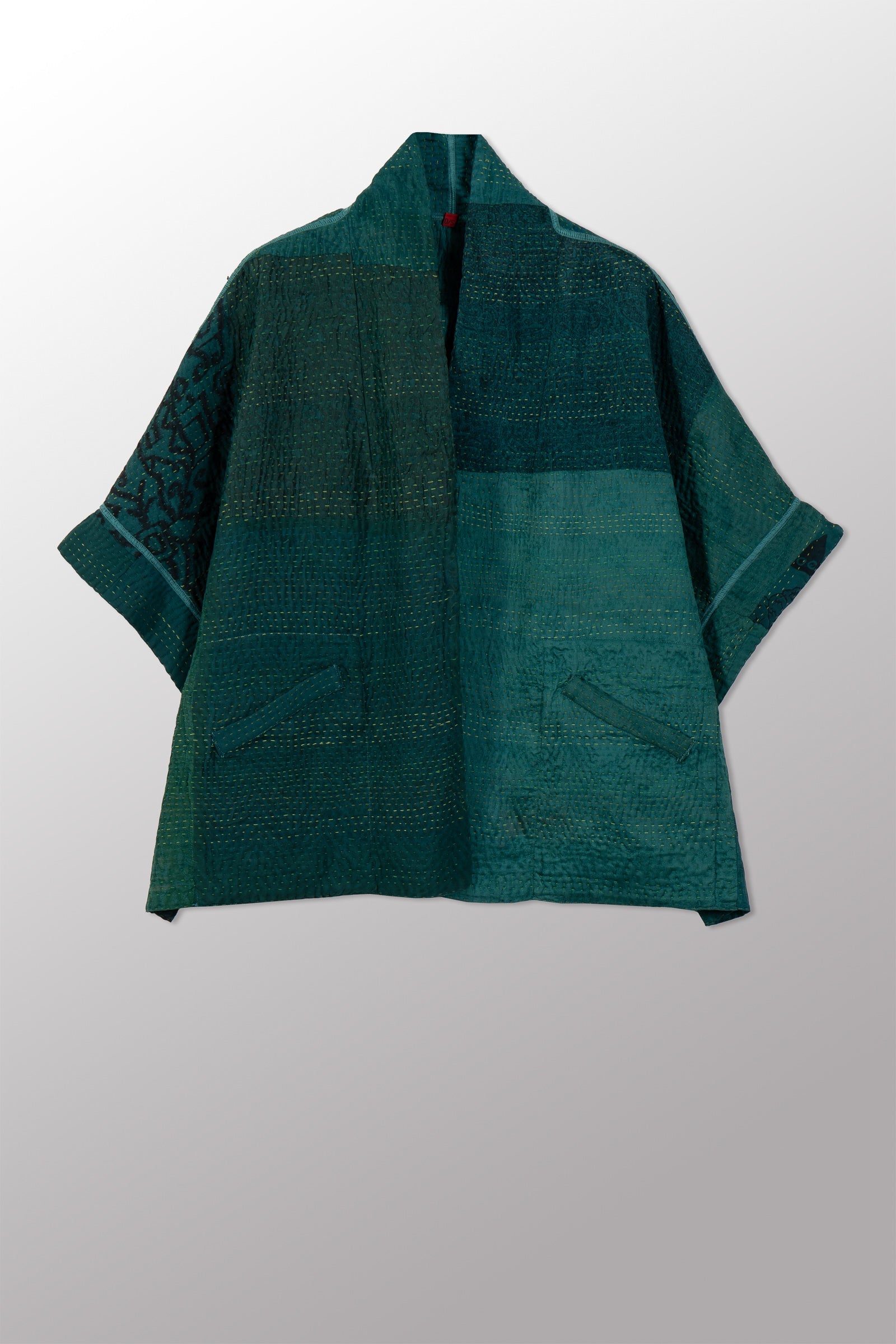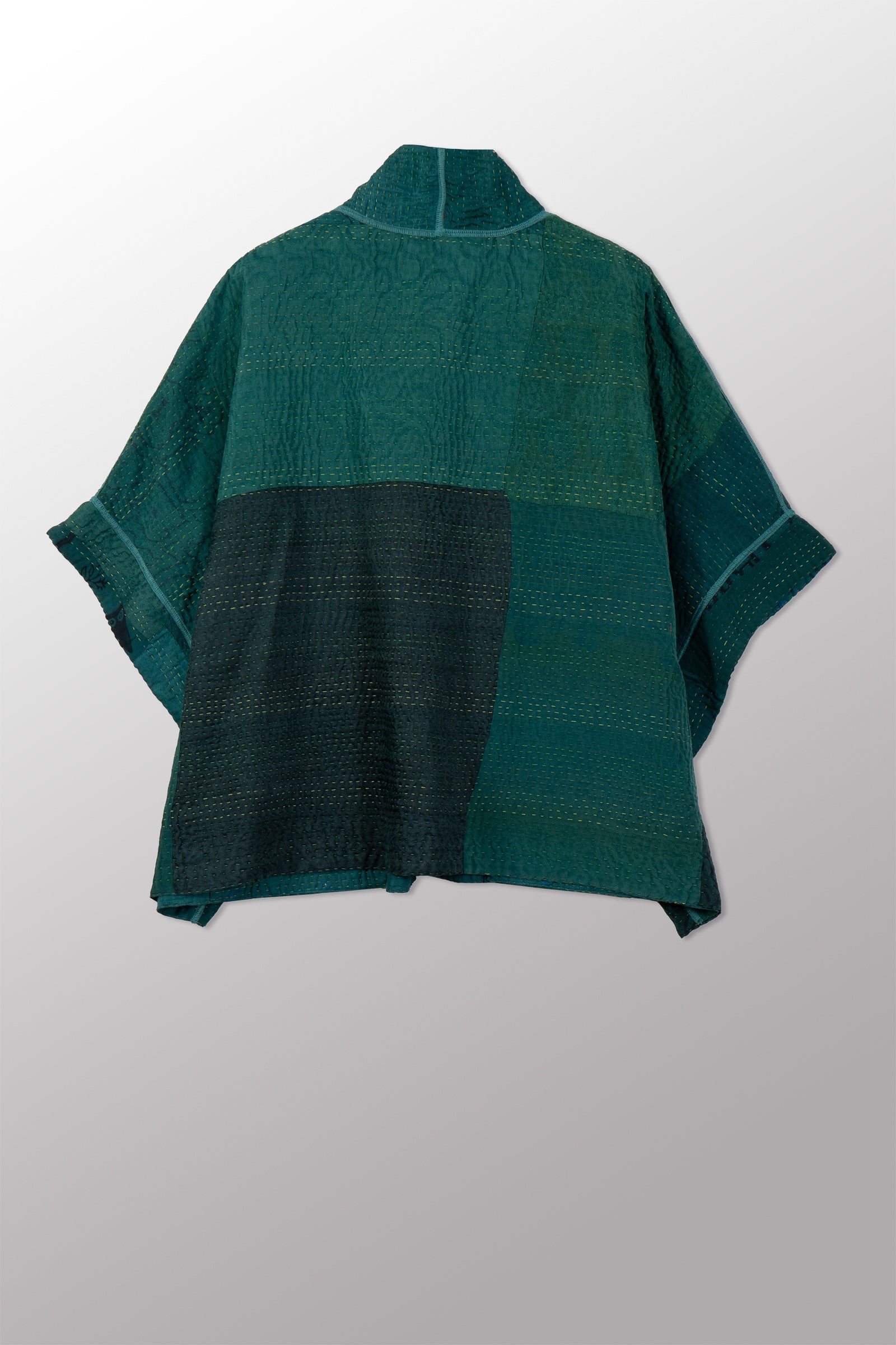 GEORGETTE JACQUARD VINTAGE SILK PATCH KANTHA MINI PONCHO - gj4060-grn -