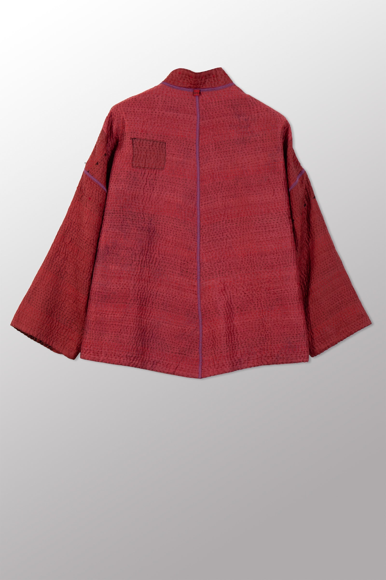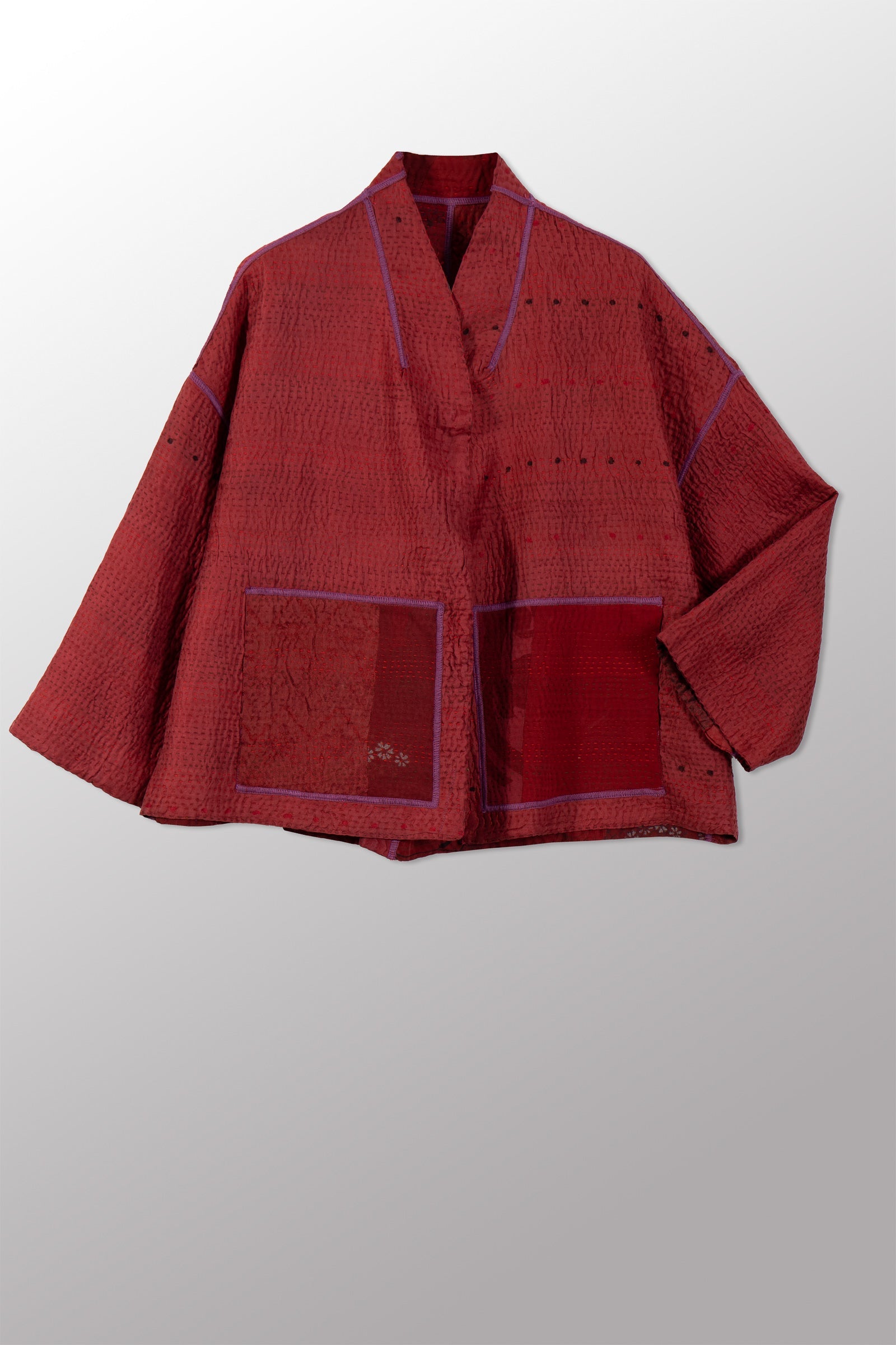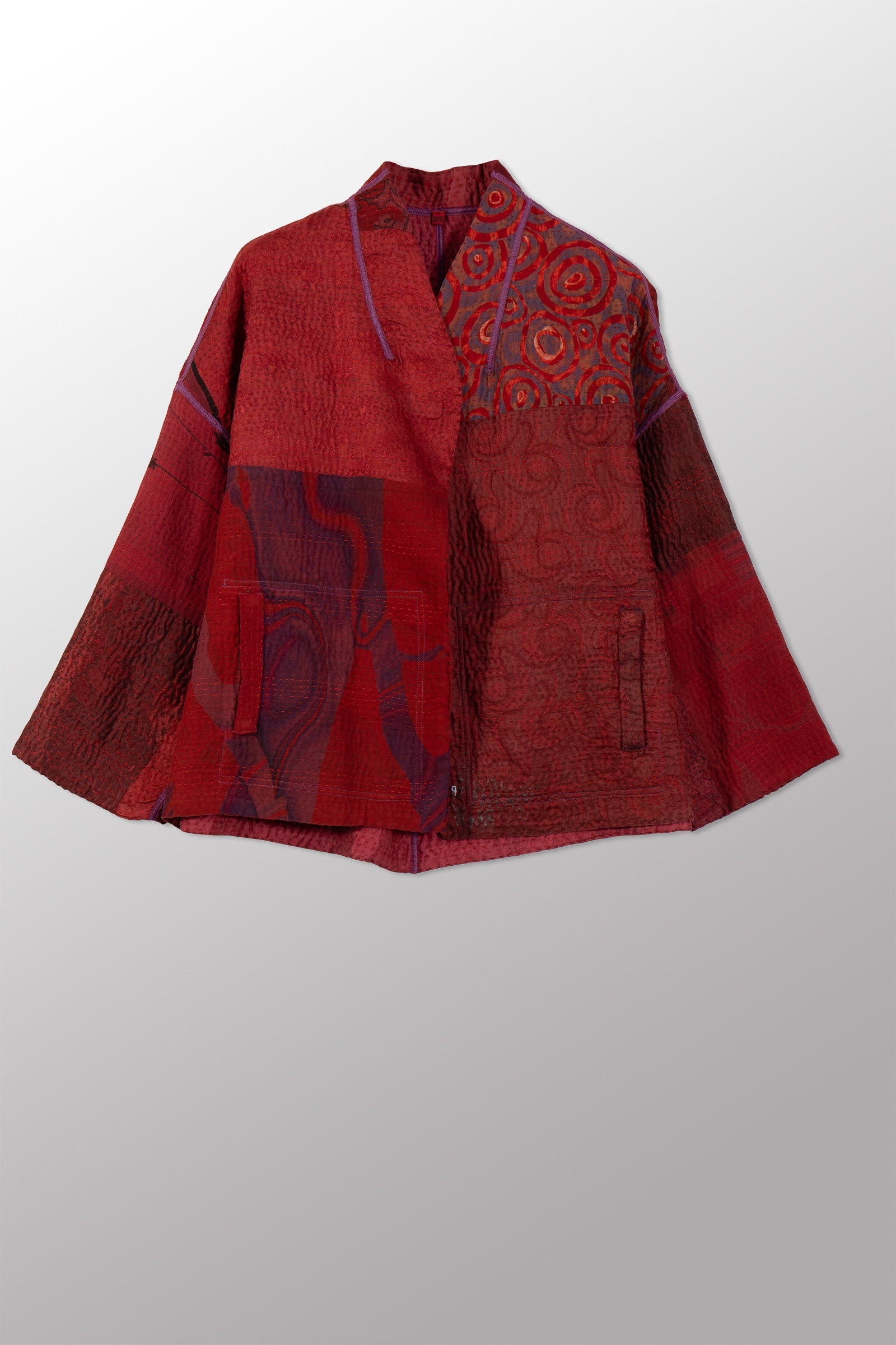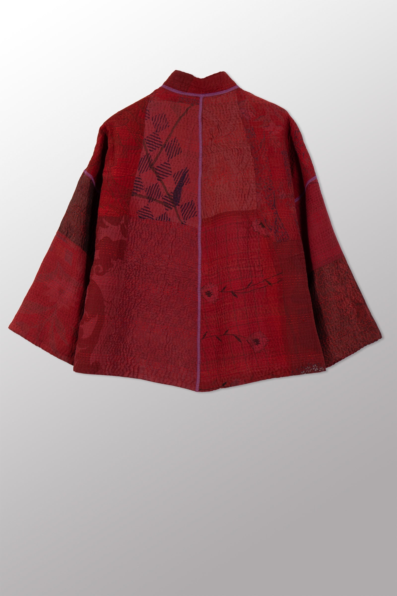 GEORGETTE JACQUARD VINTAGE SILK PATCH KANTHA STAND COLLAR CROPPED JACKET - gj4034-red -