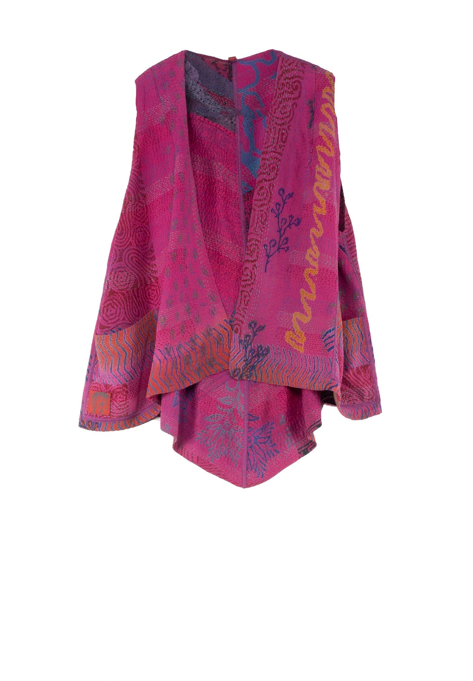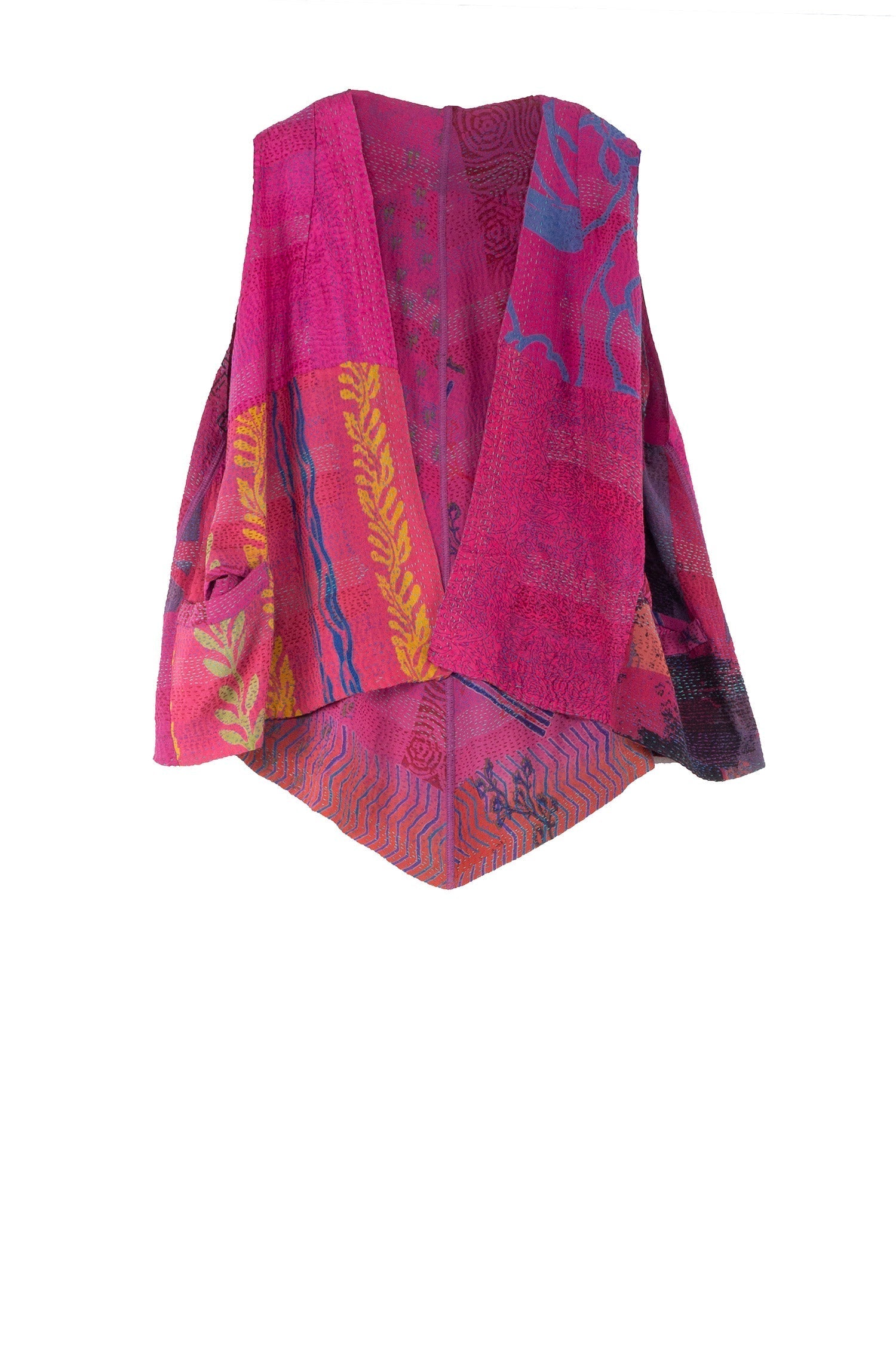 GEORGETTE VINTAGE SILK PATCH KANTHA BELL SHAPE SHORT VEST - gs2227-pik -