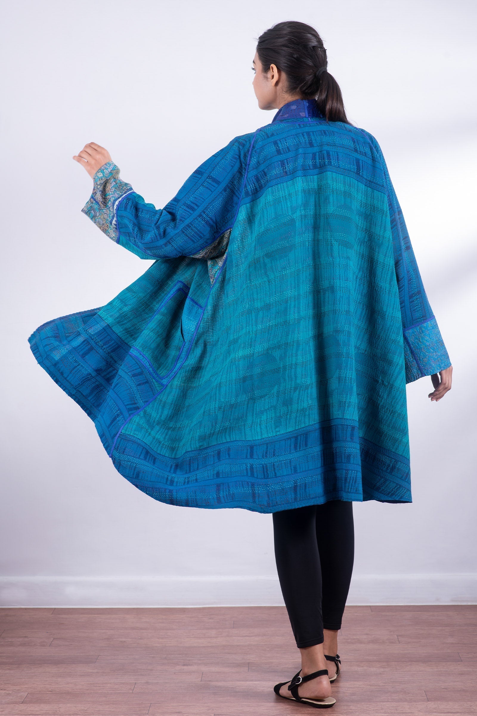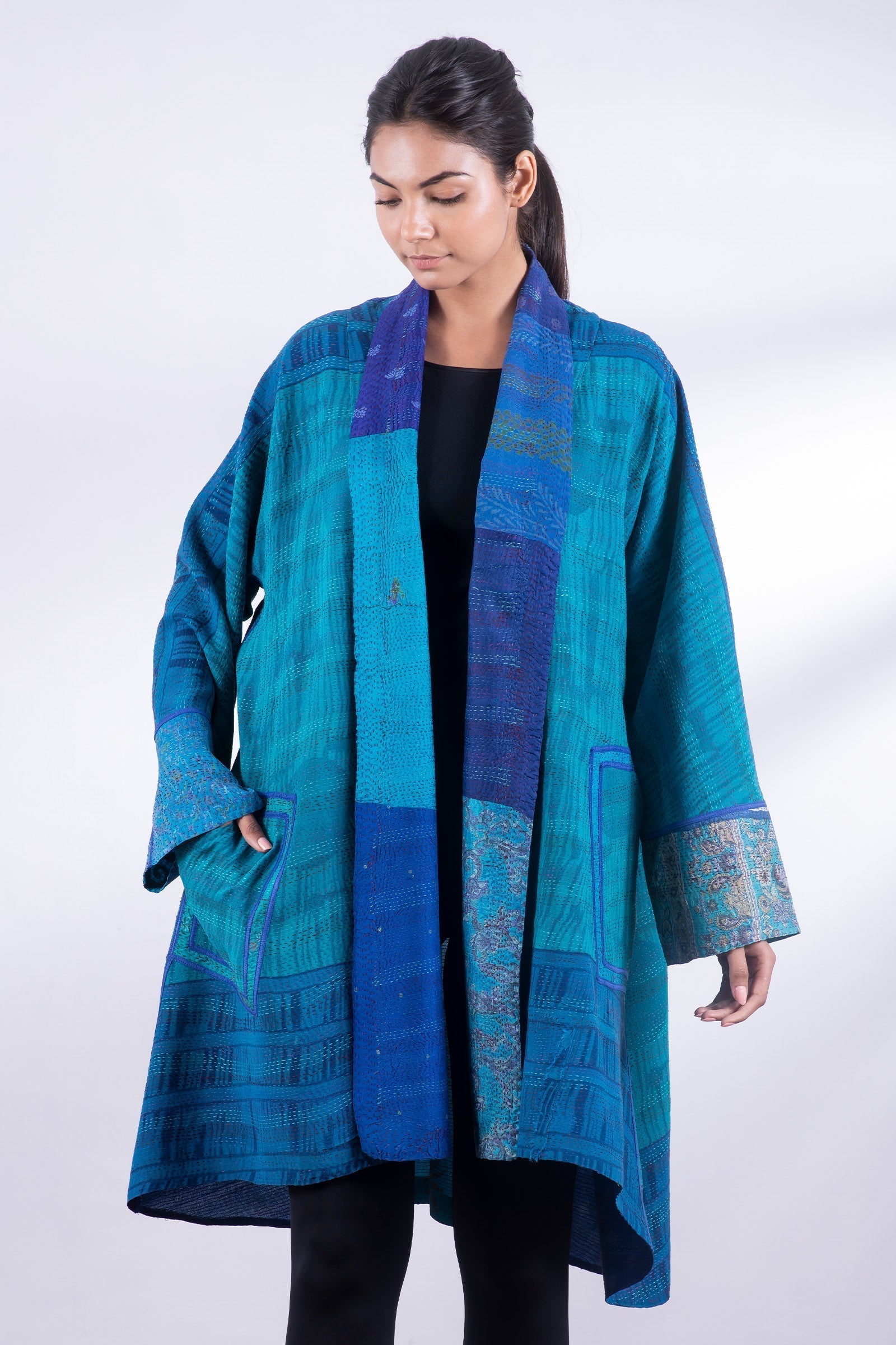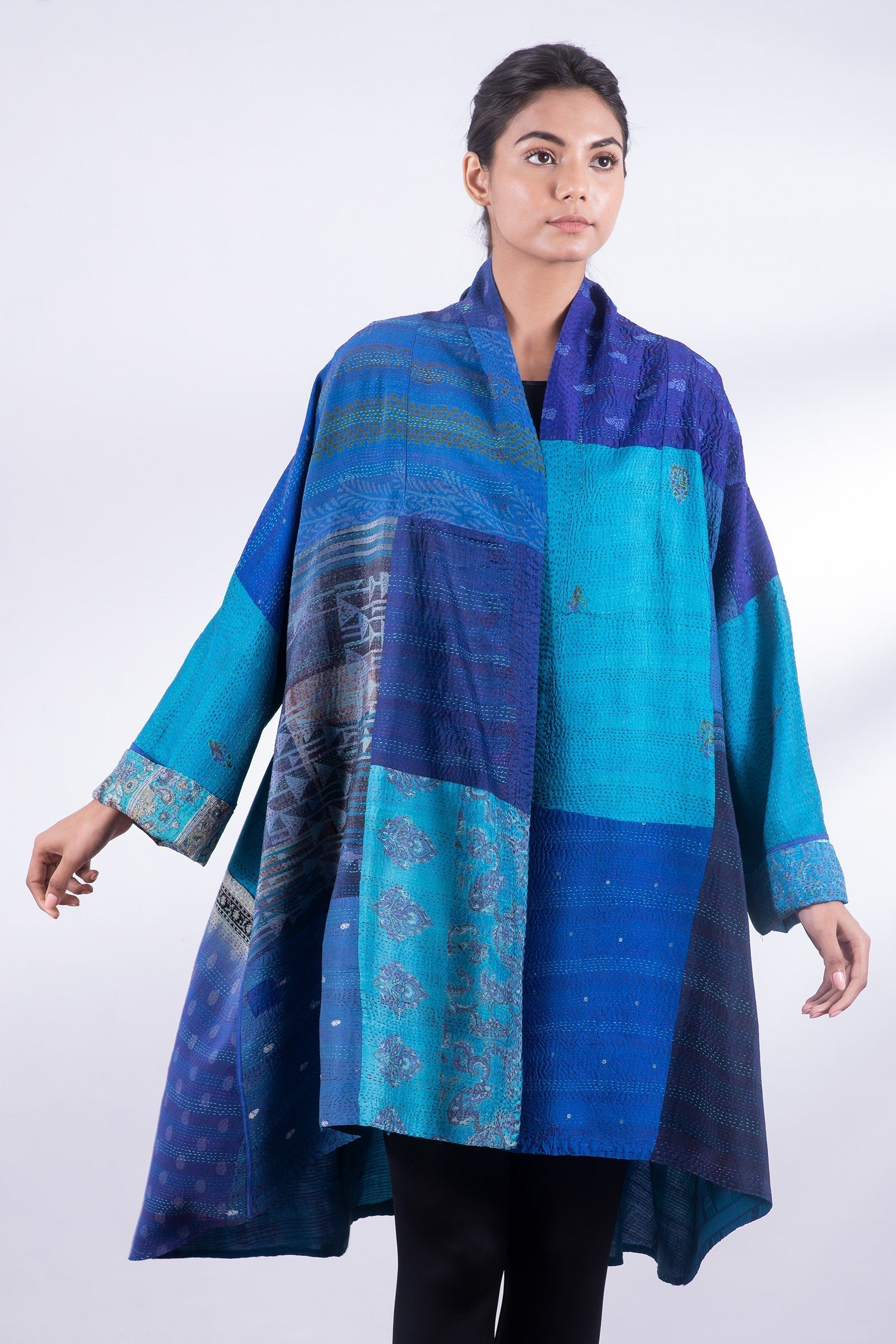 GEORGETTE VINTAGE SILK PATCH KANTHA KIMONO LONG JKT - gs2005-blu -