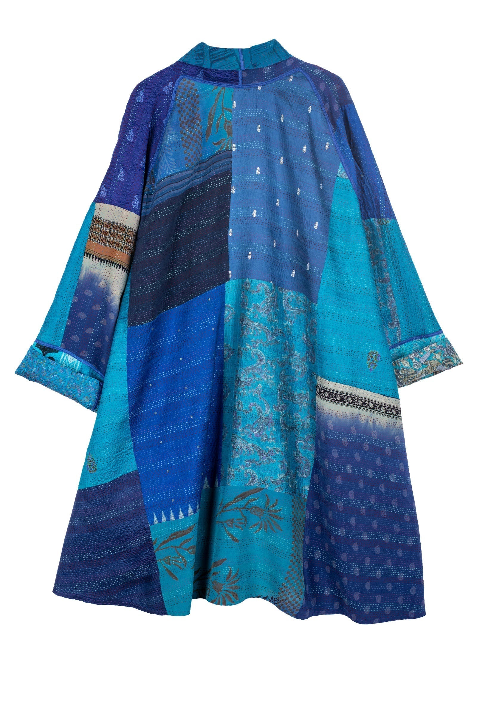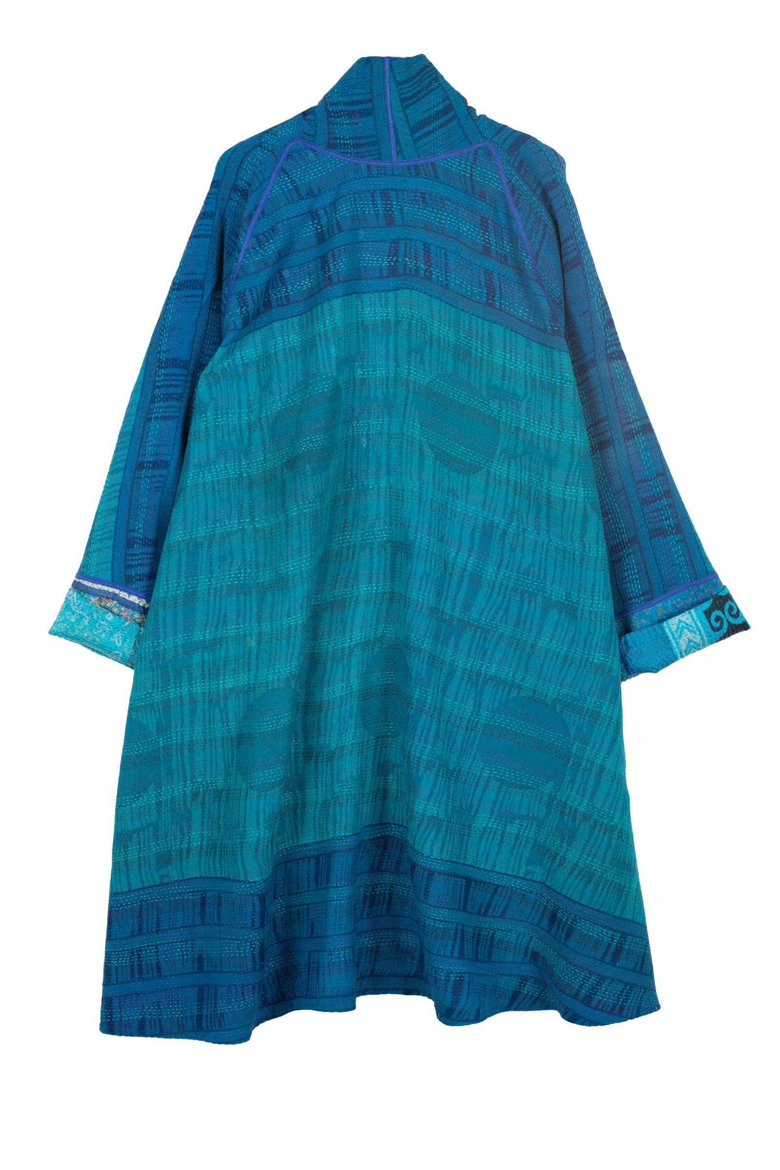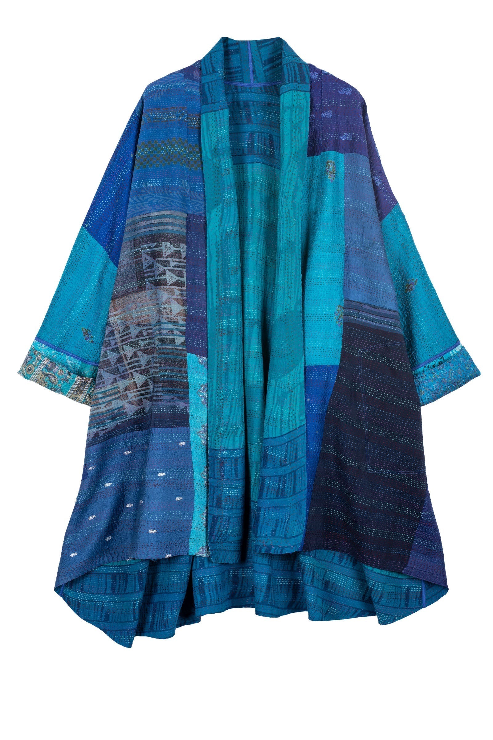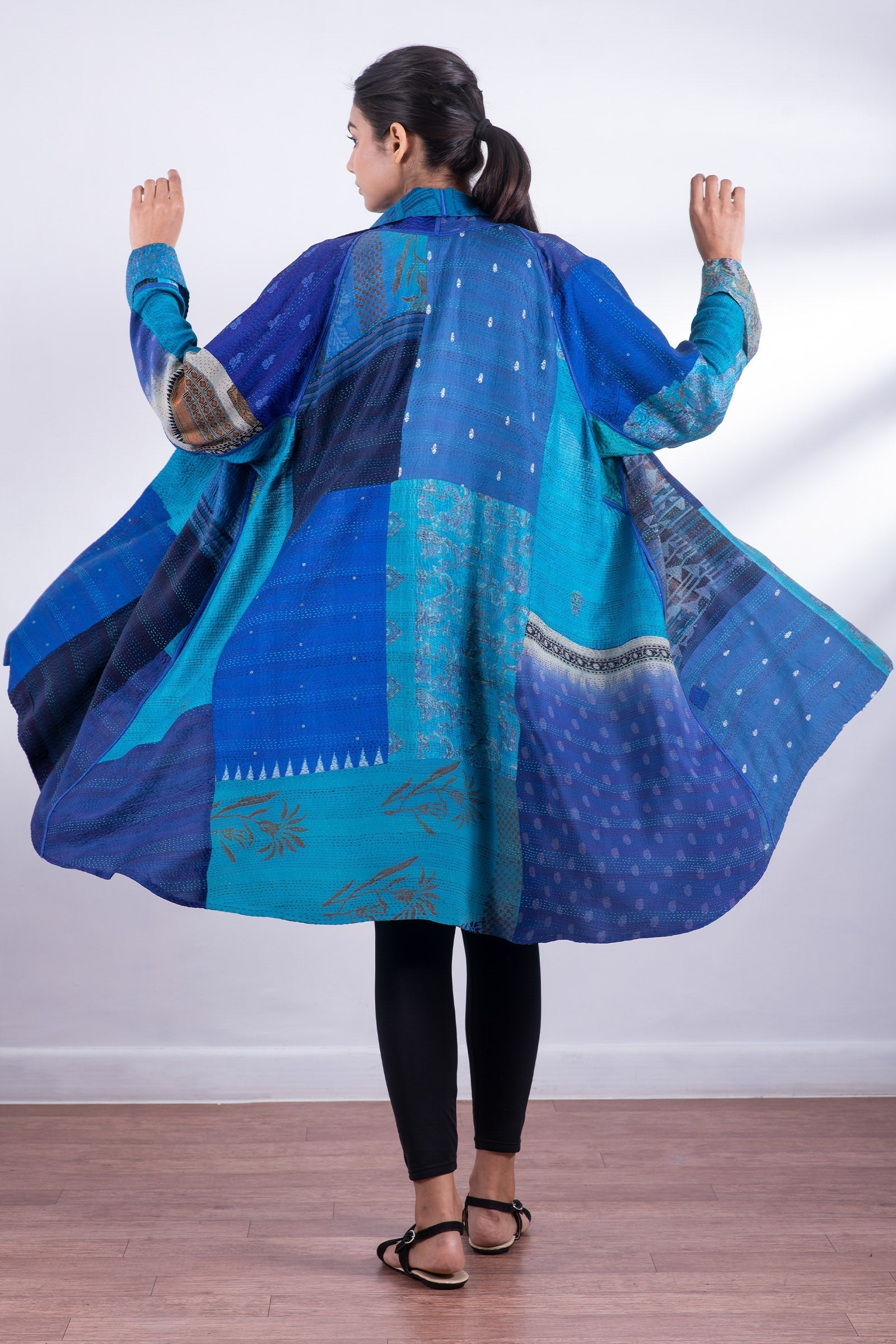 GEORGETTE VINTAGE SILK PATCH KANTHA KIMONO LONG JKT - gs2005-blu -