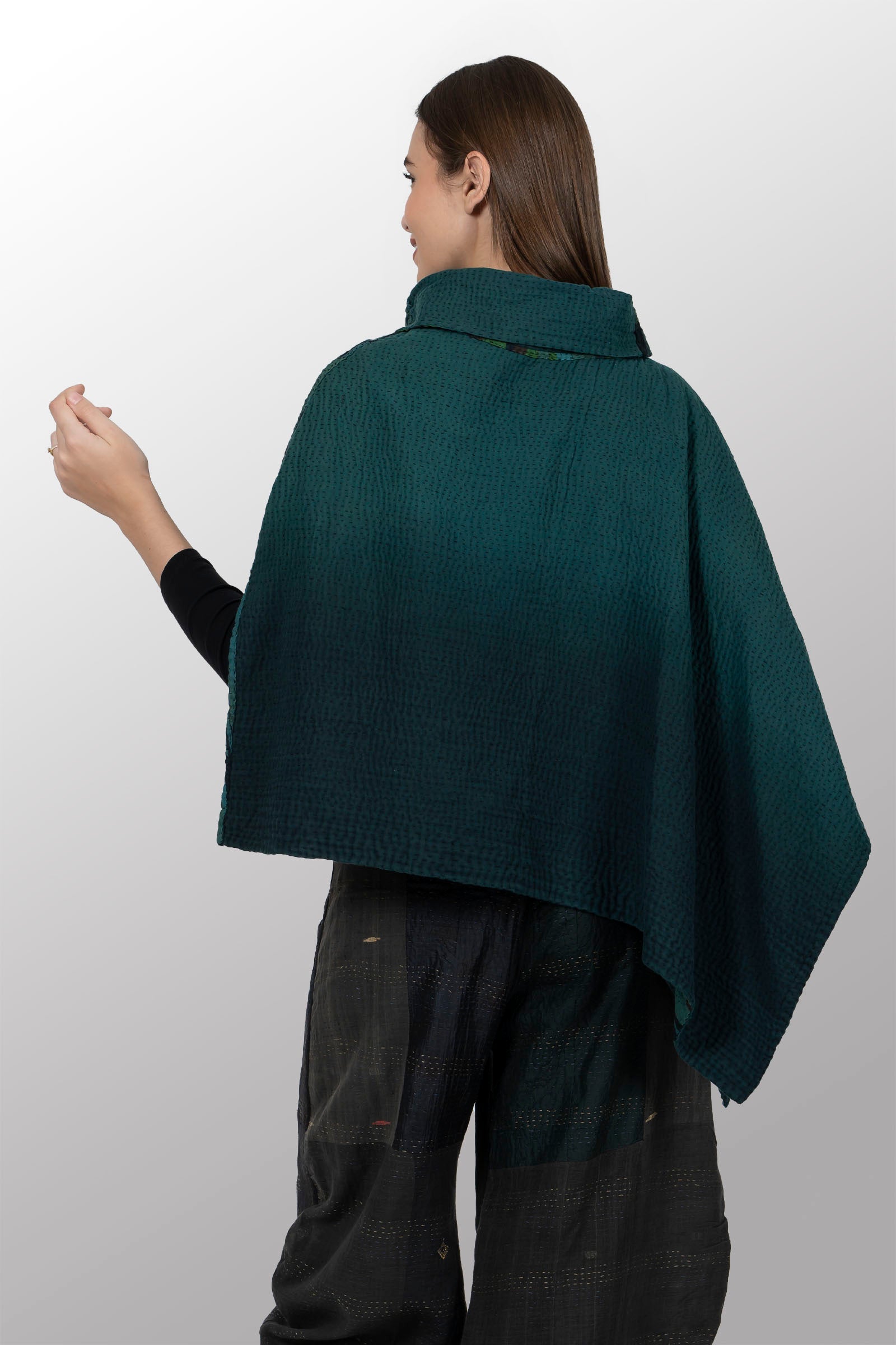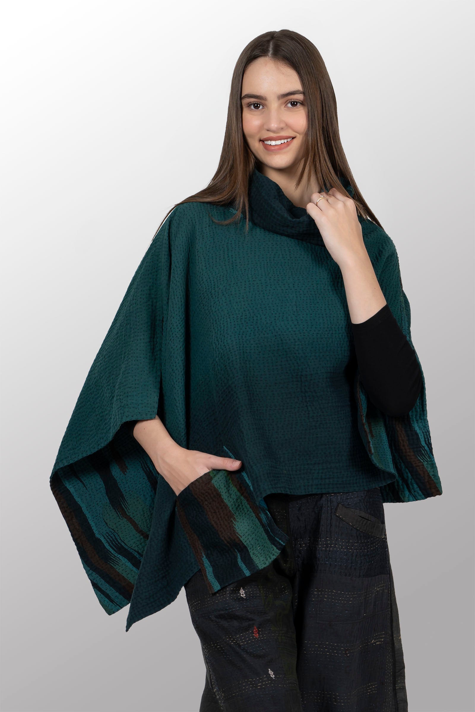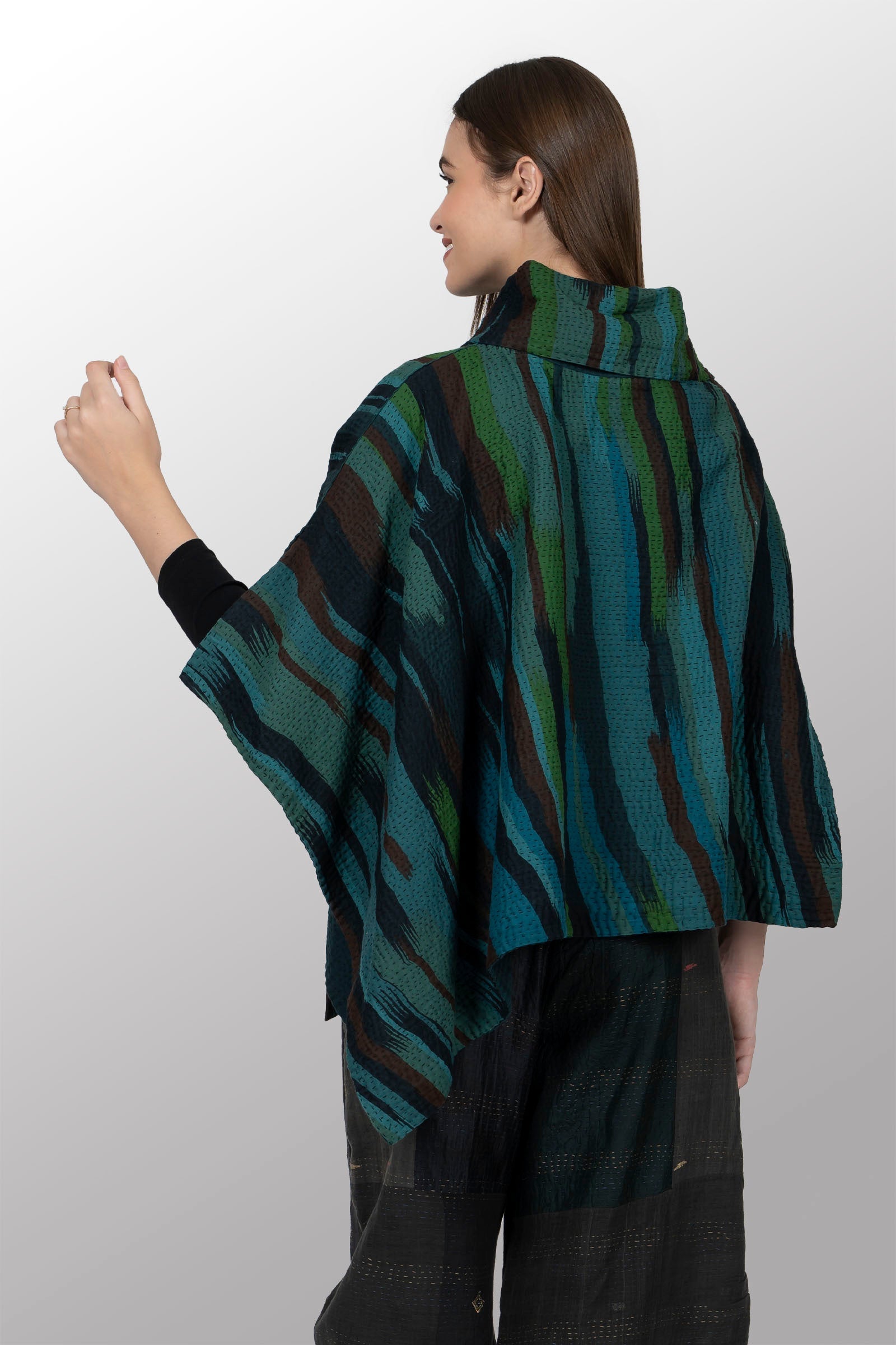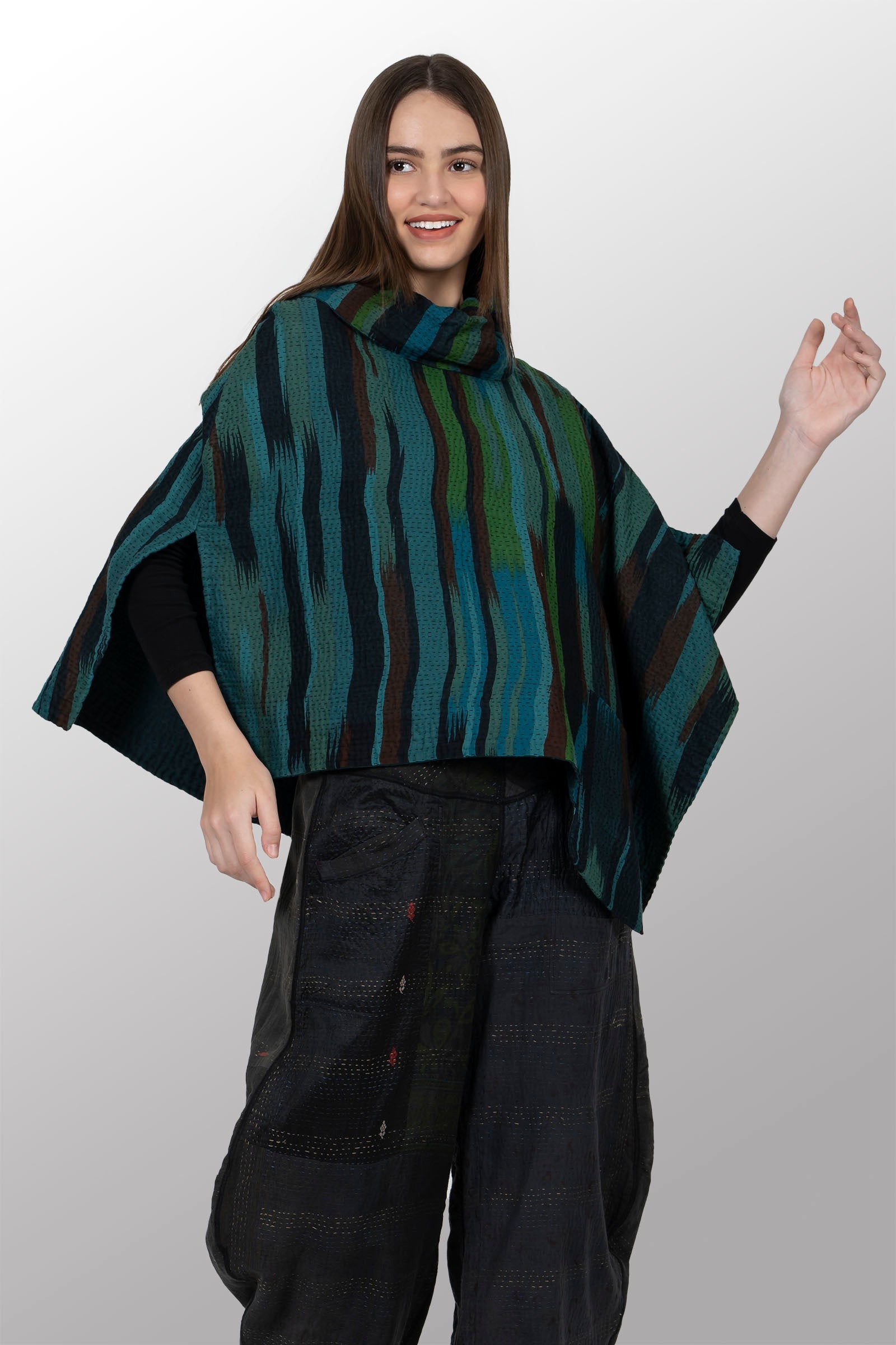 IKAT STRIPE KANTHA COWL NECK LONG CAPE - is4842-trq -