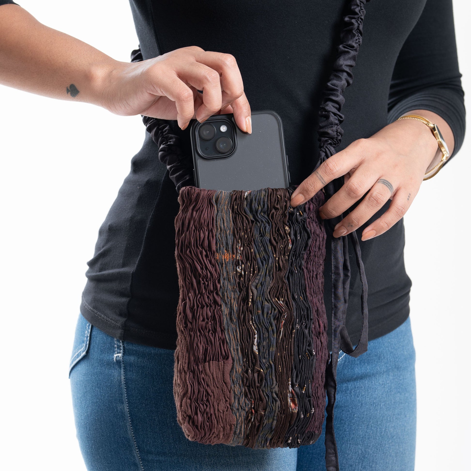 The Maison Mieko iPhone Bag Brown is more than a phone wallet, it's a stylish accessory that embraces the brand's dedication to sustainability and the empowerment of women artisans across India. Crafted from responsibly sourced materials, this bag is a symbol of the brand's commitment to a slower, more conscious approach to fashion. With Maison Mieko, you're not just buying a product, you're supporting a brand where Vintage comes back to life.