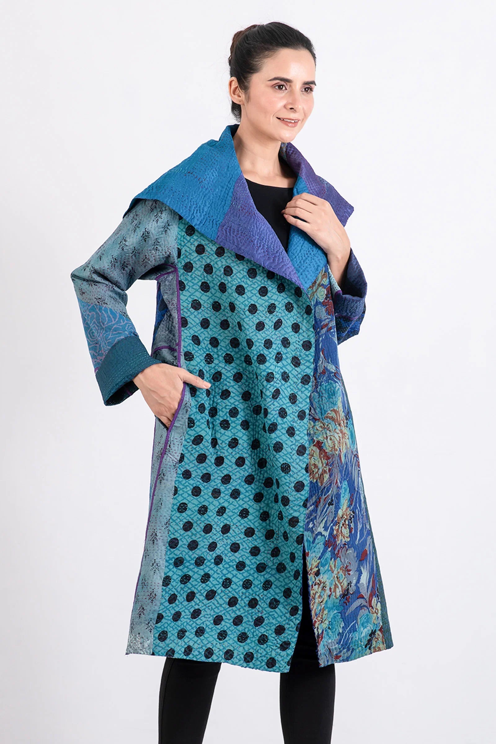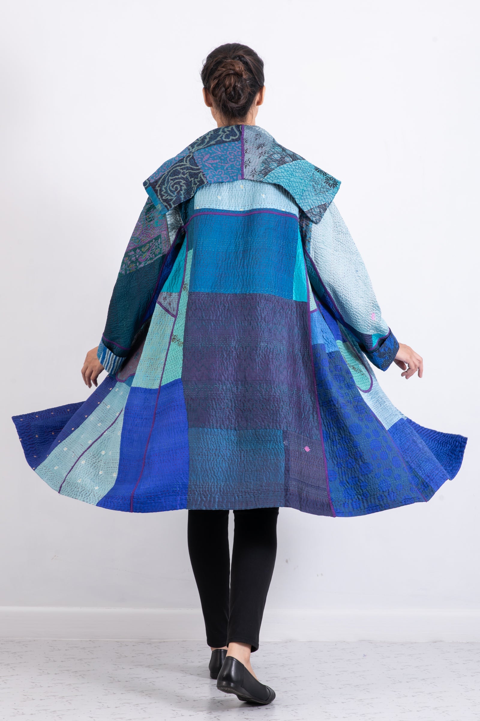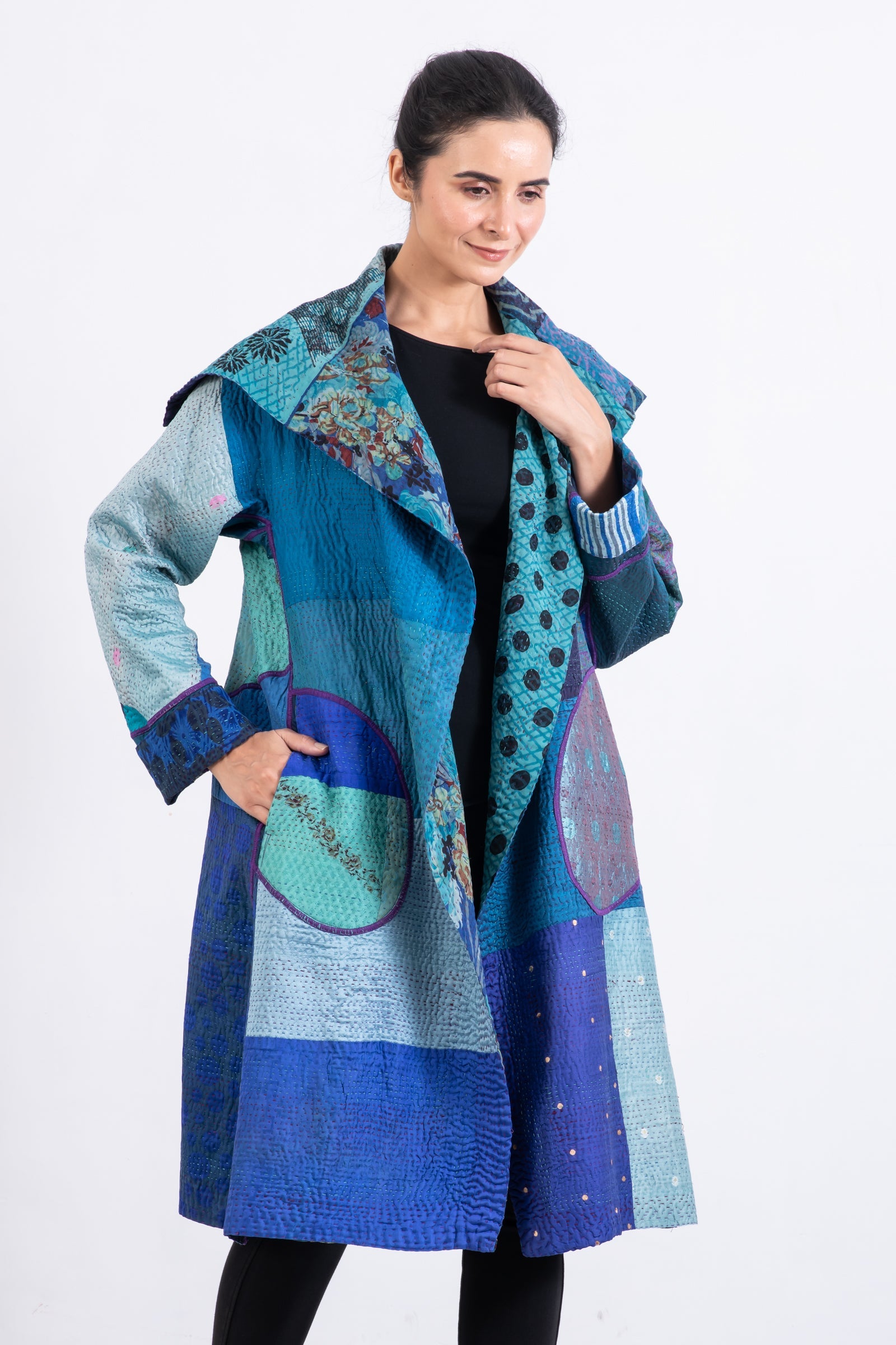 JACQUARD SILK KANTHA A-LINE COAT - js4309-blu -