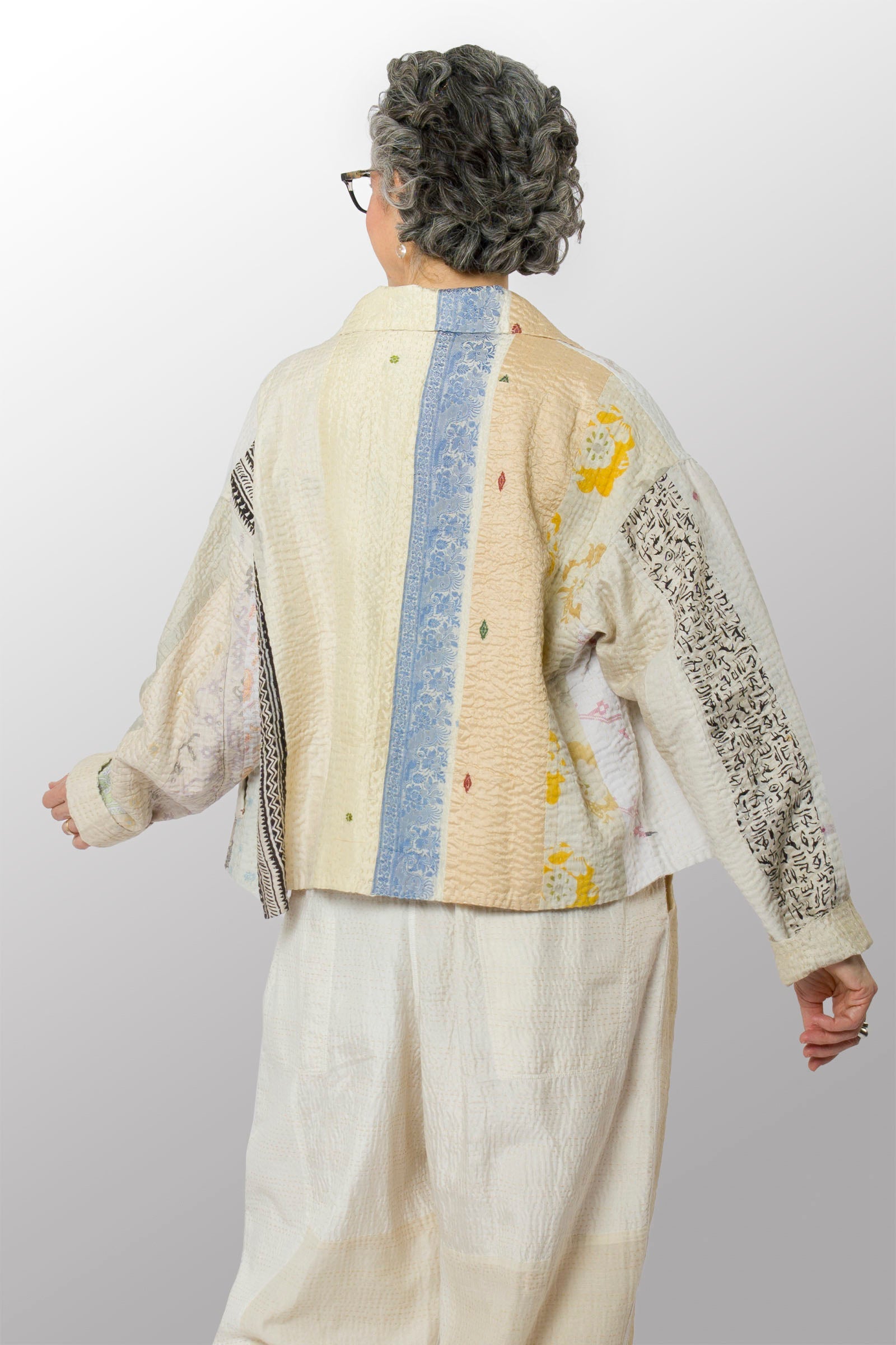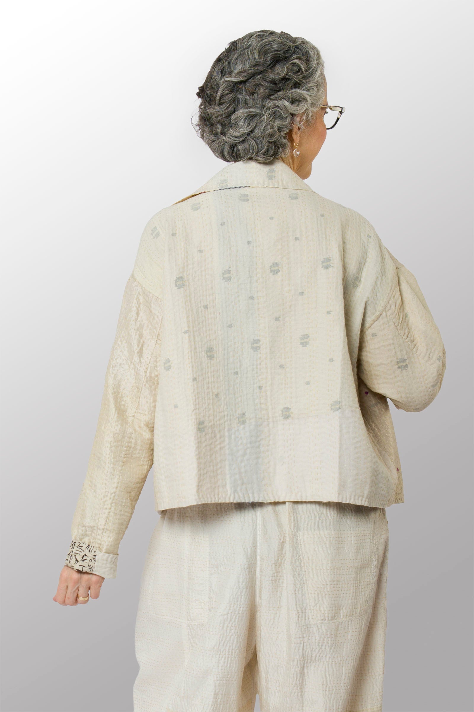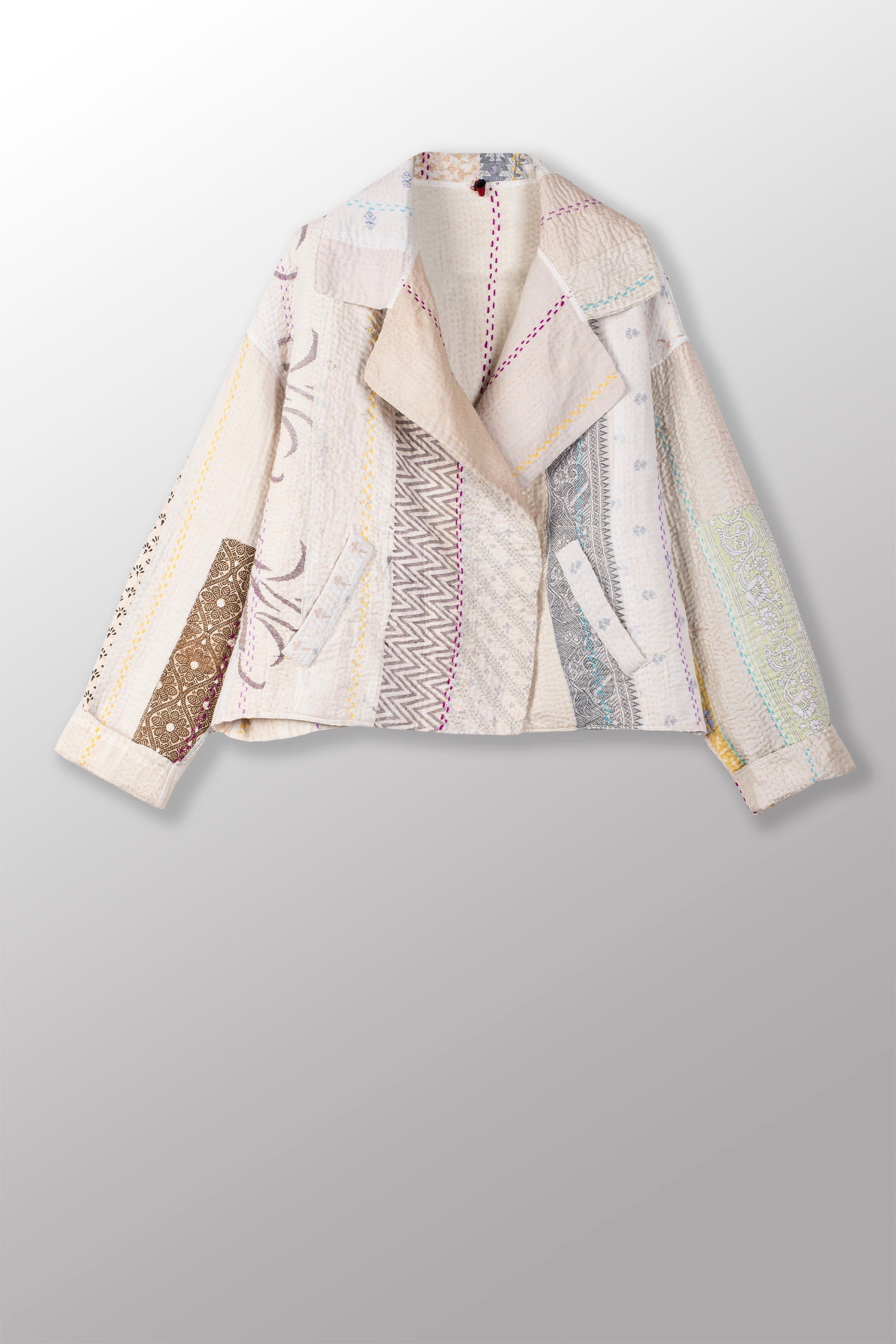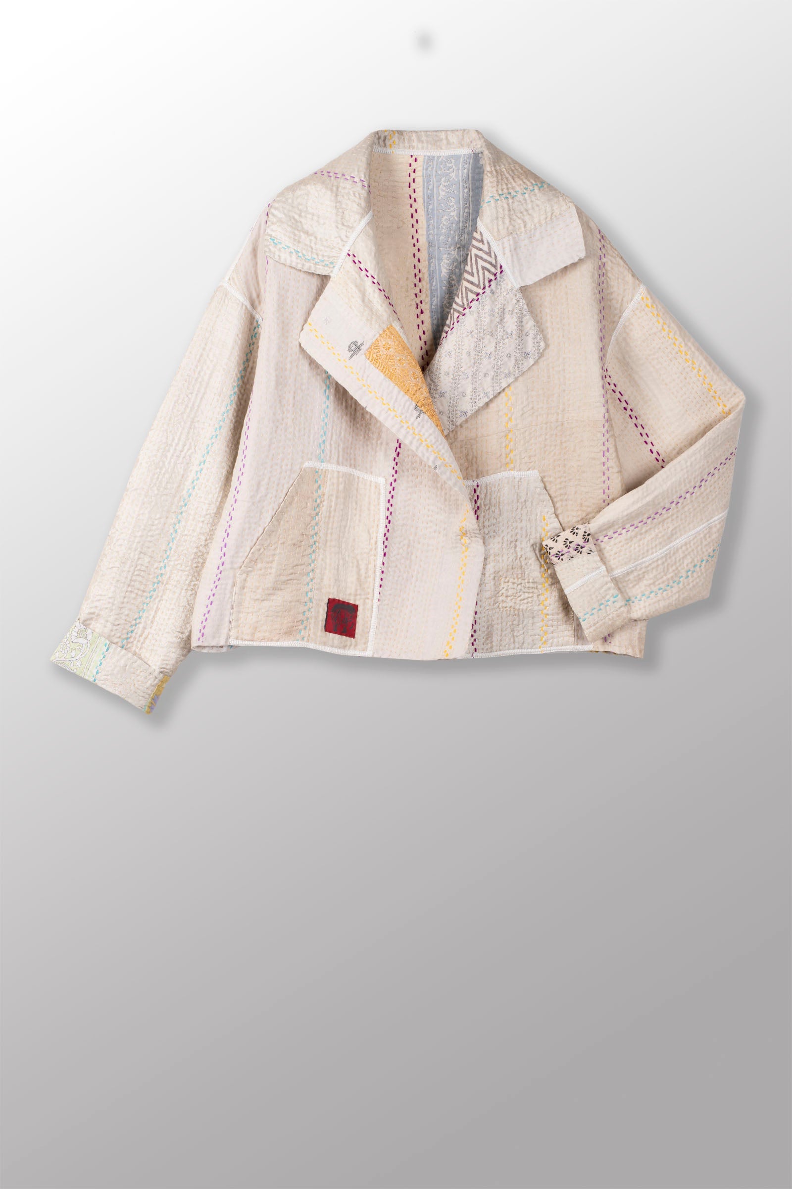 JEWEL WOVEN WITH VERTICAL PATCH KANTHA LAPELED SHORT JACKET - jv4081-ivy -