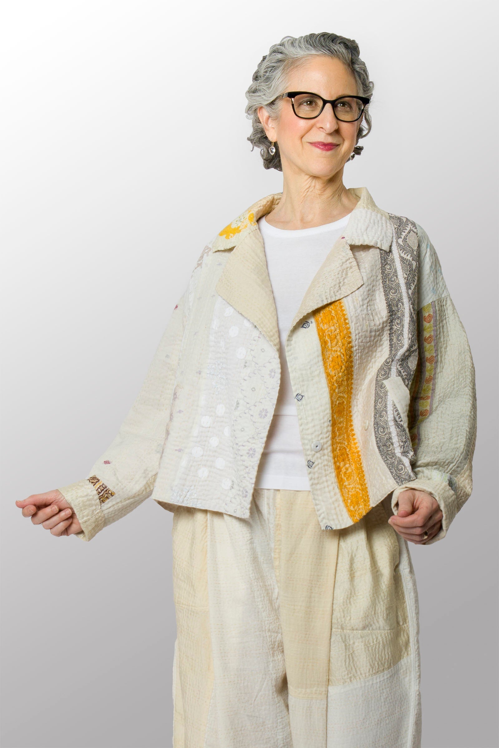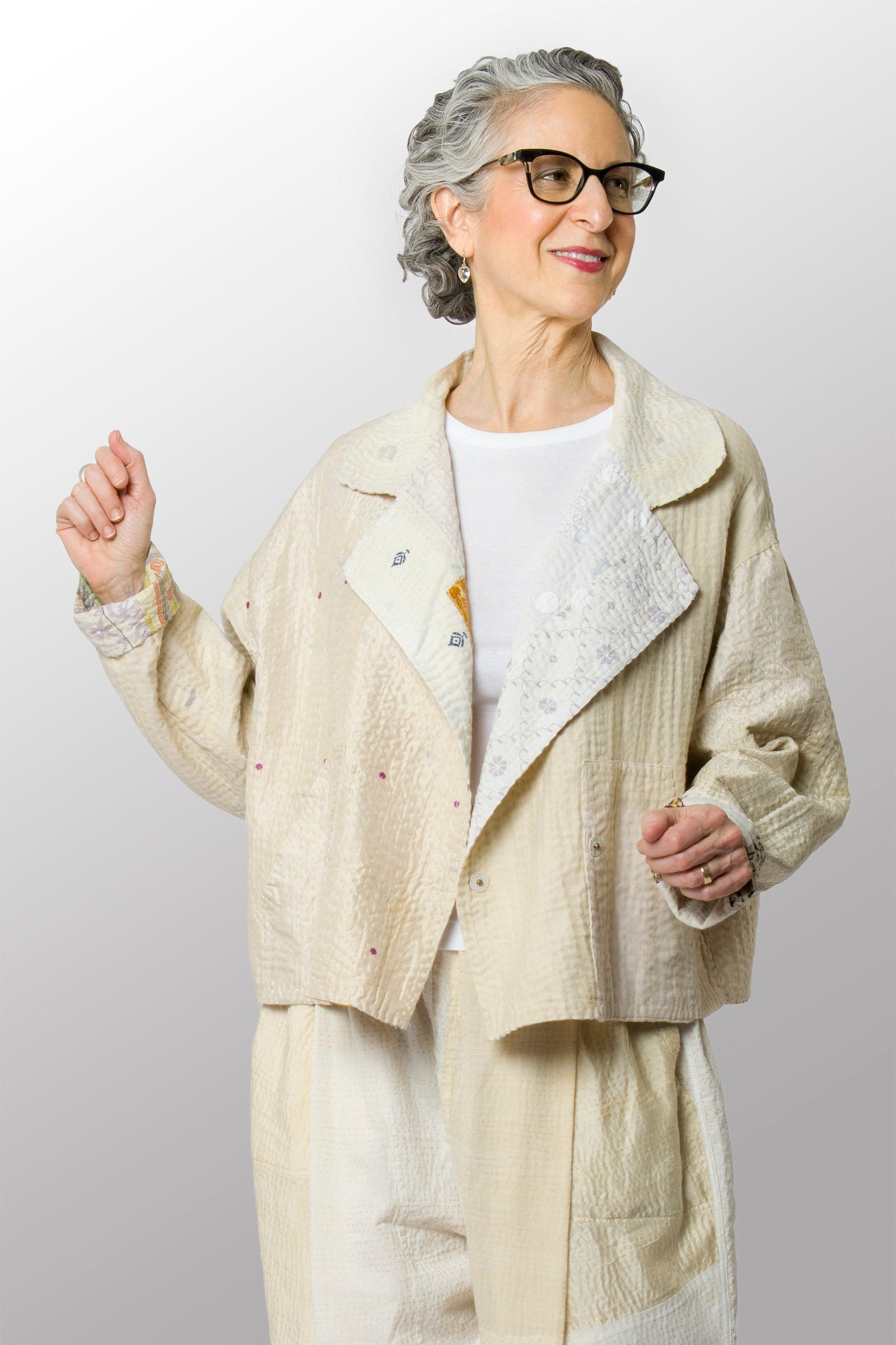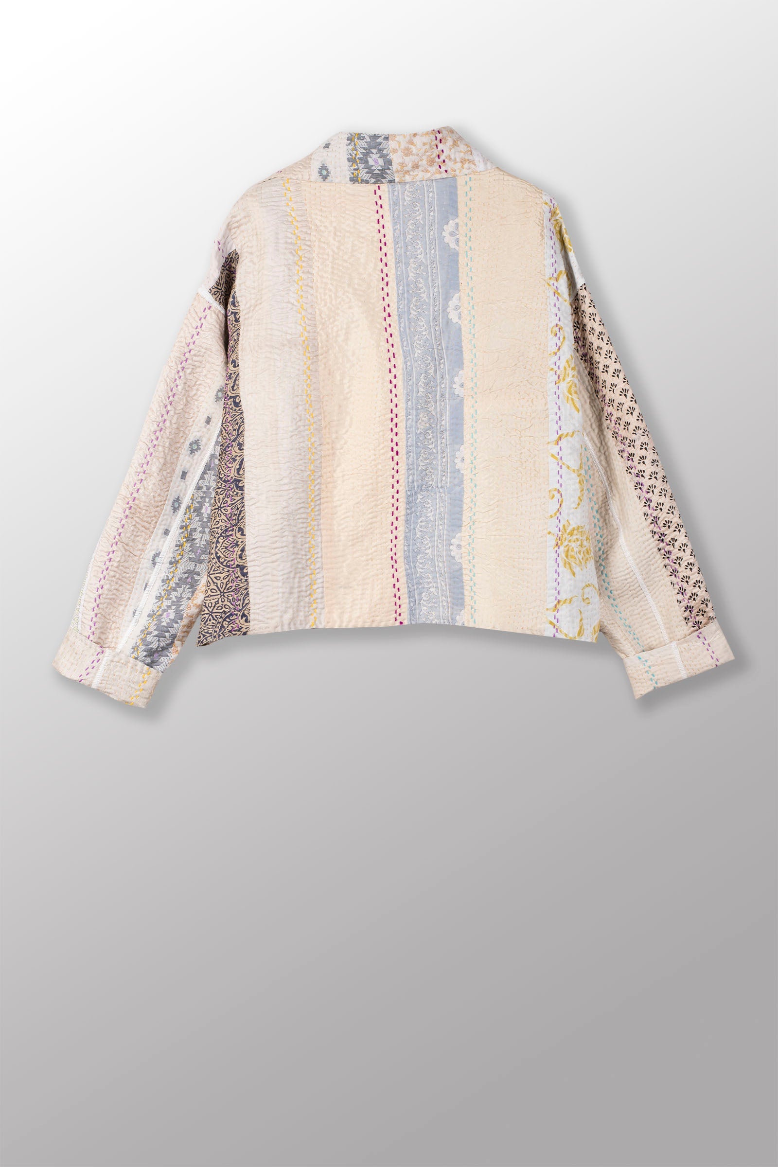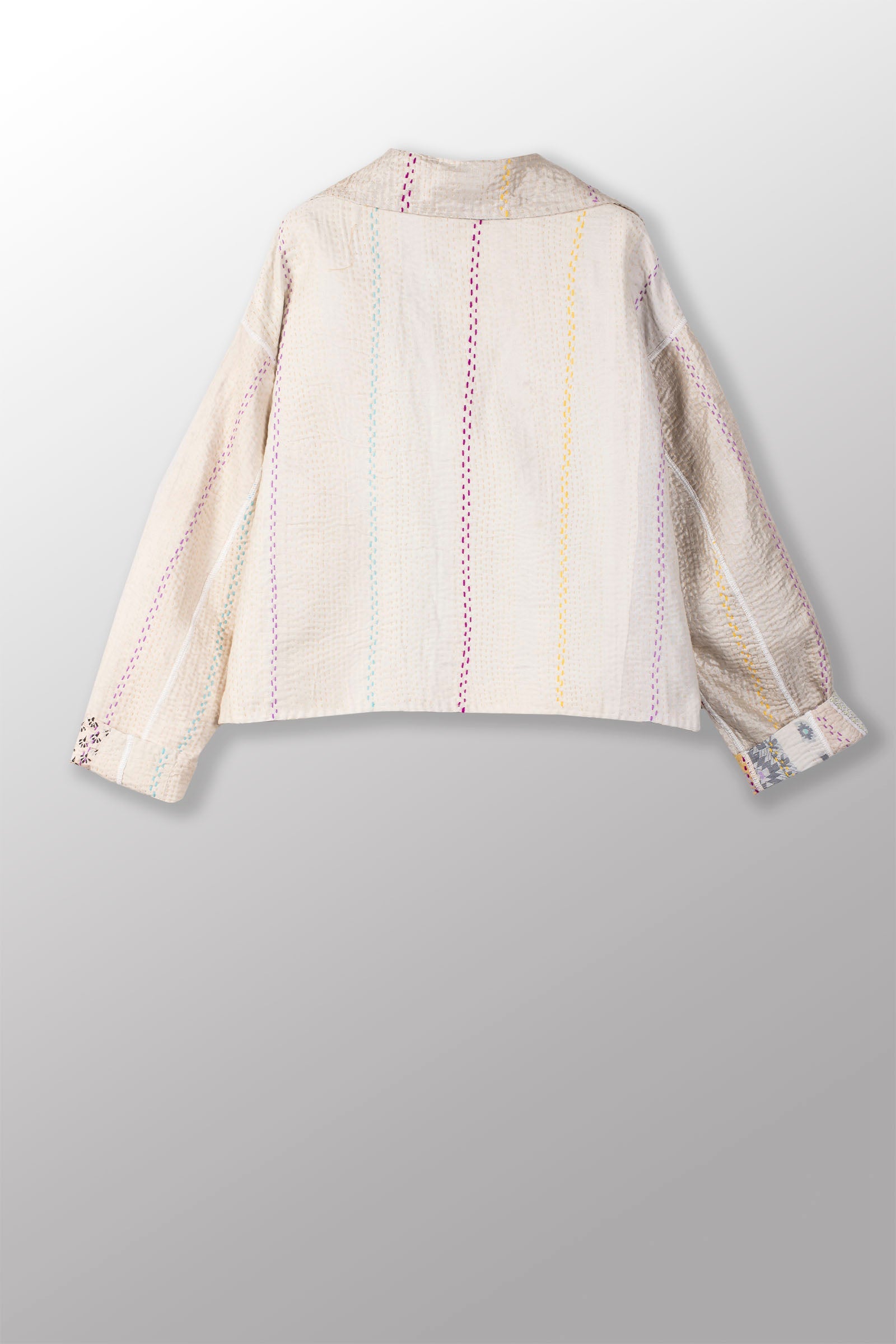 JEWEL WOVEN WITH VERTICAL PATCH KANTHA LAPELED SHORT JACKET - jv4081-ivy -