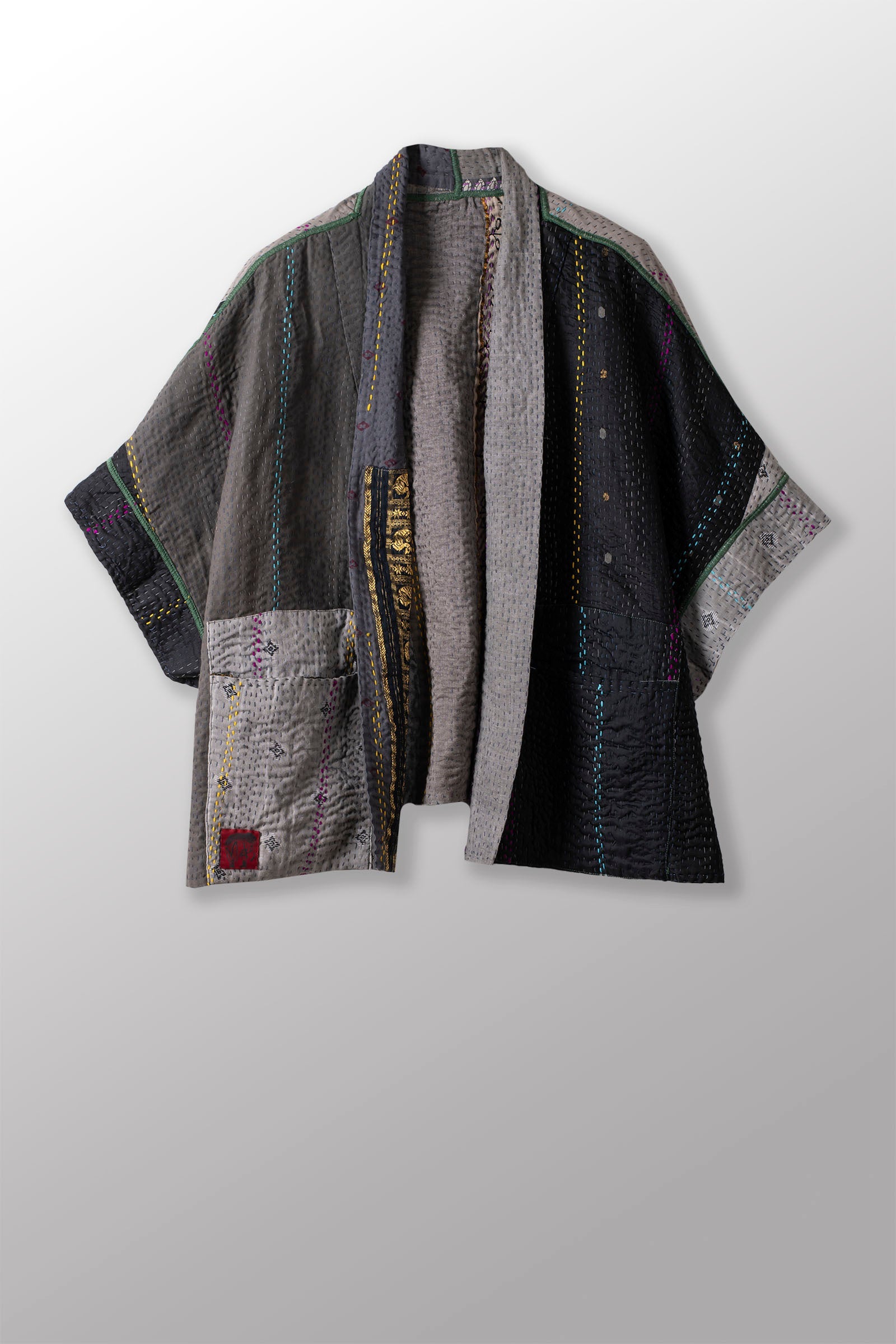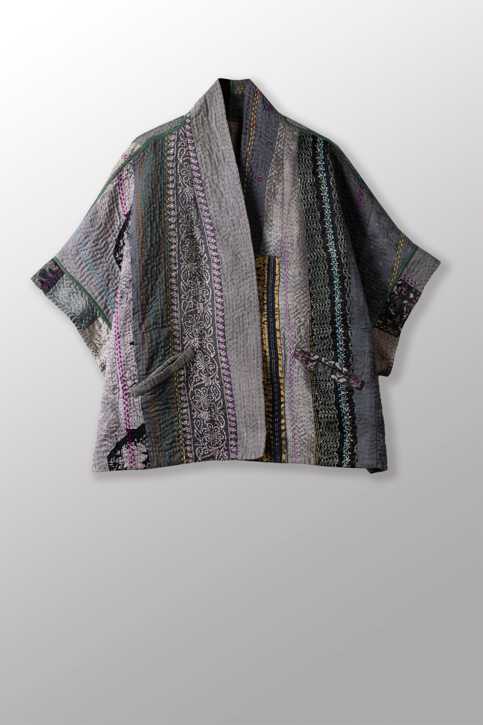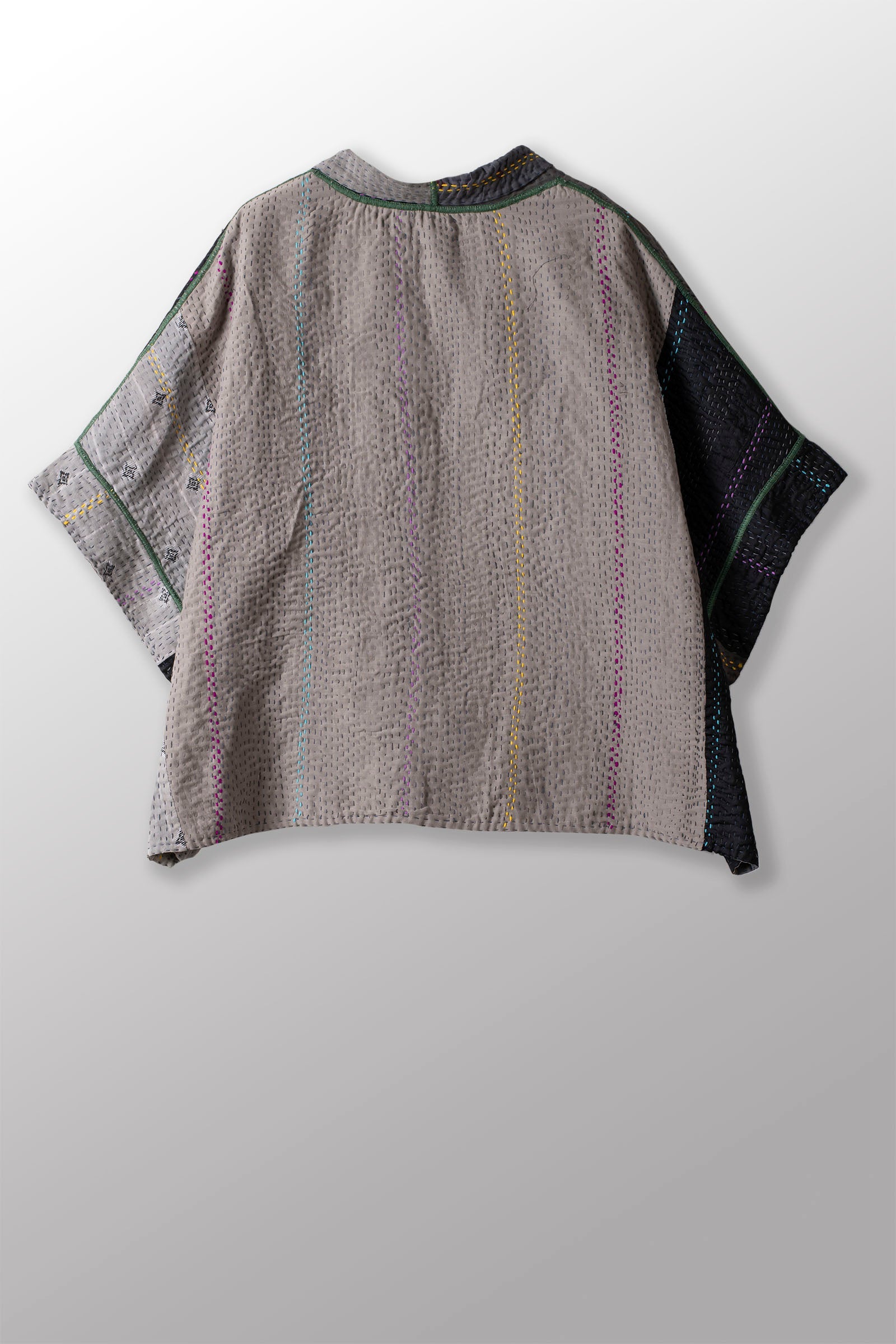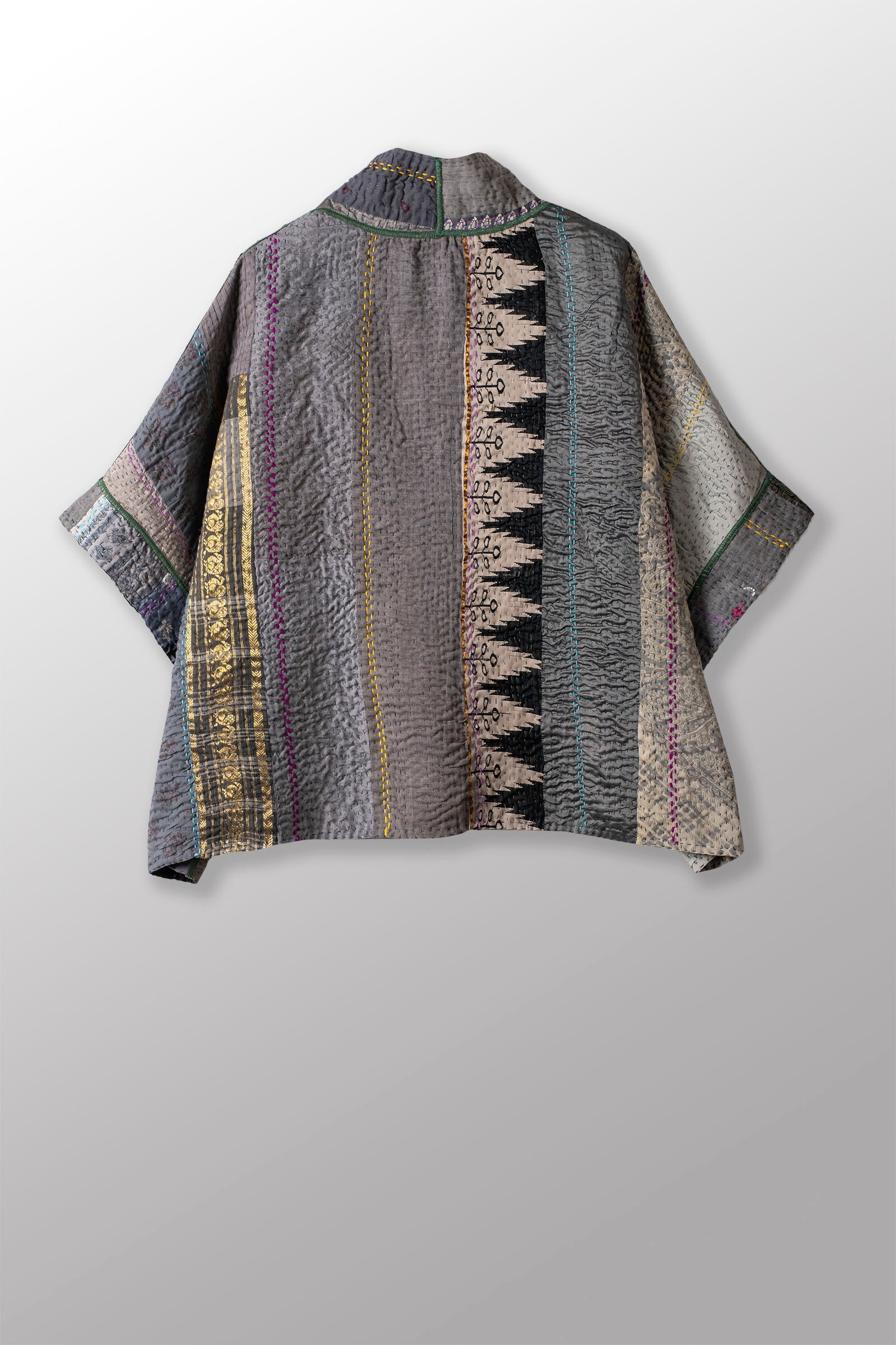 JEWEL WOVEN WITH VERTICAL PATCH KANTHA MINI PONCHO - jv4060-gry -