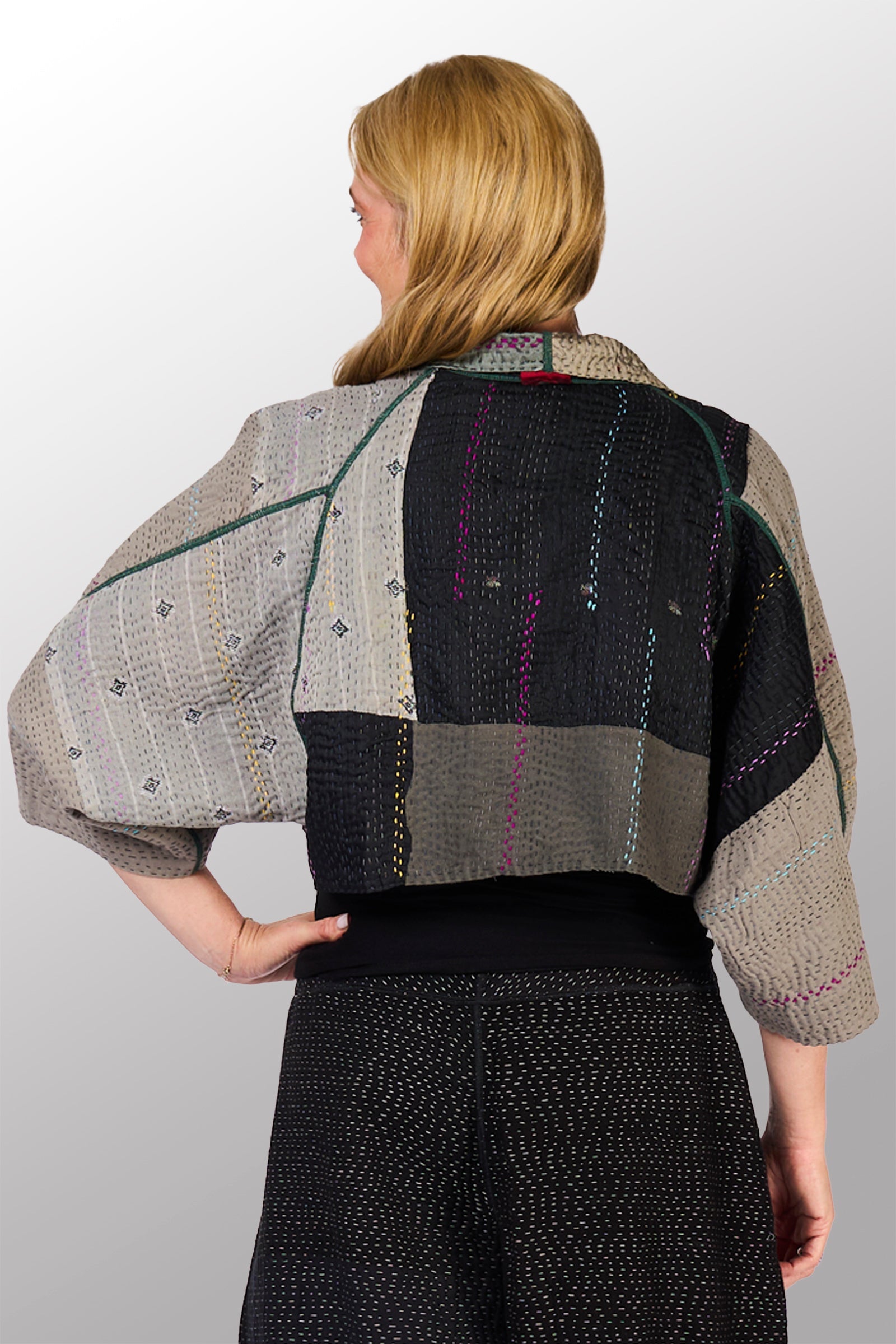 JEWEL WOVEN WITH VERTICAL PATCH KANTHA PUFF SLV. SHRUG - jv4062-gry -