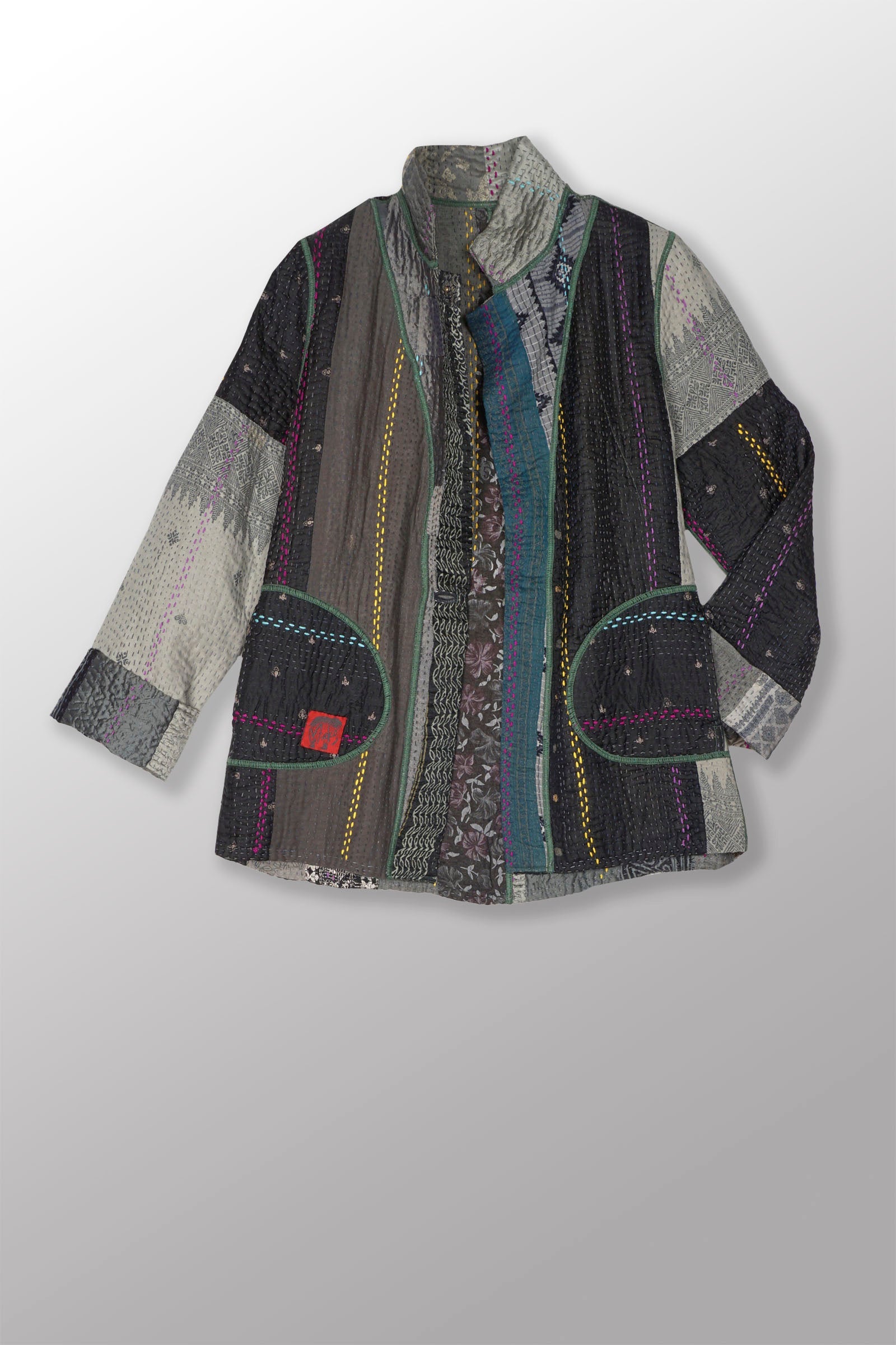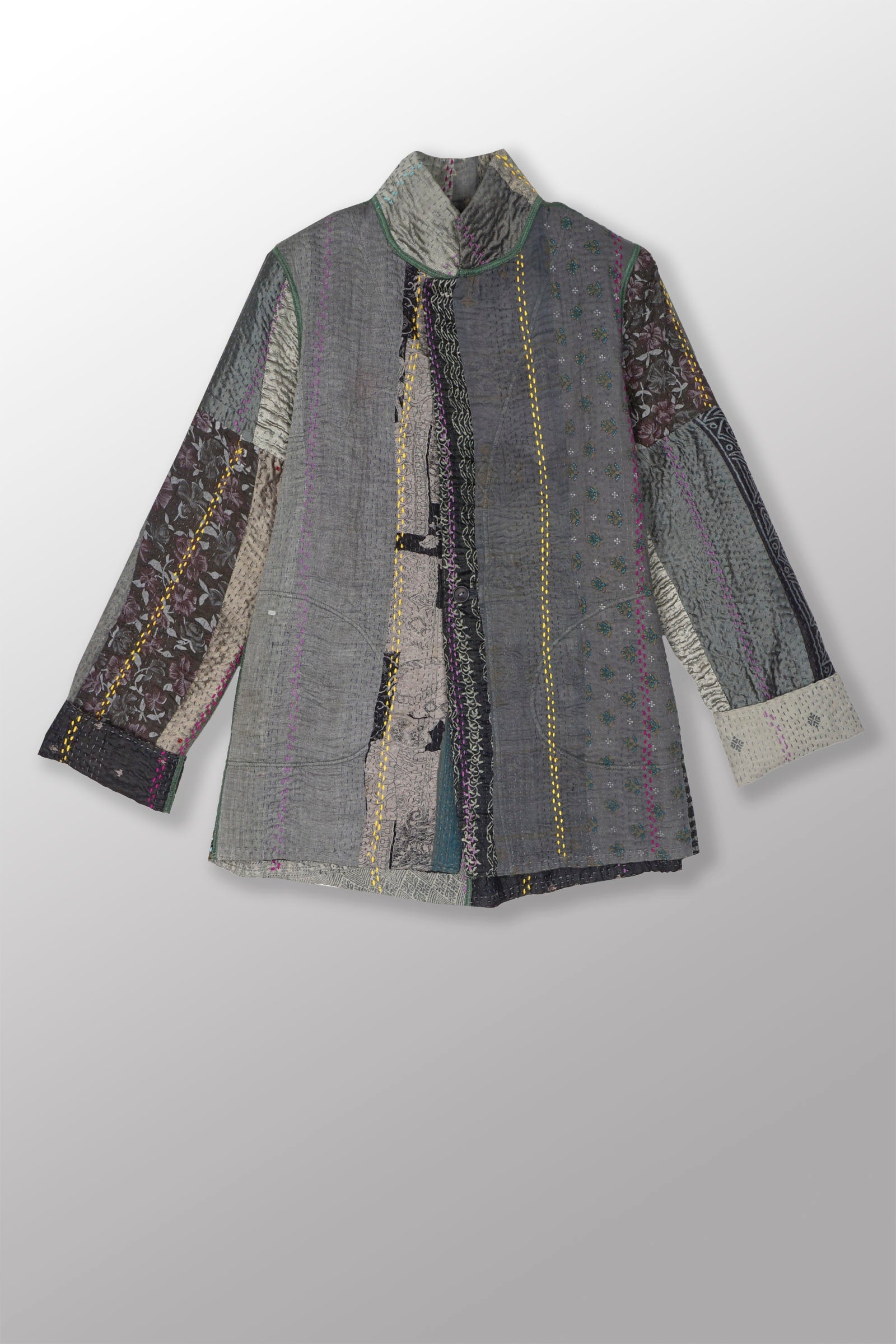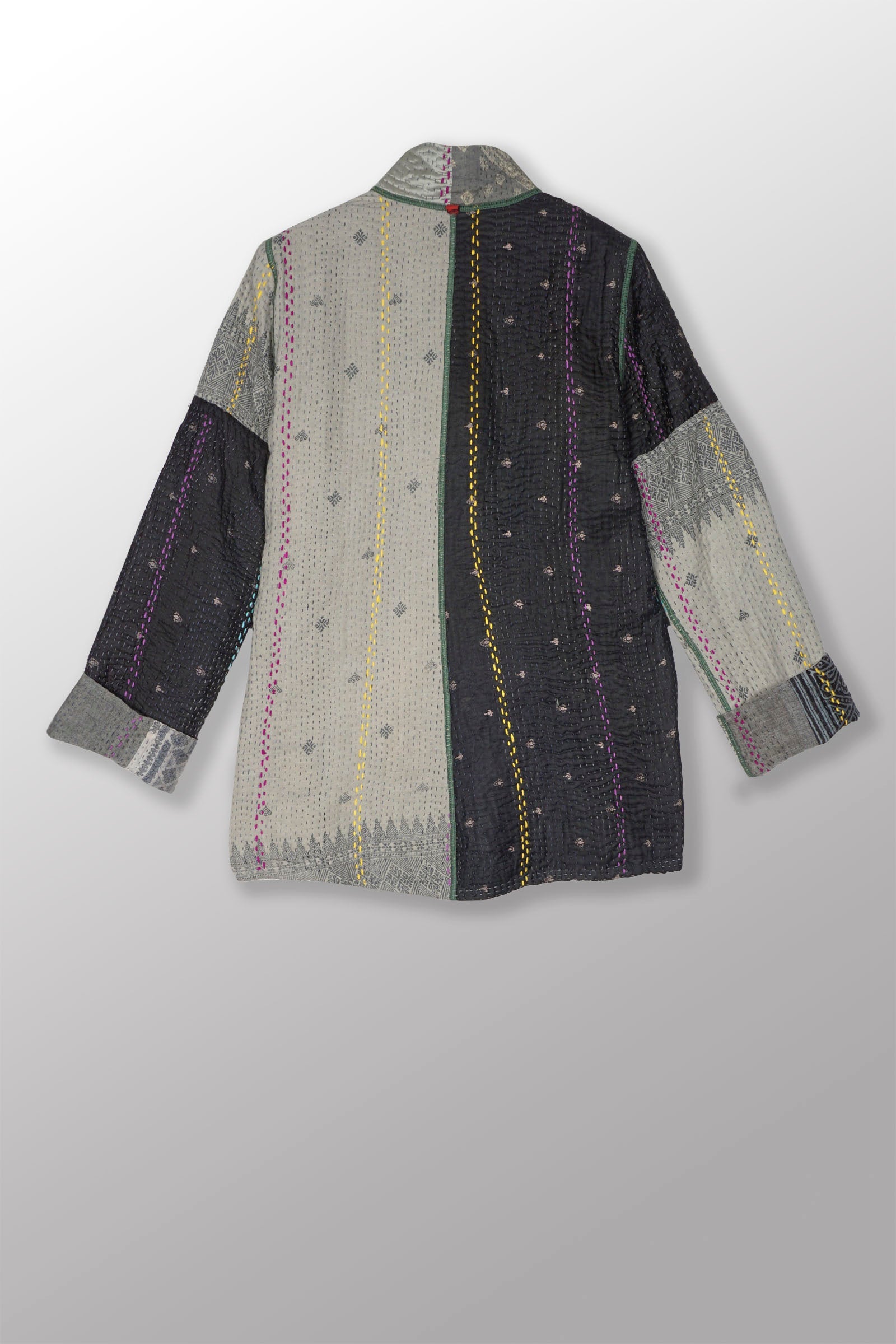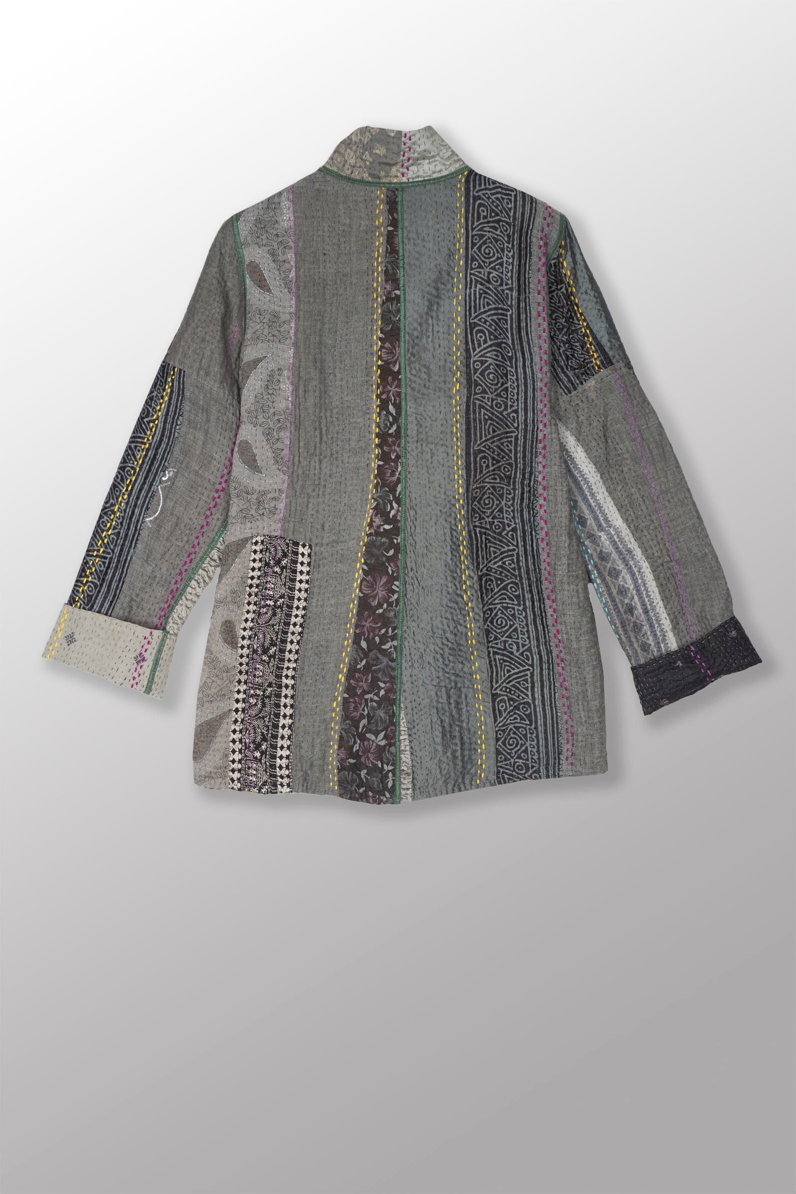 JEWEL WOVEN WITH VERTICAL PATCH KANTHA SIMPLE JACKET - jv4022-gry -