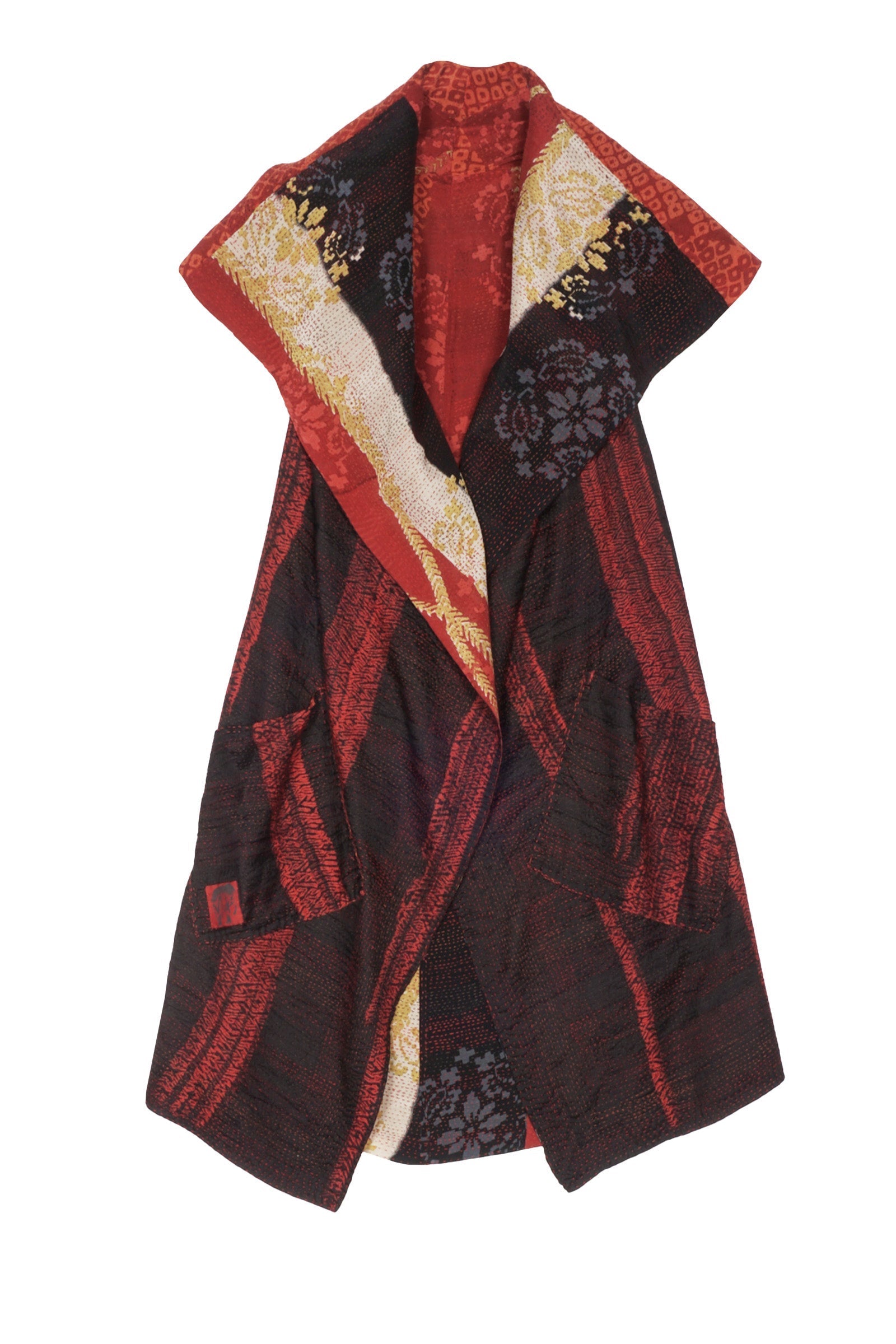 KIMONO PRINT KANTHA CIRCULAR VEST - kp2201-red -