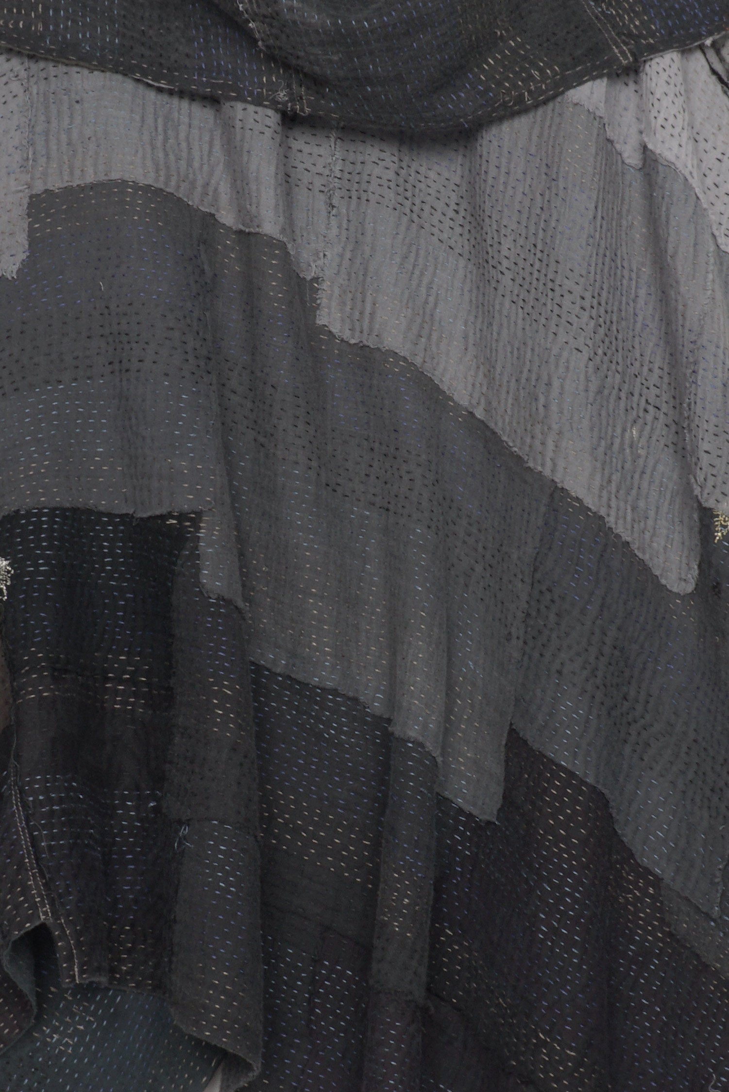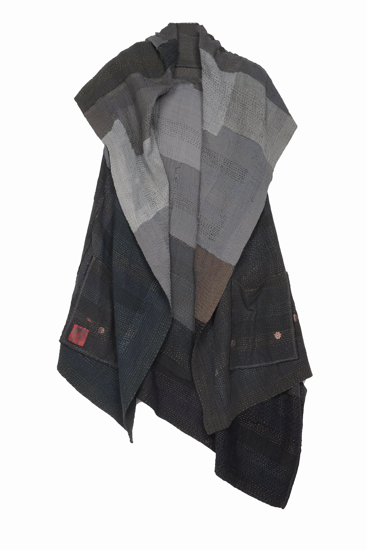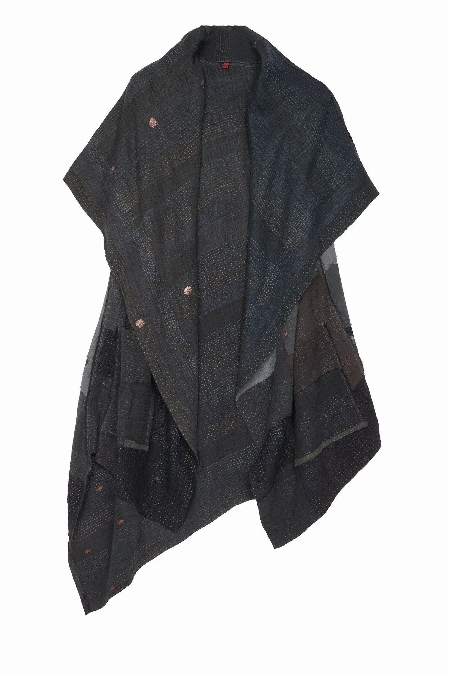 LANDSCAPE FRAYED PATCH KANTHA SLANT HEM HOODED VEST - lf2212-gry -