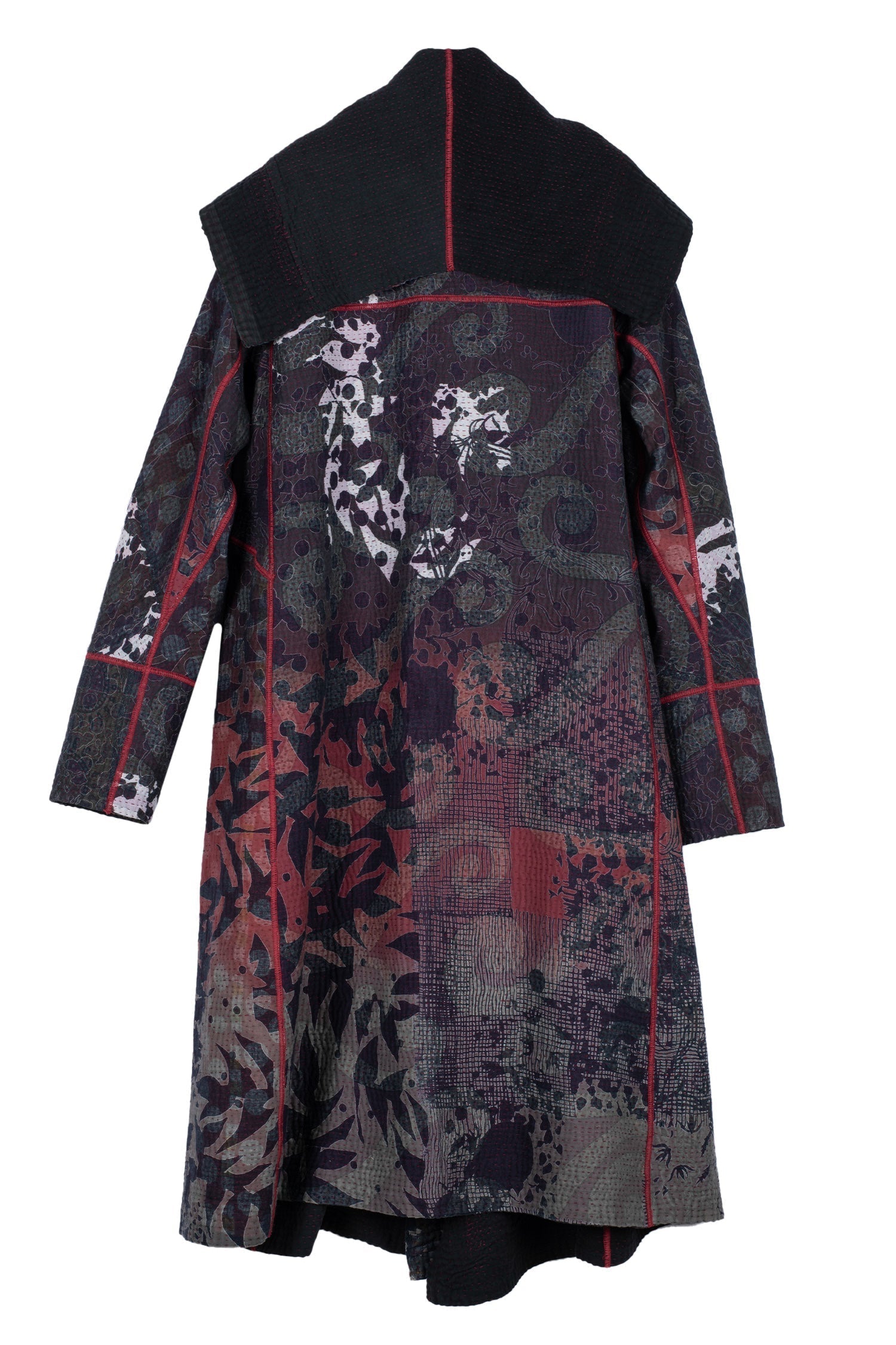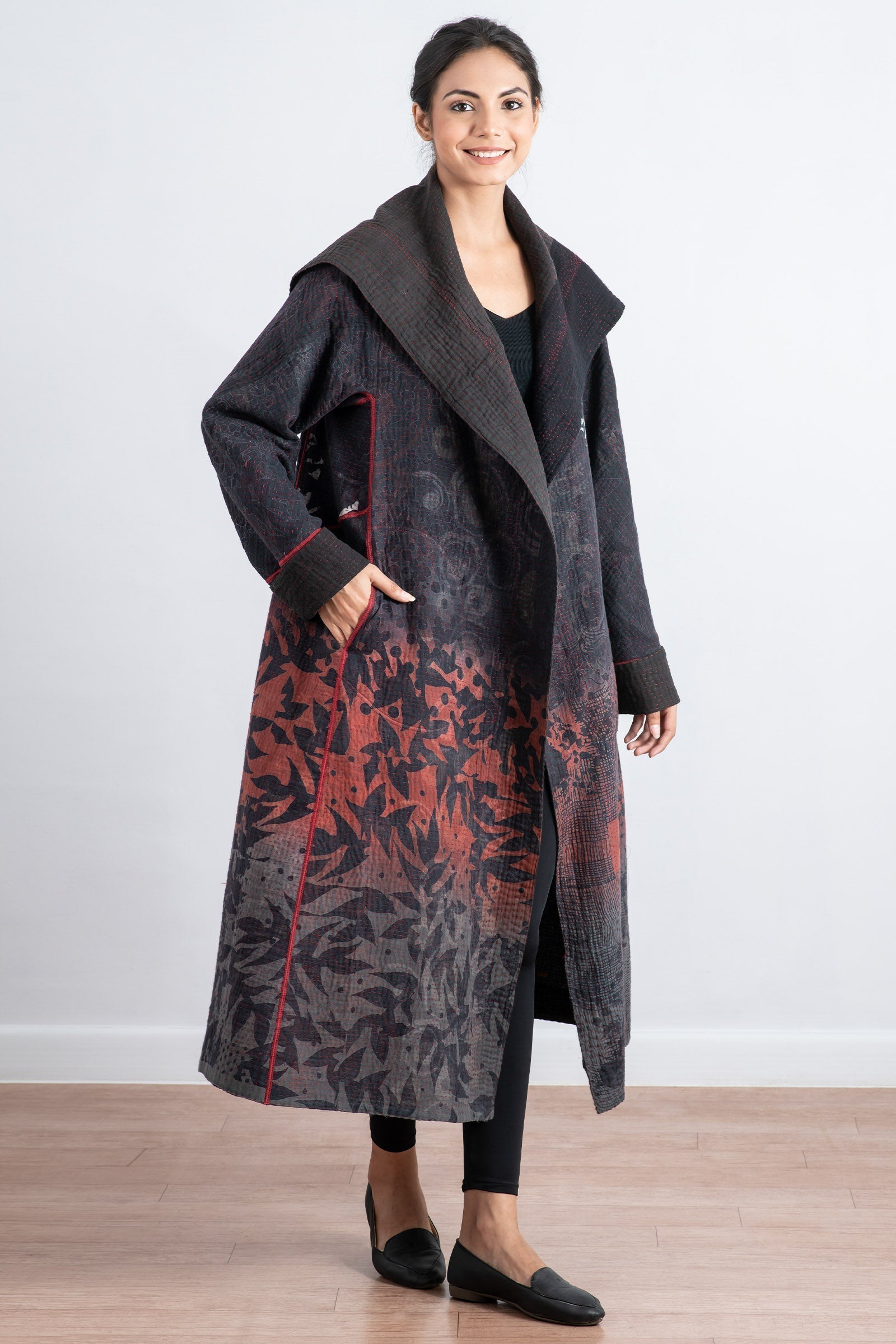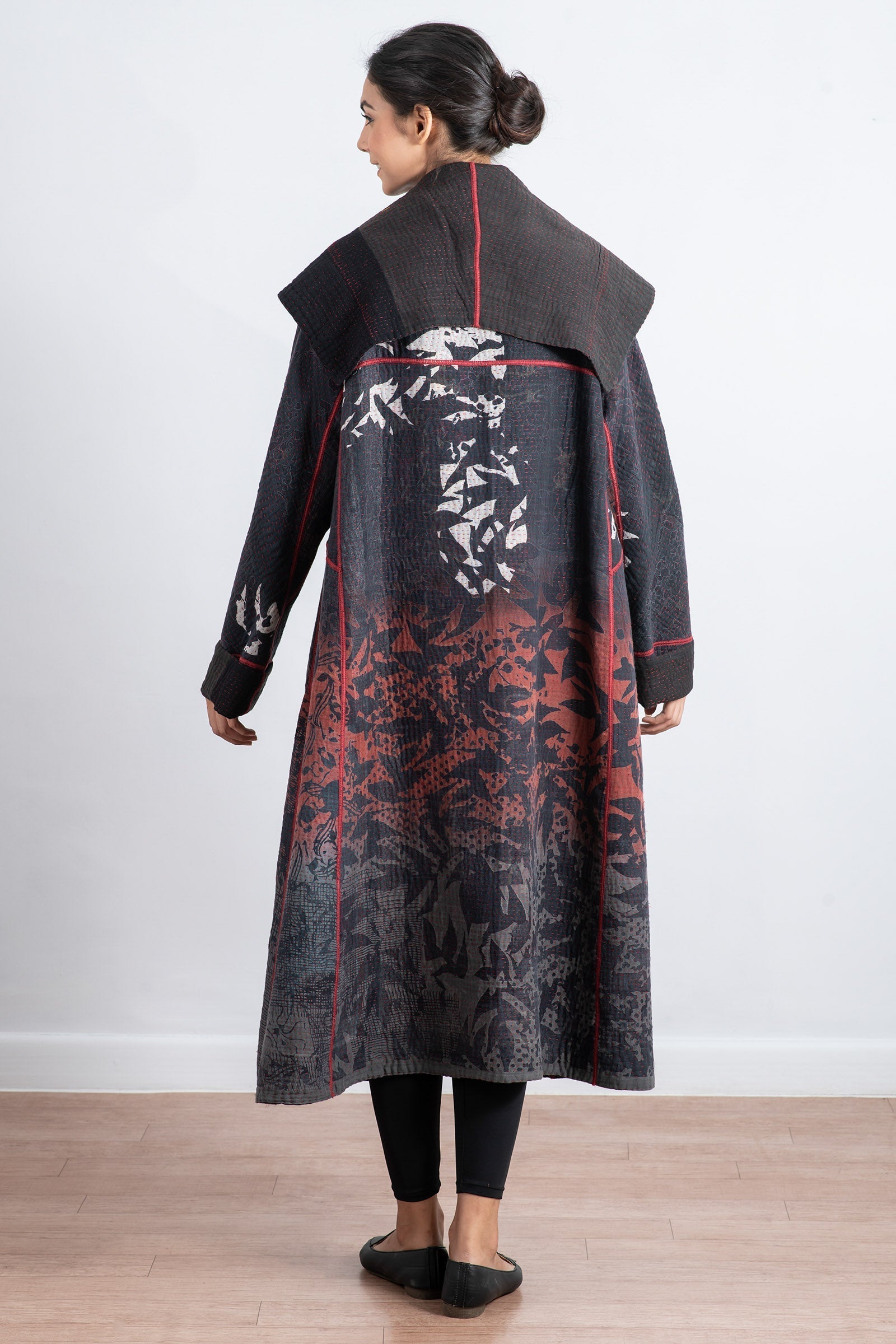 MONOTONE TWILIGHT PRINT KANTHA A-LINE LONG COAT - tp4302-red -