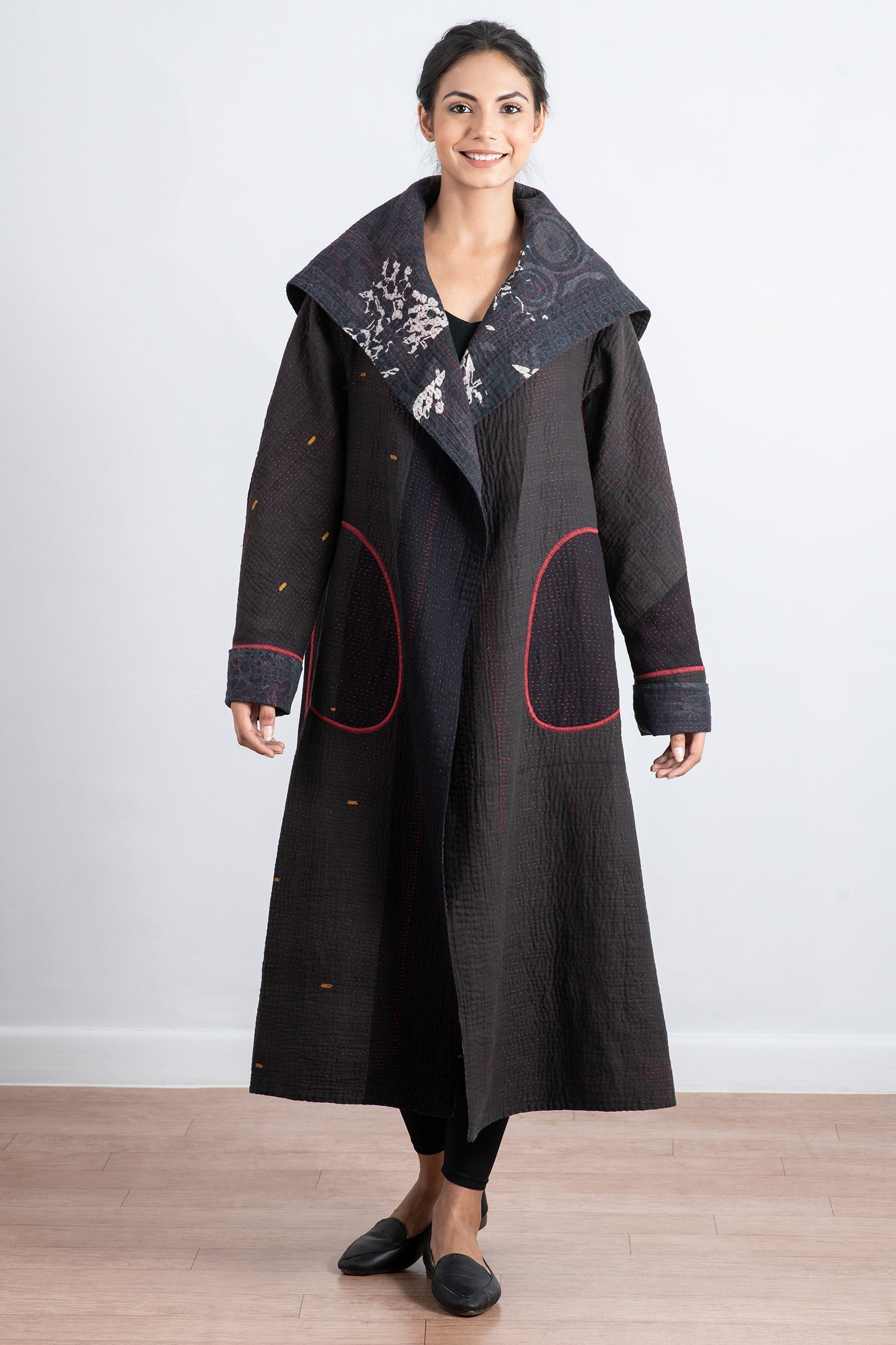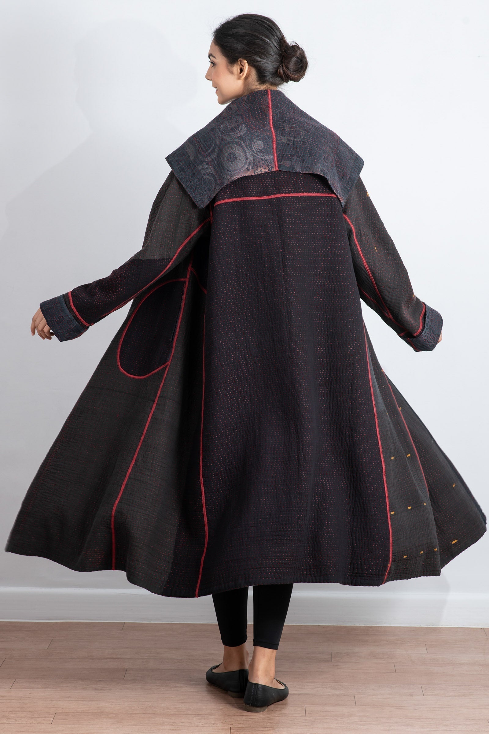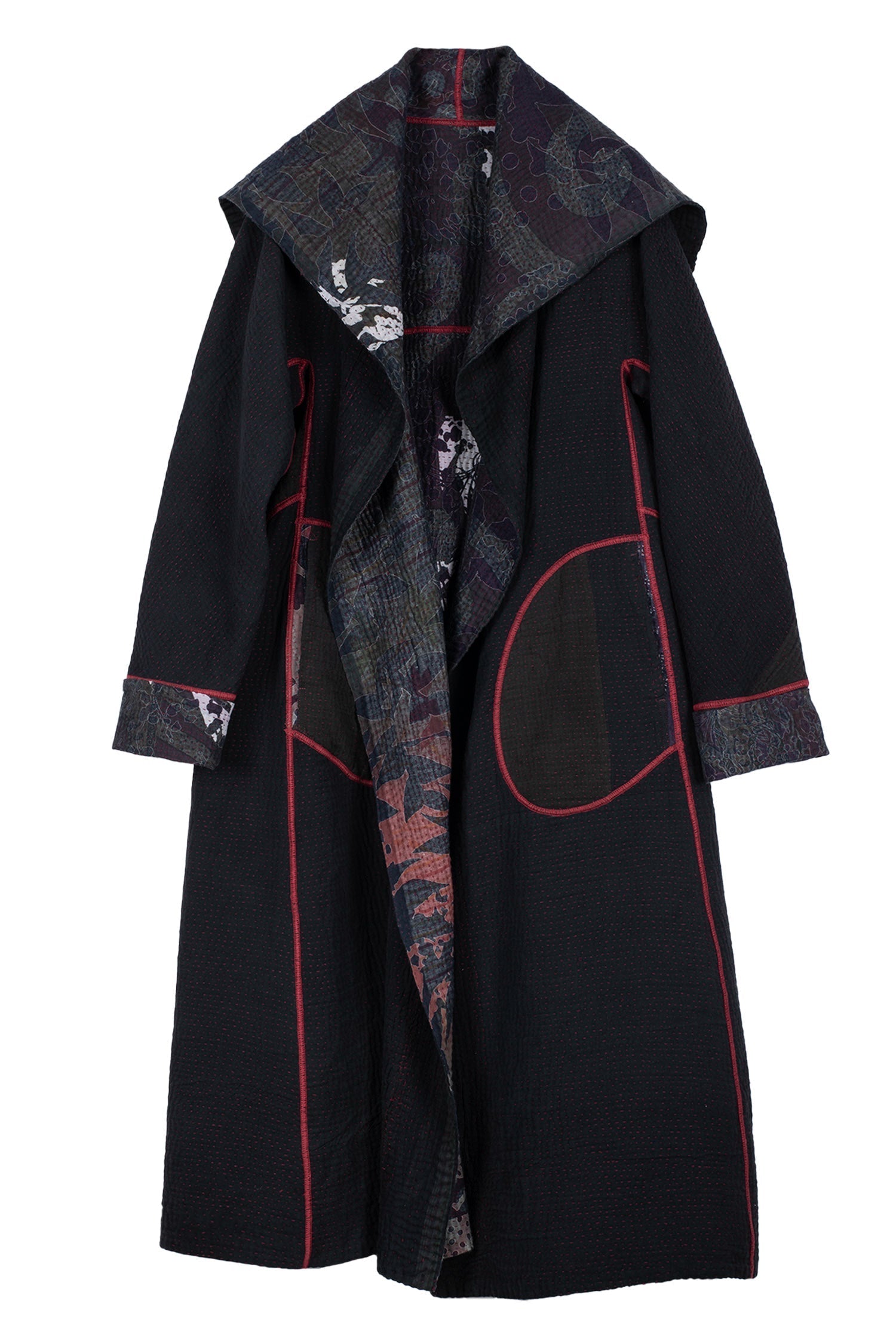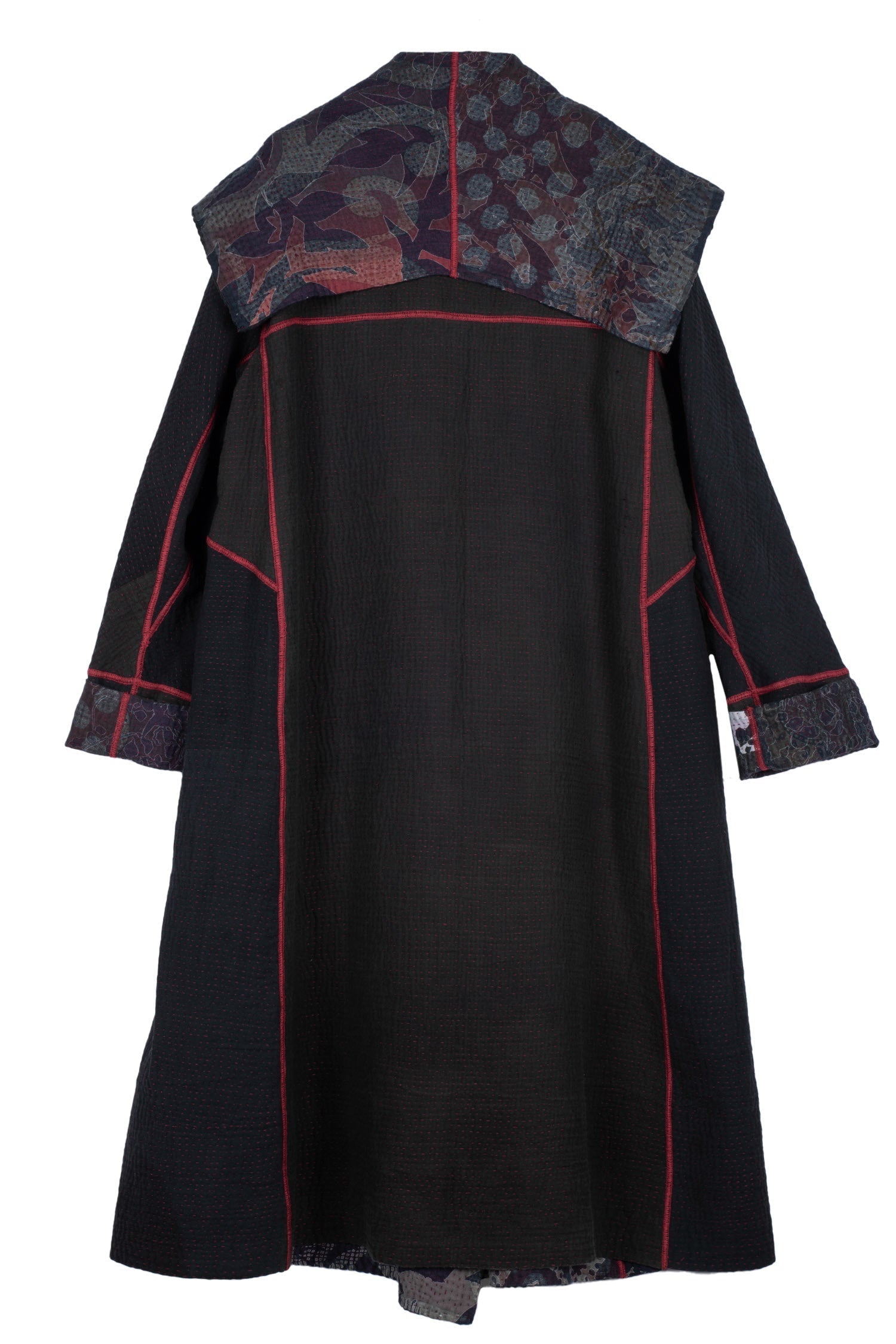 MONOTONE TWILIGHT PRINT KANTHA A-LINE LONG COAT - tp4302-red -