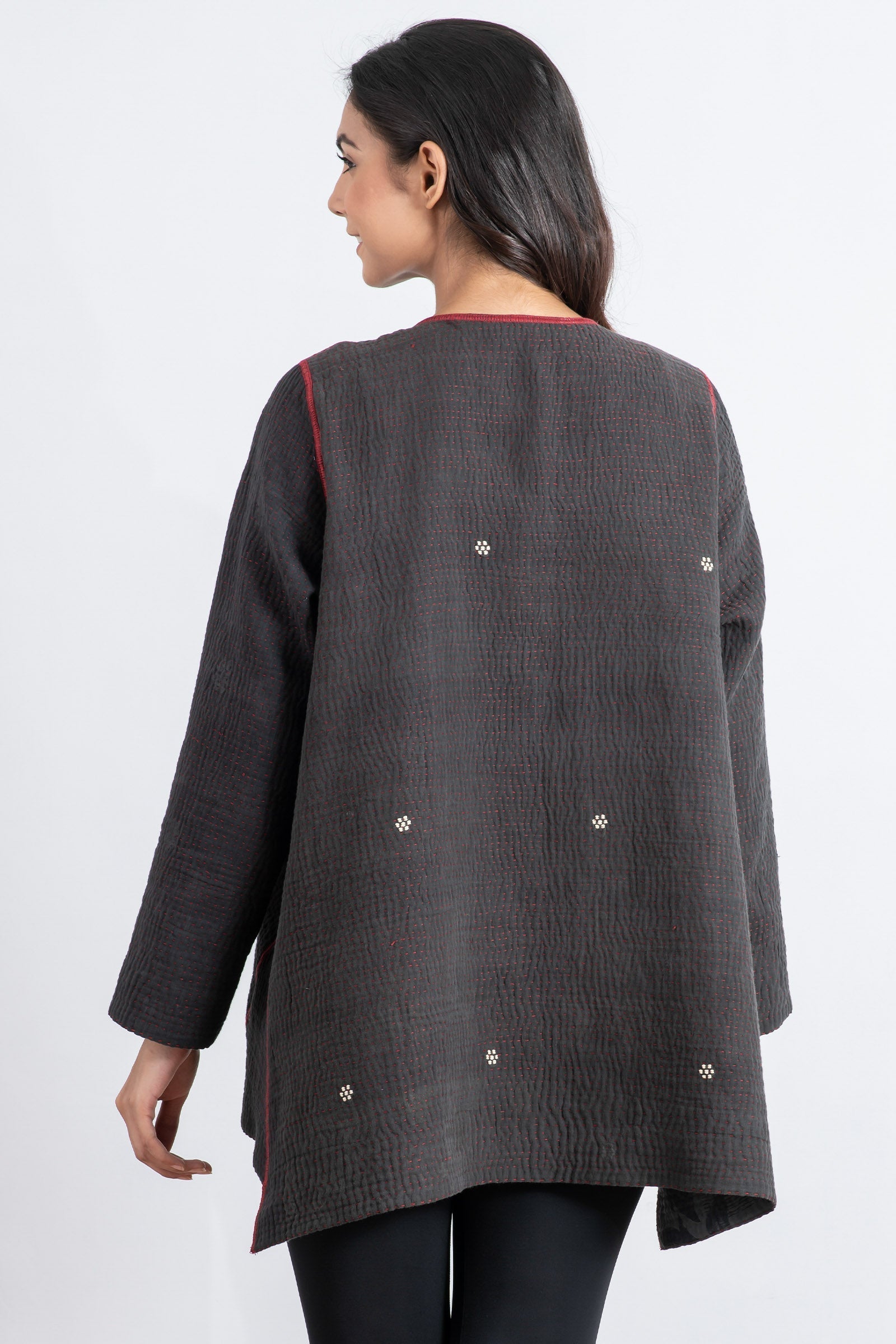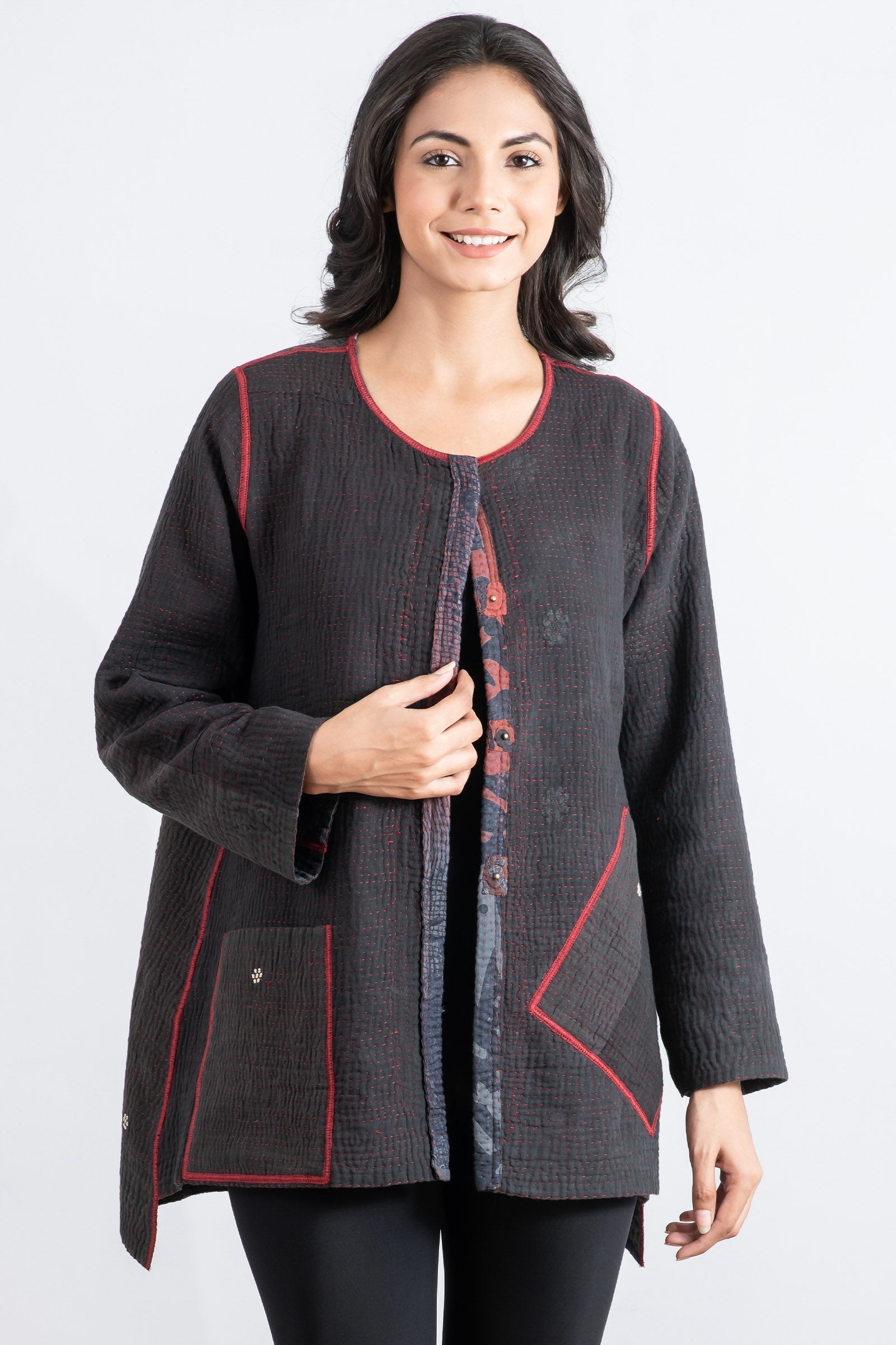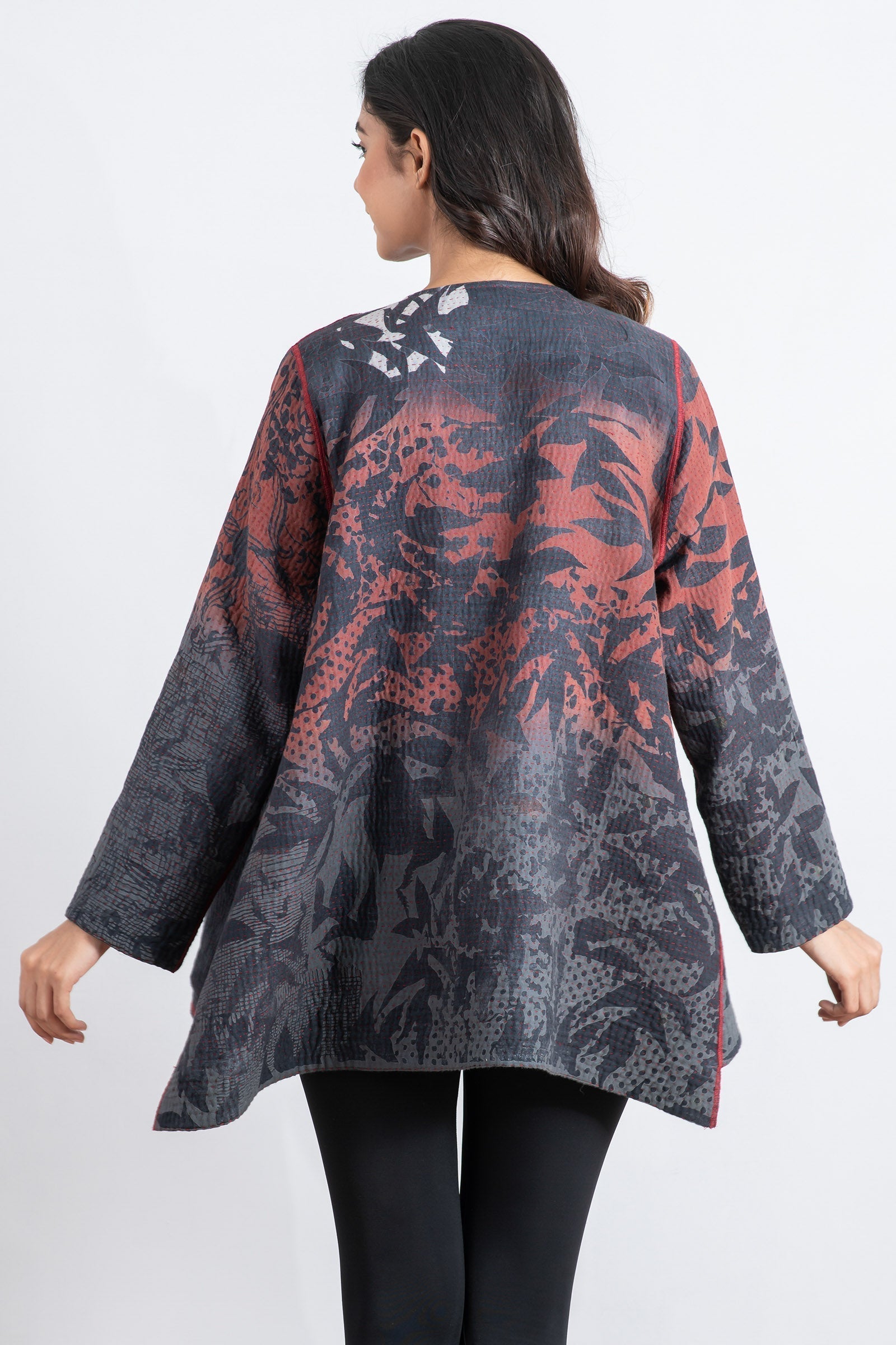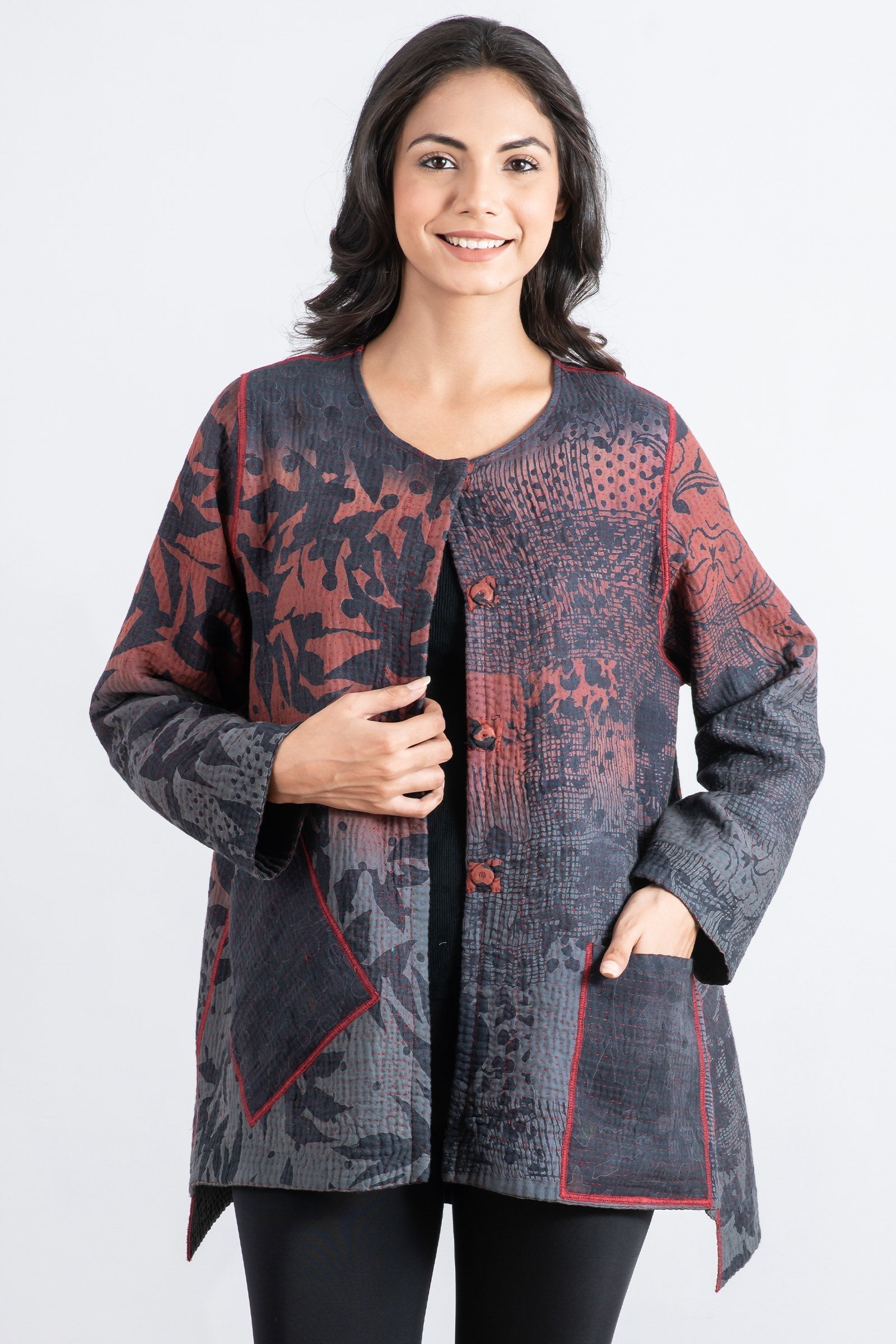 MONOTONE TWILIGHT PRINT KANTHA CREW NECK POCKET JKT - tp4025-red -