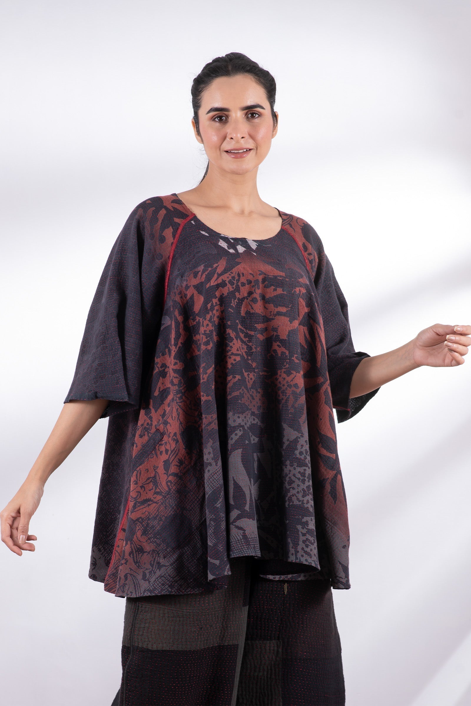 MONOTONE TWILIGHT PRINT KANTHA PUFF SLV. FLARE TOP - tp2543-red -