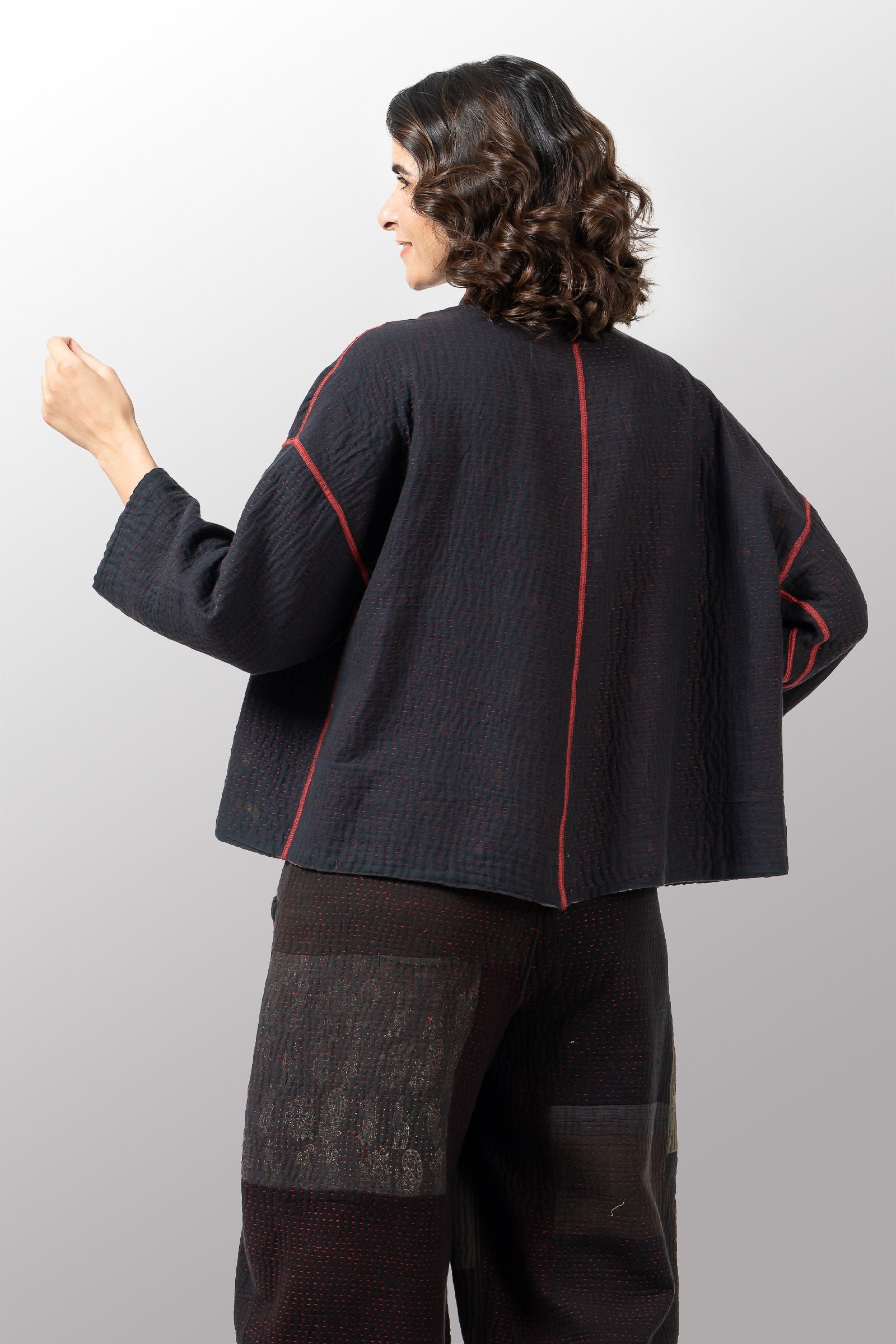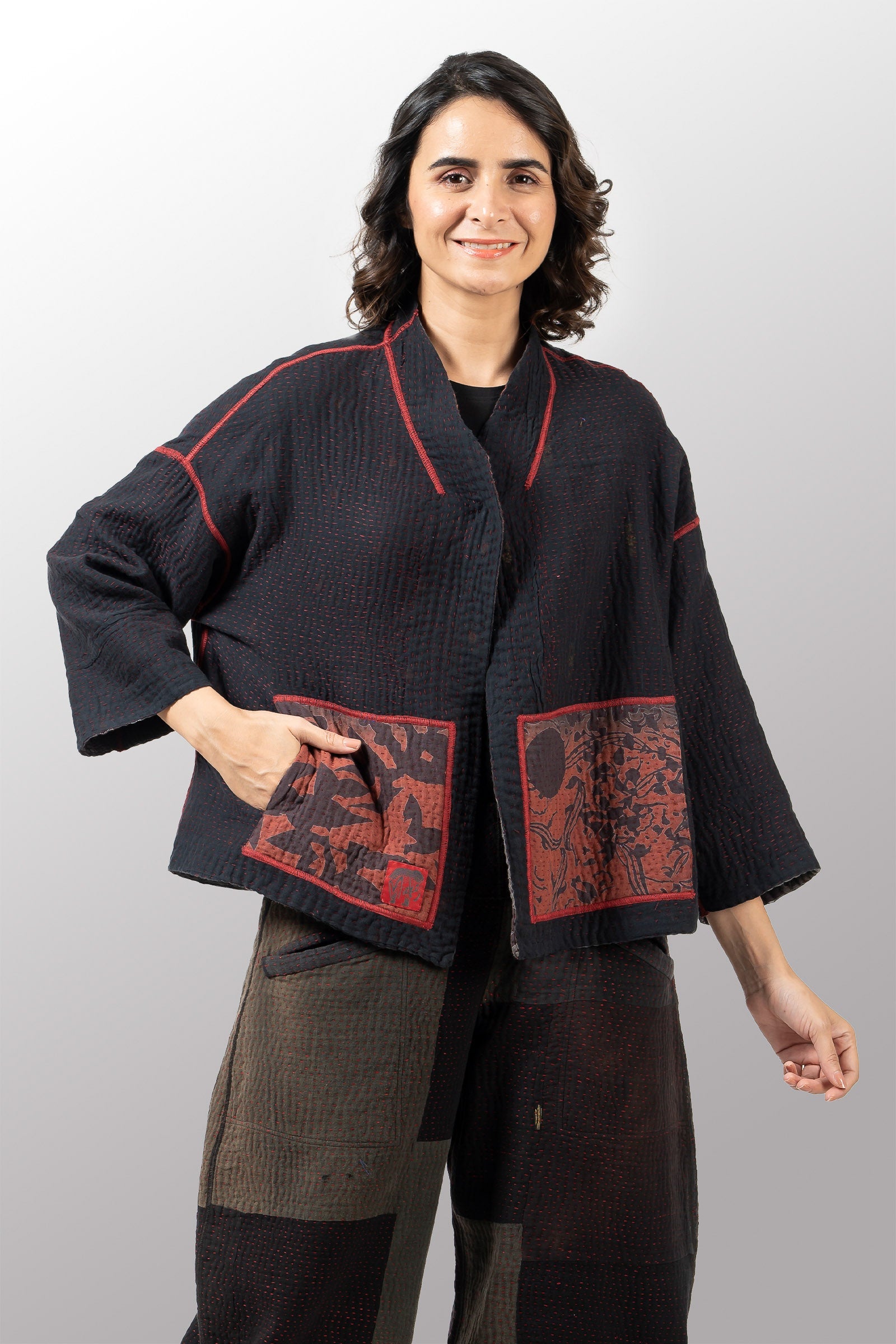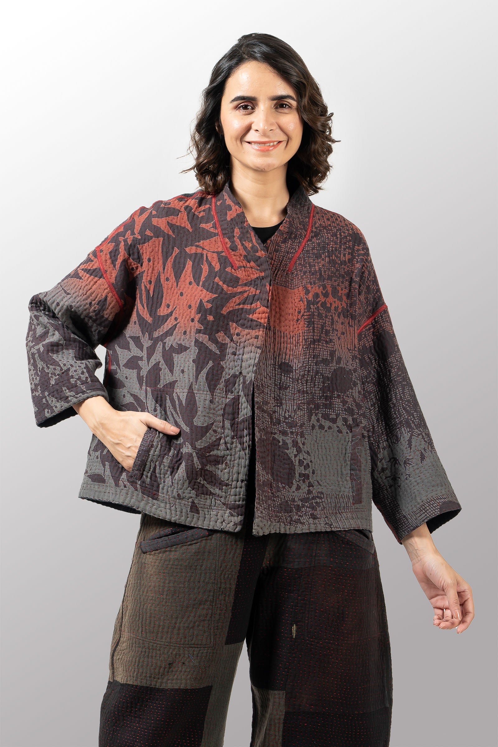 MONOTONE TWILIGHT PRINT KANTHA STAND COLLAR CROPPED JKT - tp4034-red -