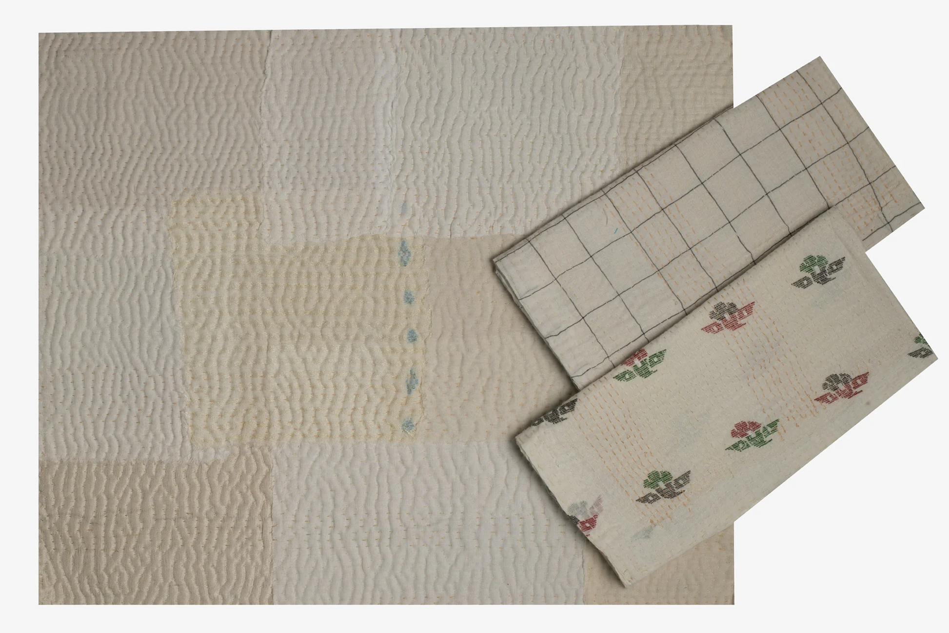 This collection has a thin layer of Wool wadding along with four layers of cotton and silk recycled vintage saris for Bed Covers and Throws. All the patches are articulately placed hand stitched with threads of tonal shades deliberately leaving edges to fray. These luxuriously soft touch bed cover is having quarter of a million hand running stitches that gives a beautiful puckering surface.