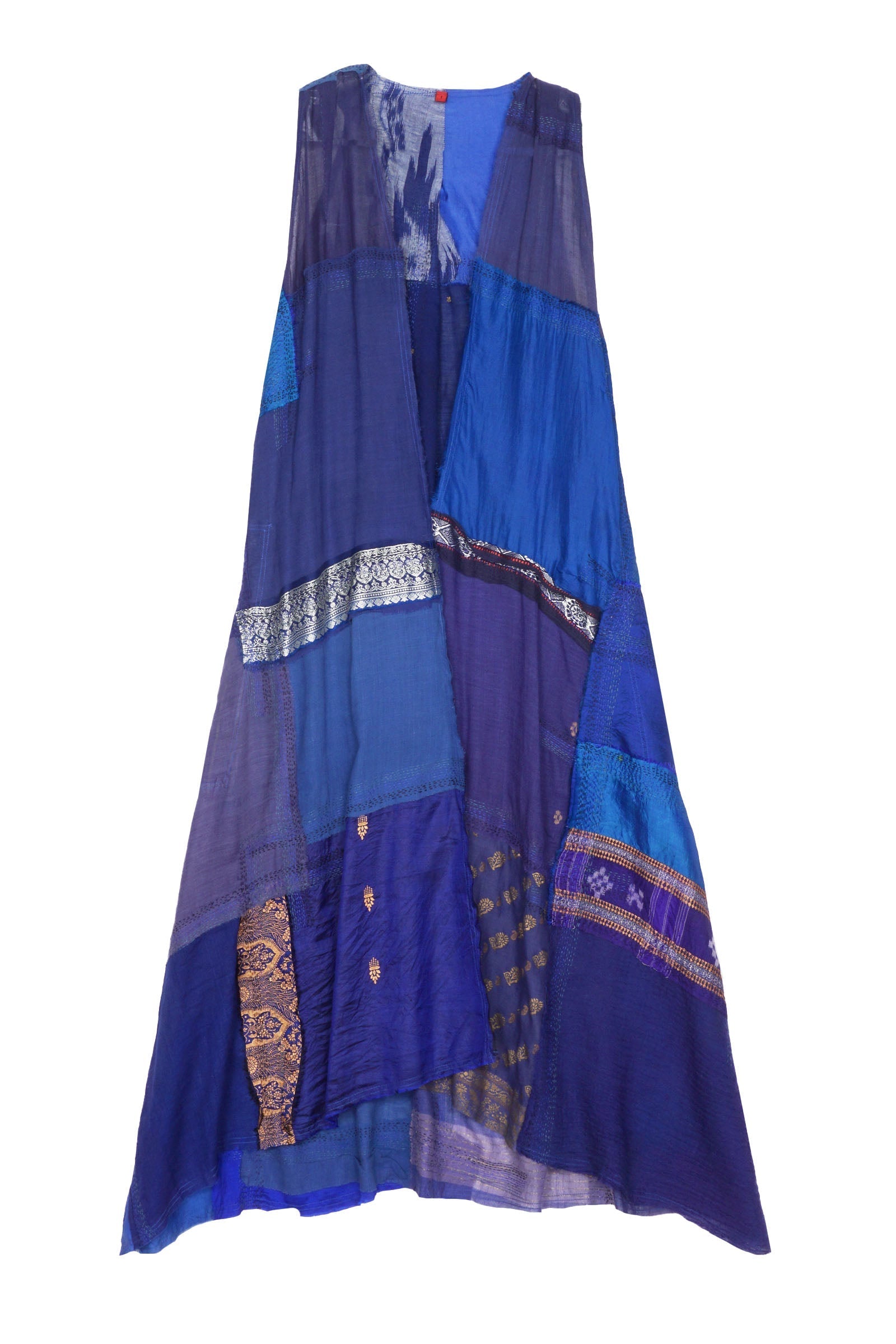 MOSAIC TILE PATCH KANTHA BACK PLEATED VEST MAXI - mt1222-blu -