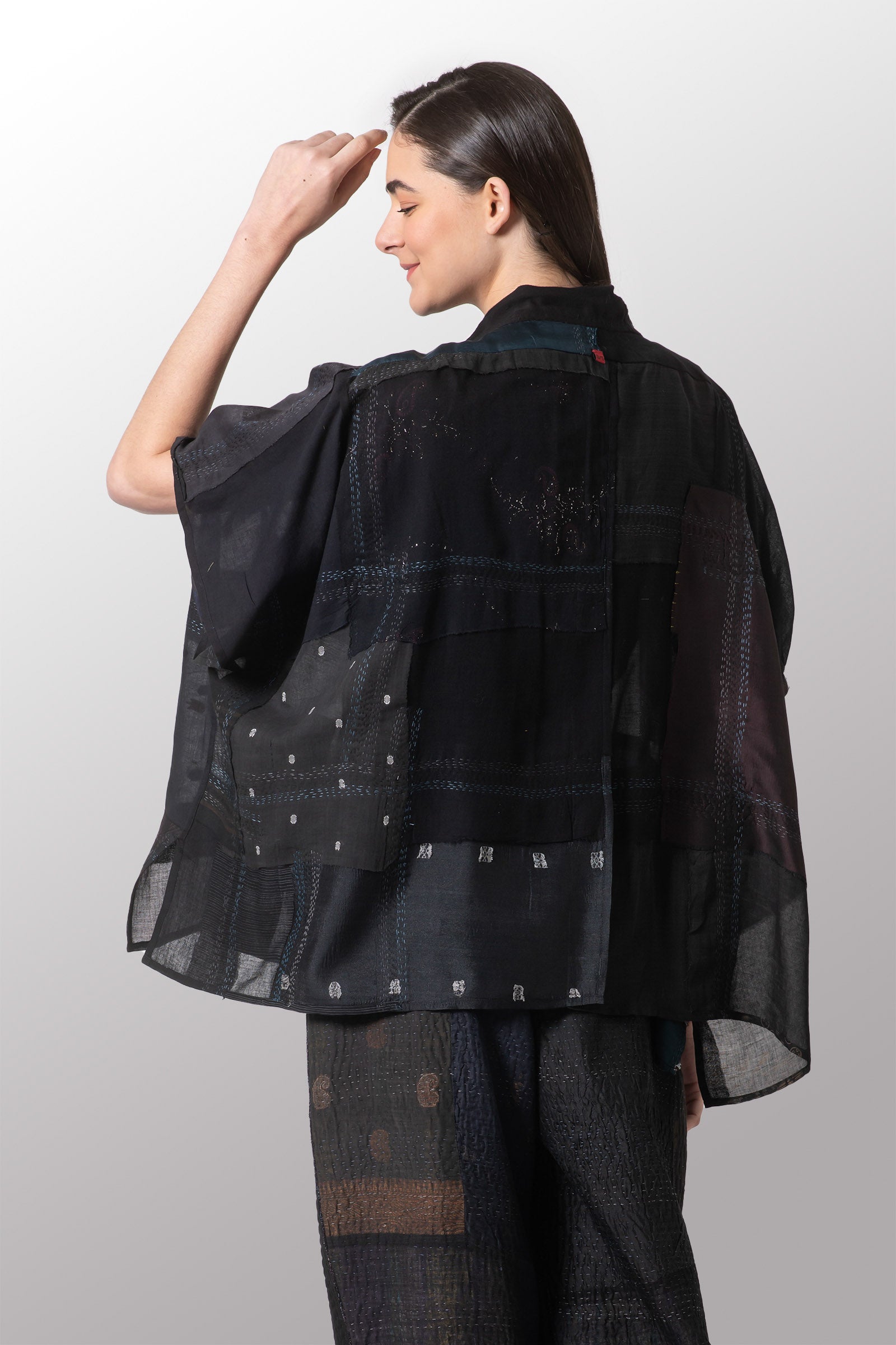 MOSAIC TILE PATCH KANTHA PONCHO TOP - mt1568-blk -