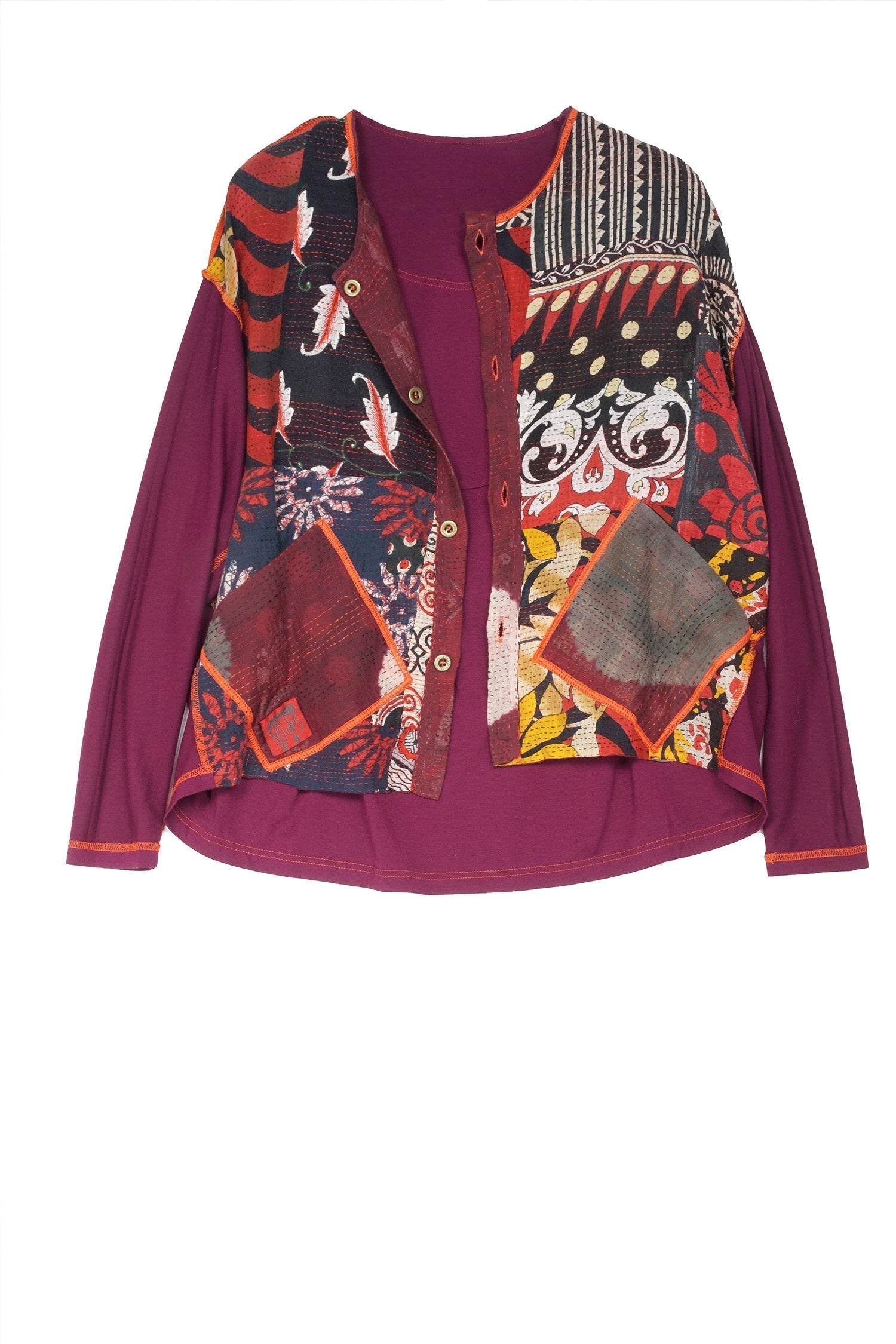 PATCH & CIRCLE PRINT KANTHA AND KNIT SHORT JKT - pc2029-red -