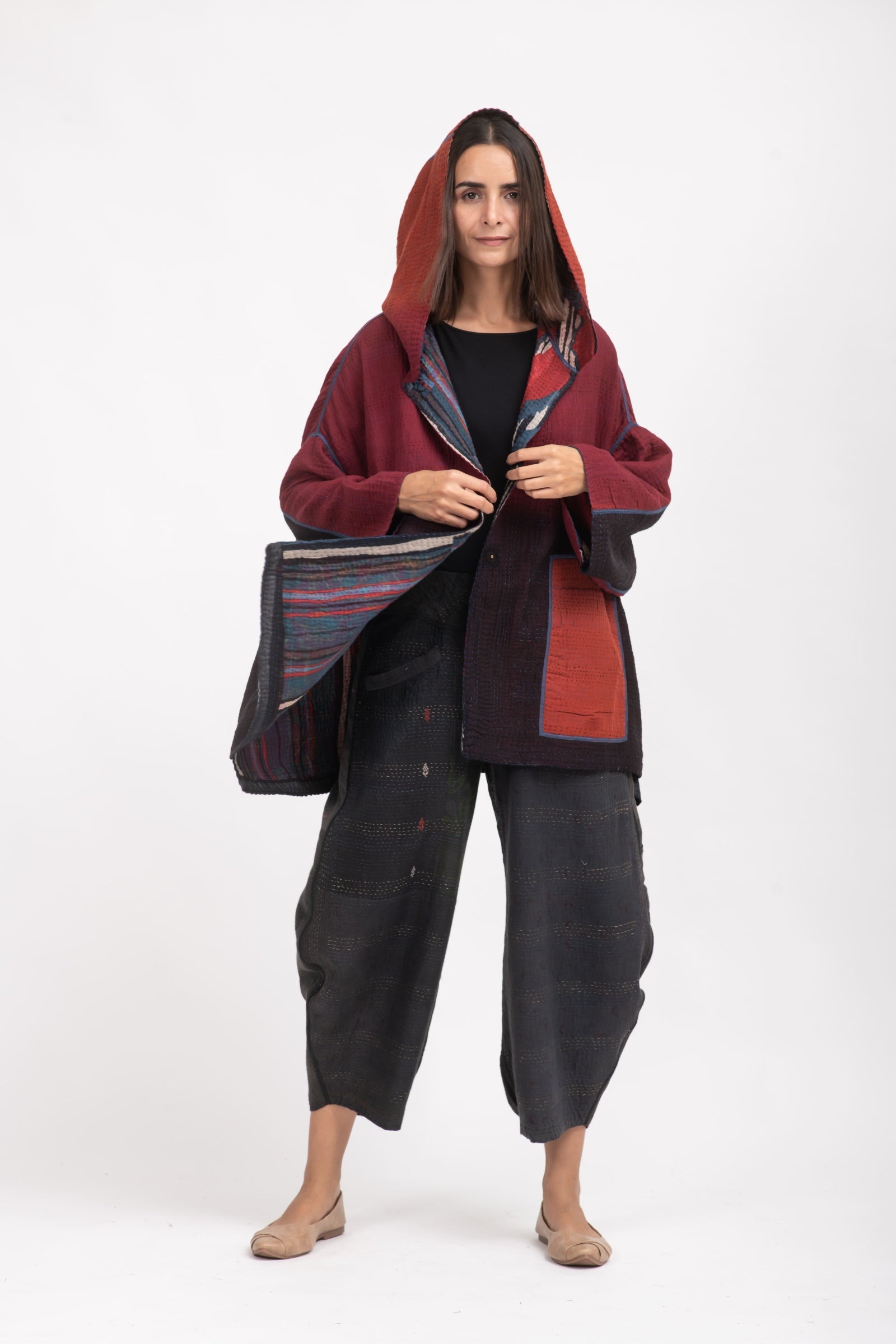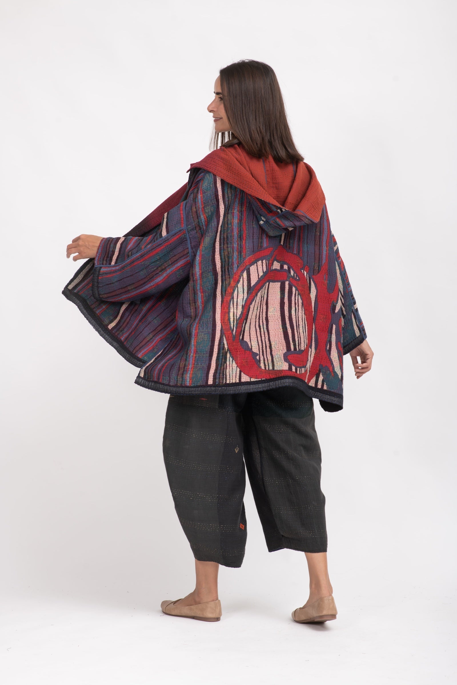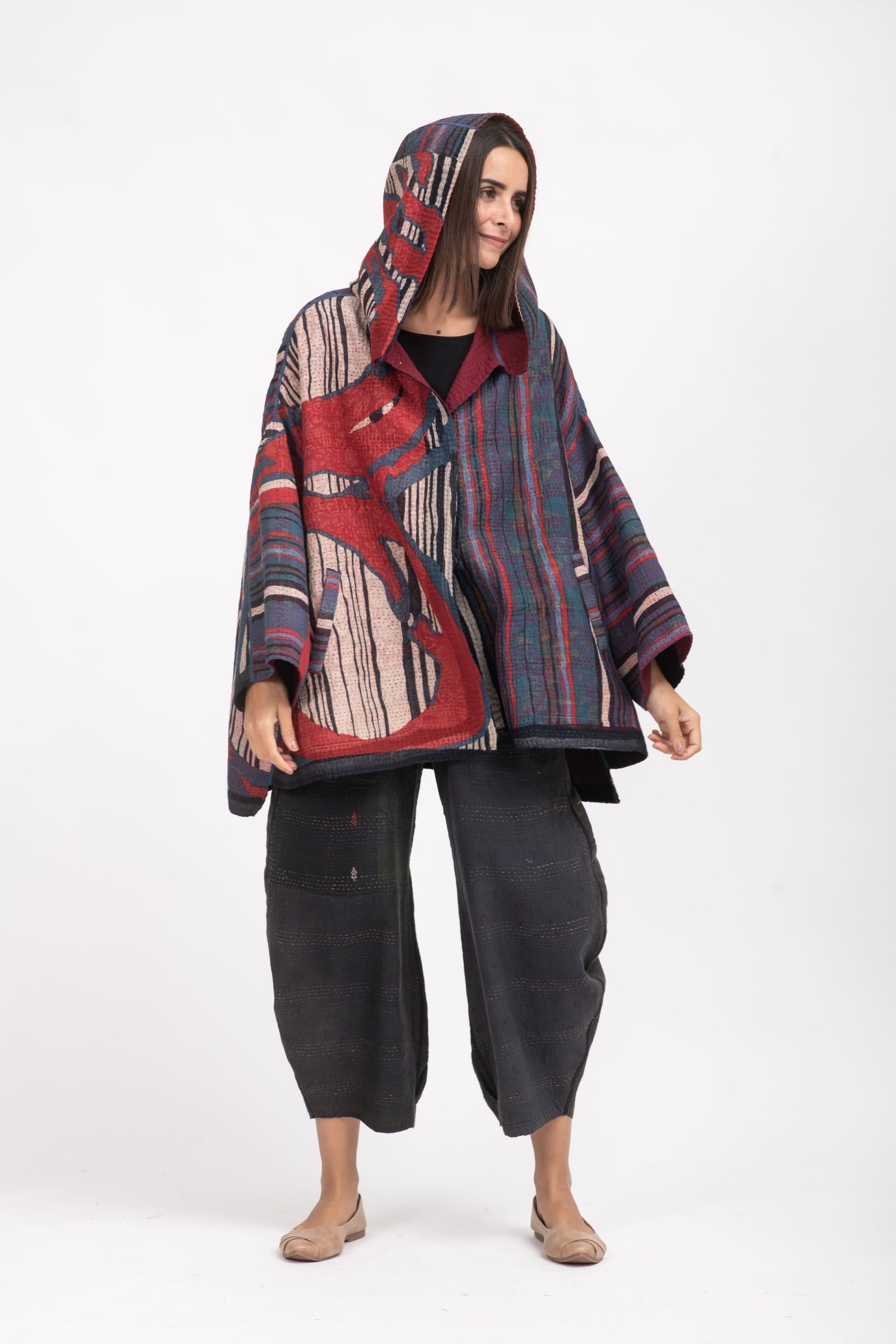 STRIPE AND BENDS KANTHA HOODIE PONCHO - sb4064-red -