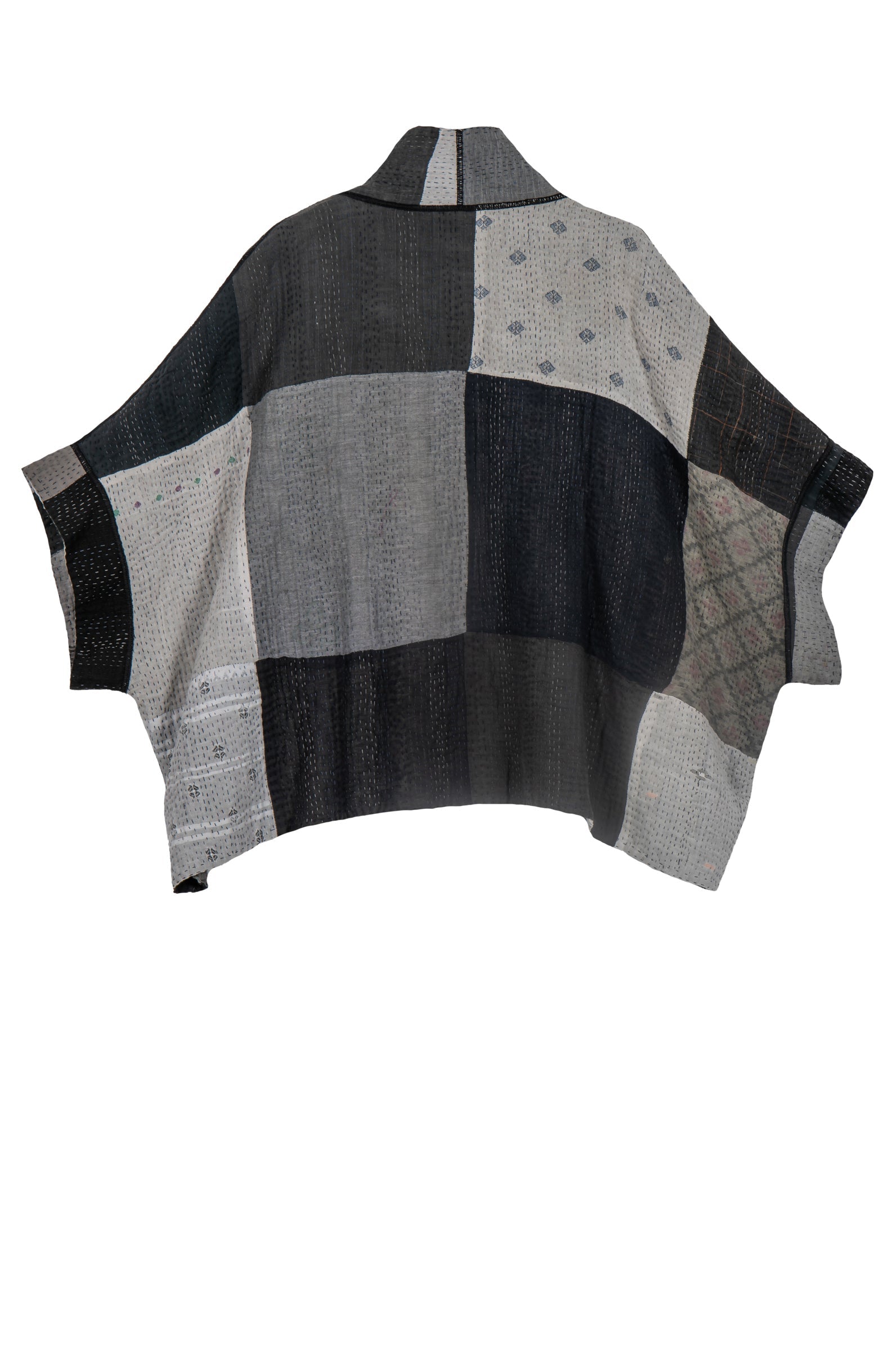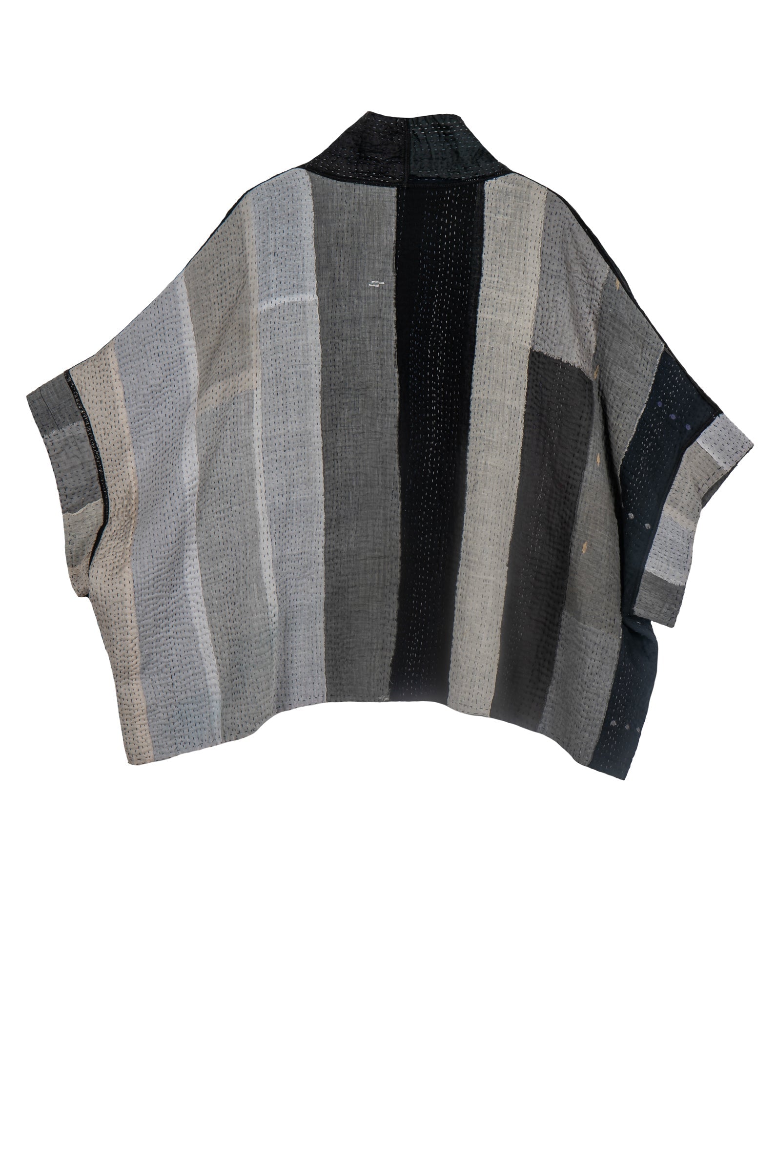 STRIPE AND CHECK COTTON SILK PATCH KANTHA MINI PONCHO - ss4060-blk -