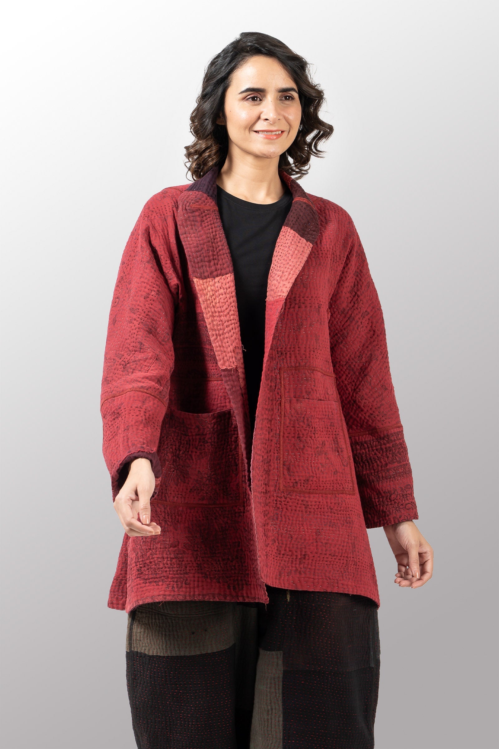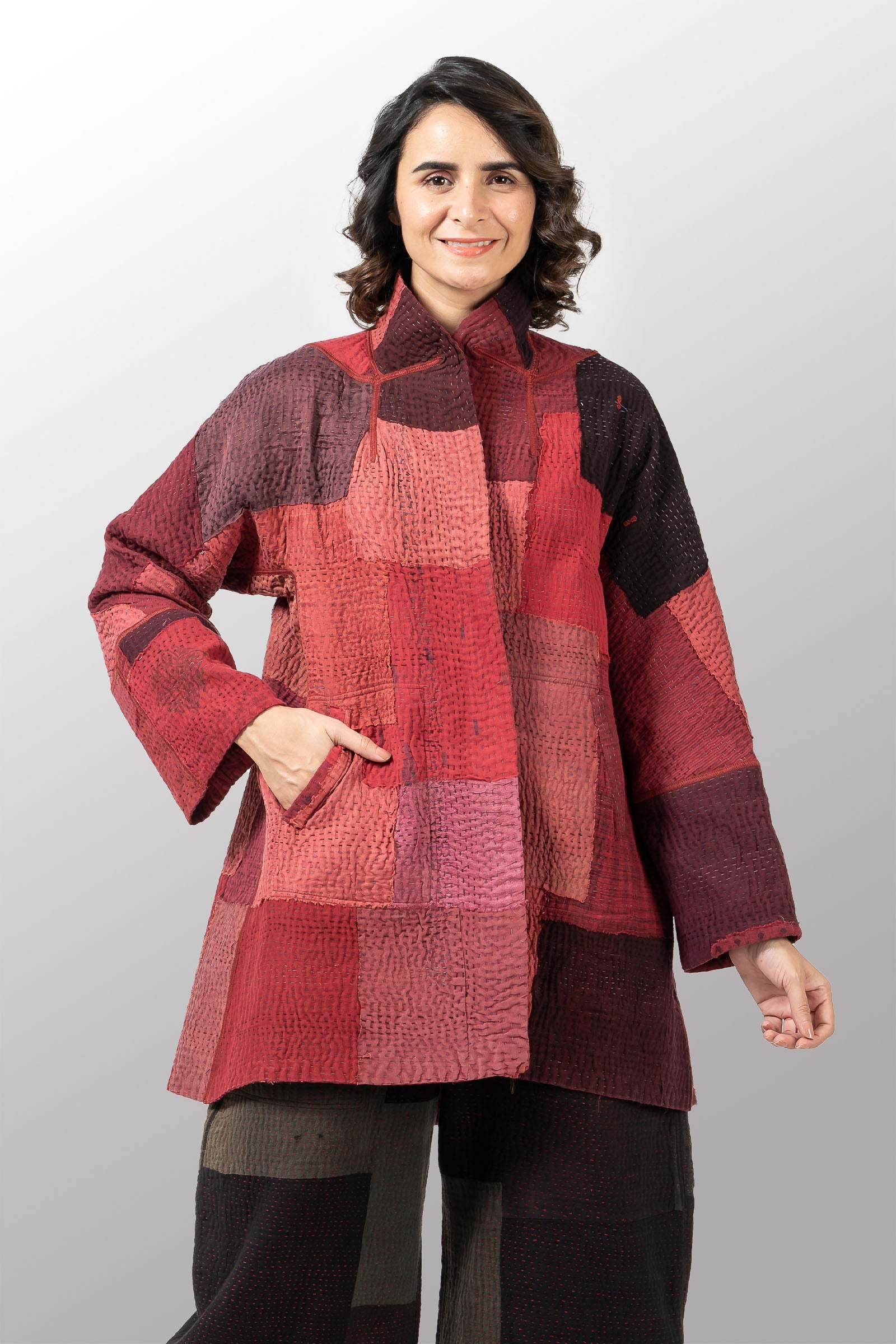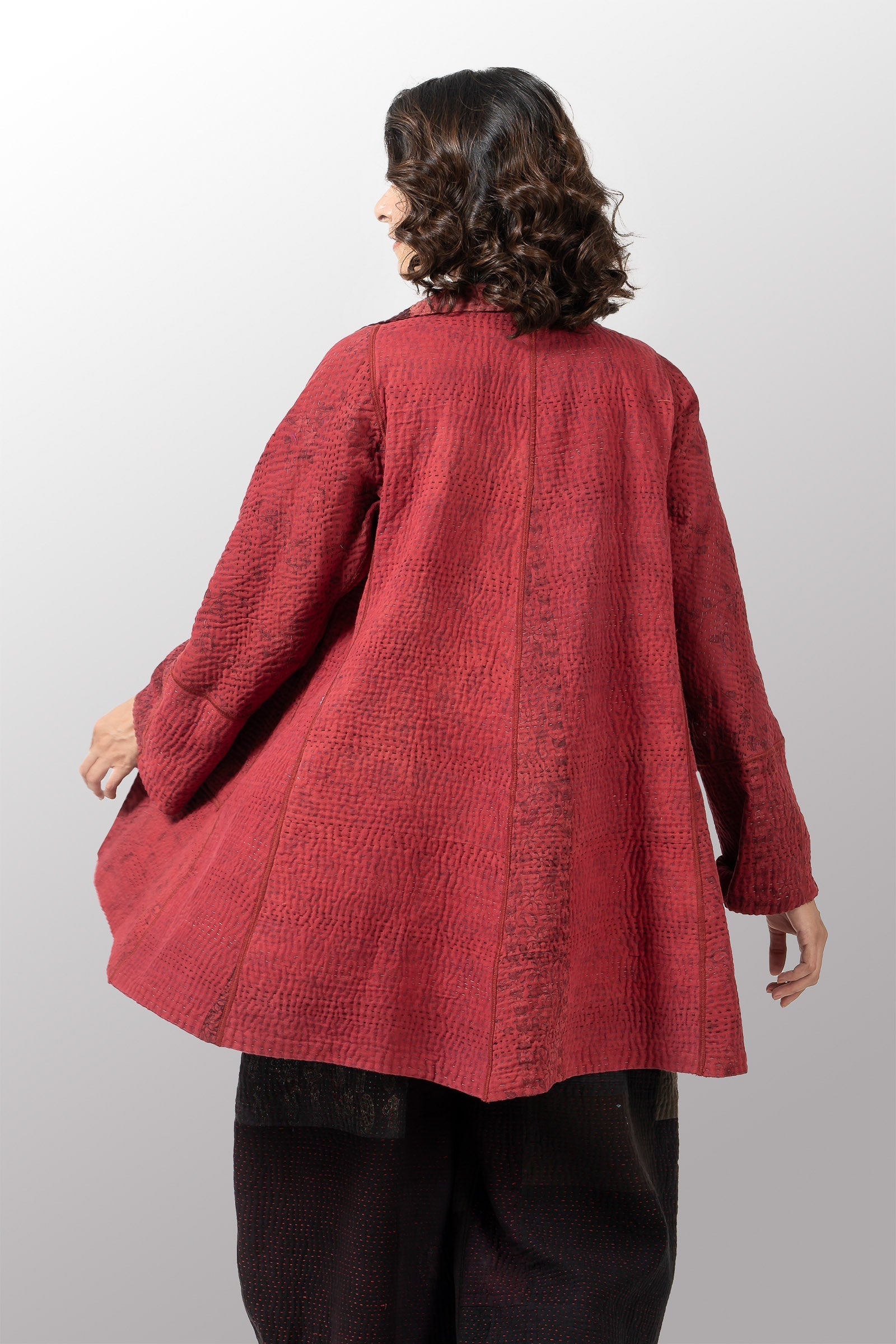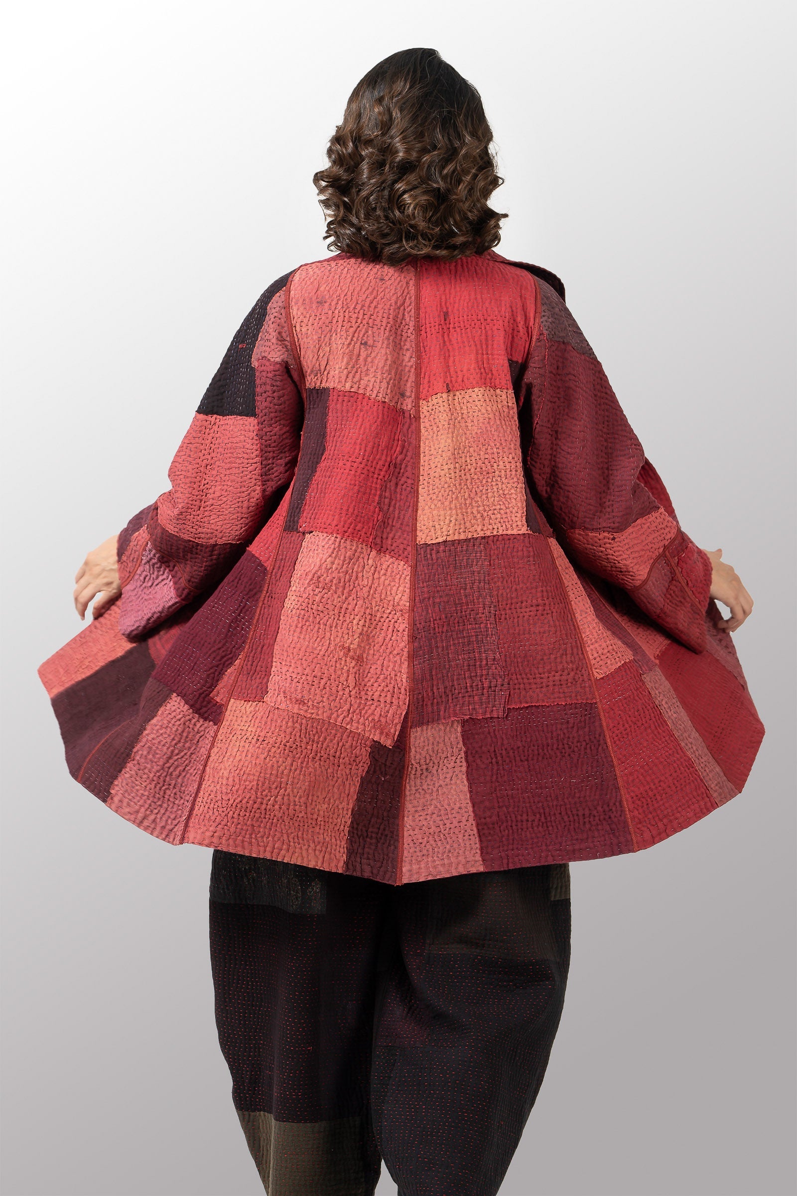 TWO TONE PATCH KANTHA FLARE LONG JACKET - tn4021-org -