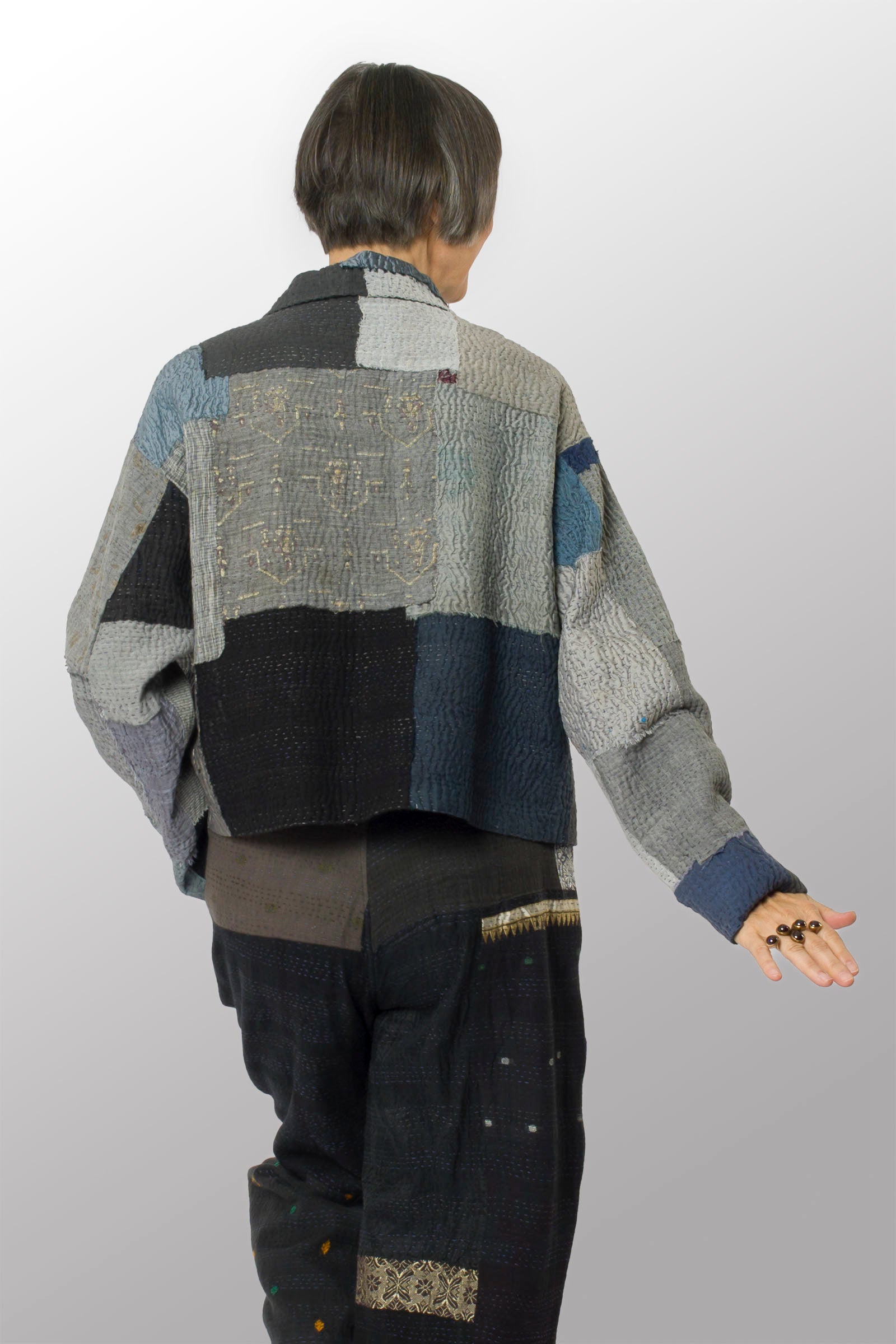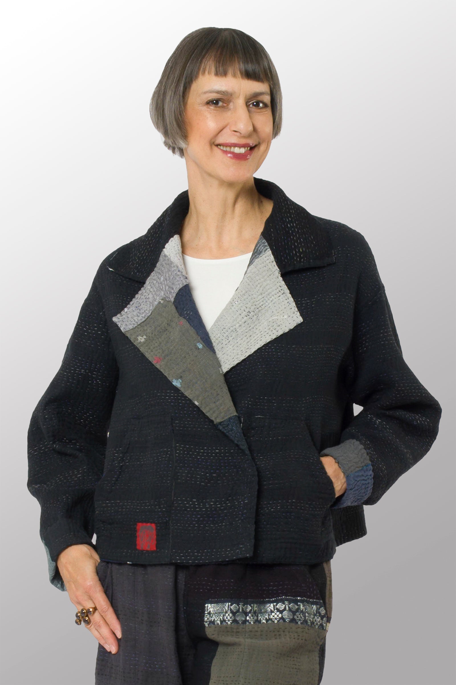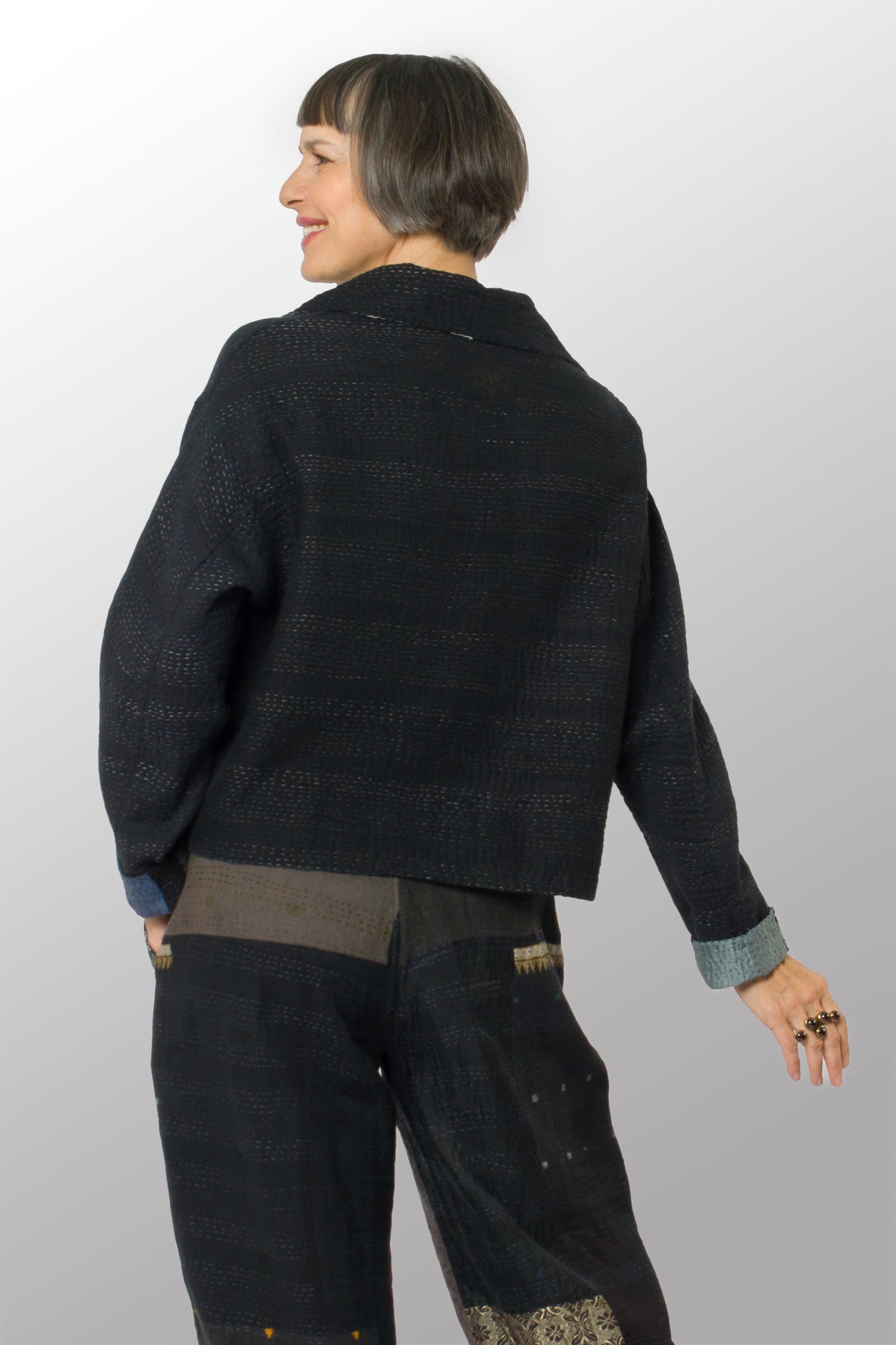 TWO TONE PATCH KANTHA LAPELED SHORT JKT - tn4081-blk -