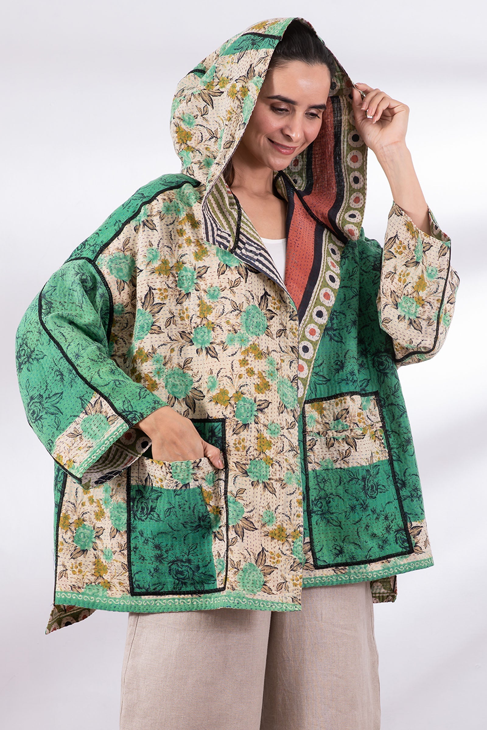 VINTAGE COTTON KANTHA HOODIE PONCHO - cv2064-0001a -