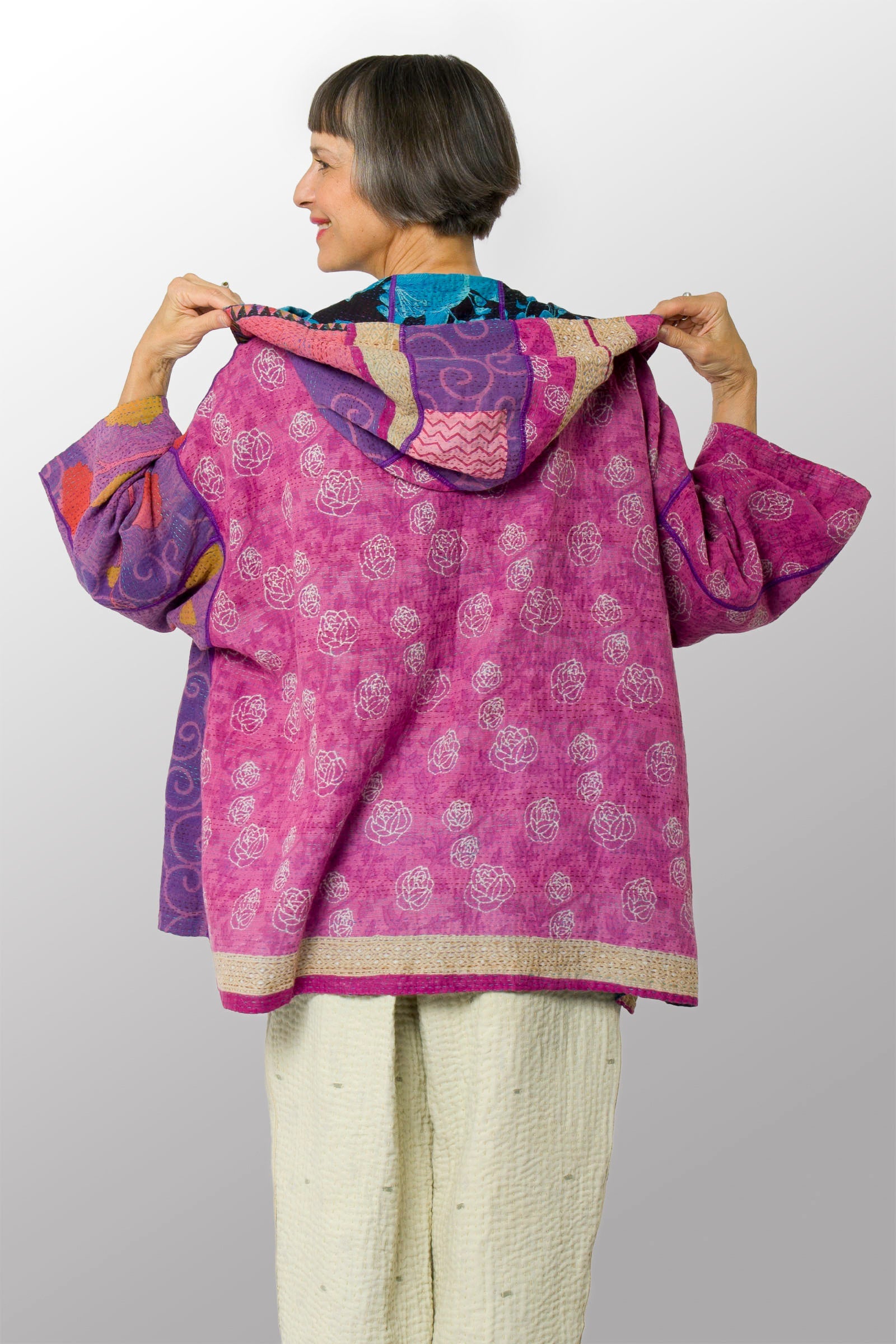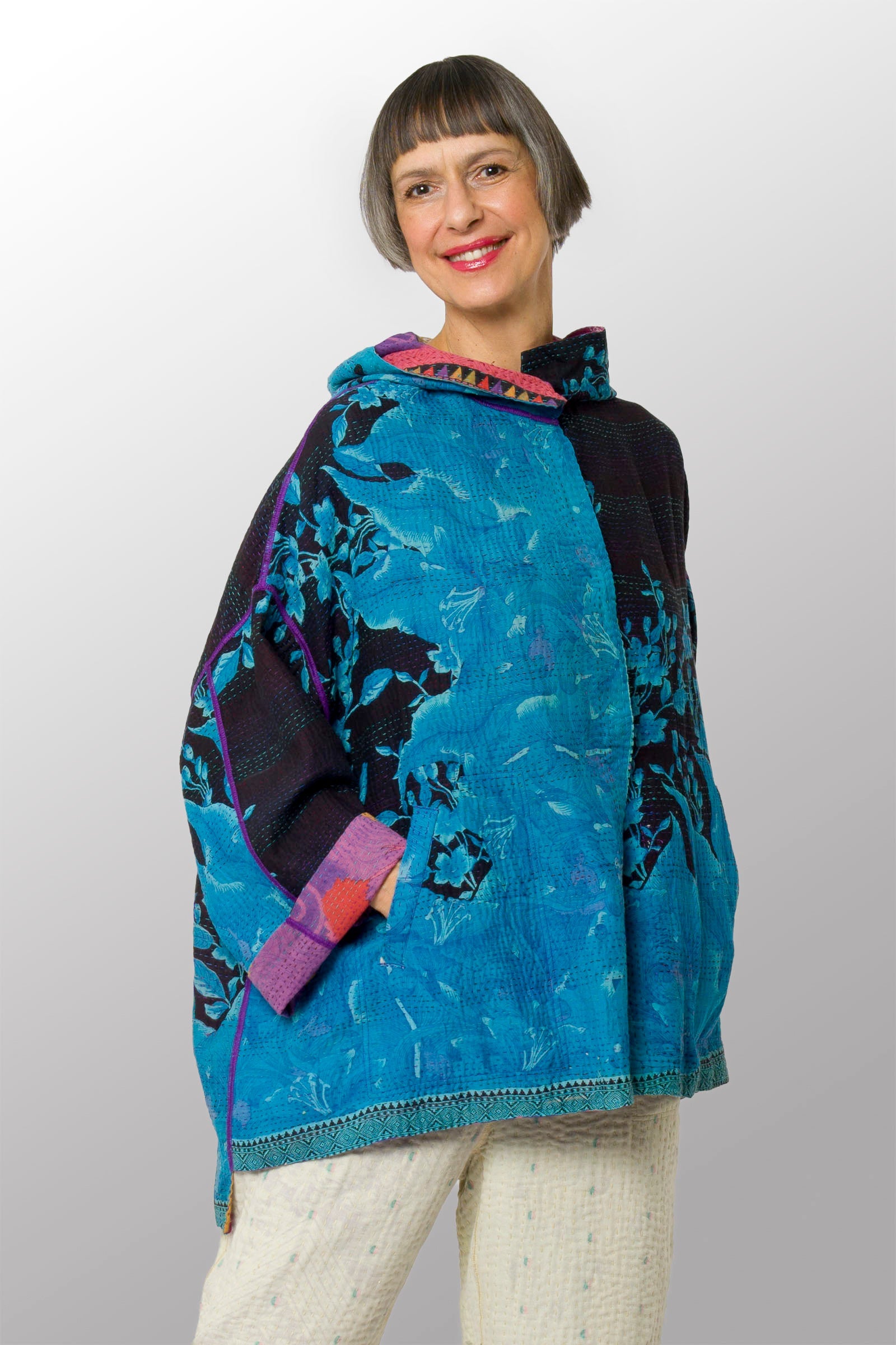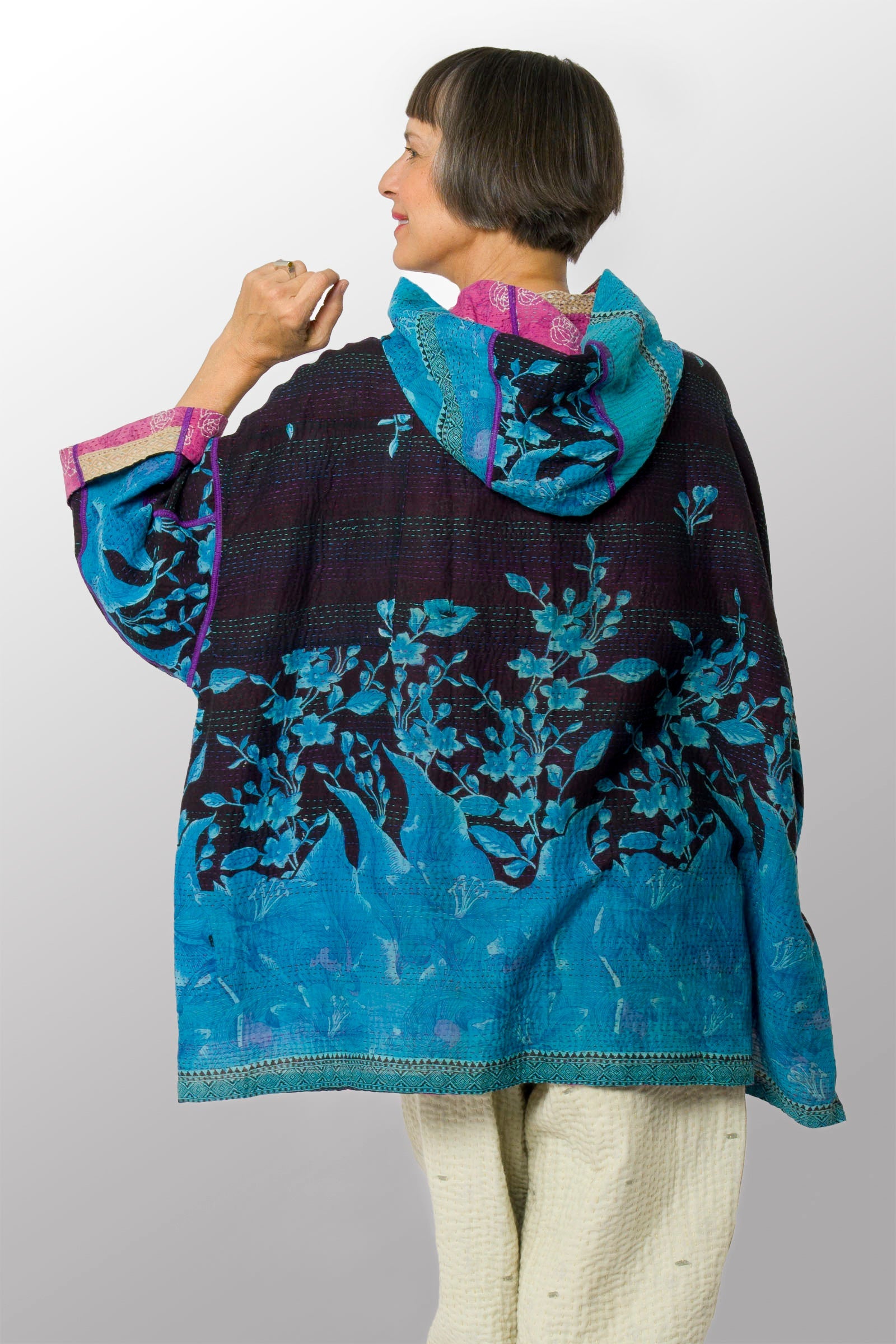 VINTAGE COTTON KANTHA HOODIE PONCHO - cv2064-0007a -