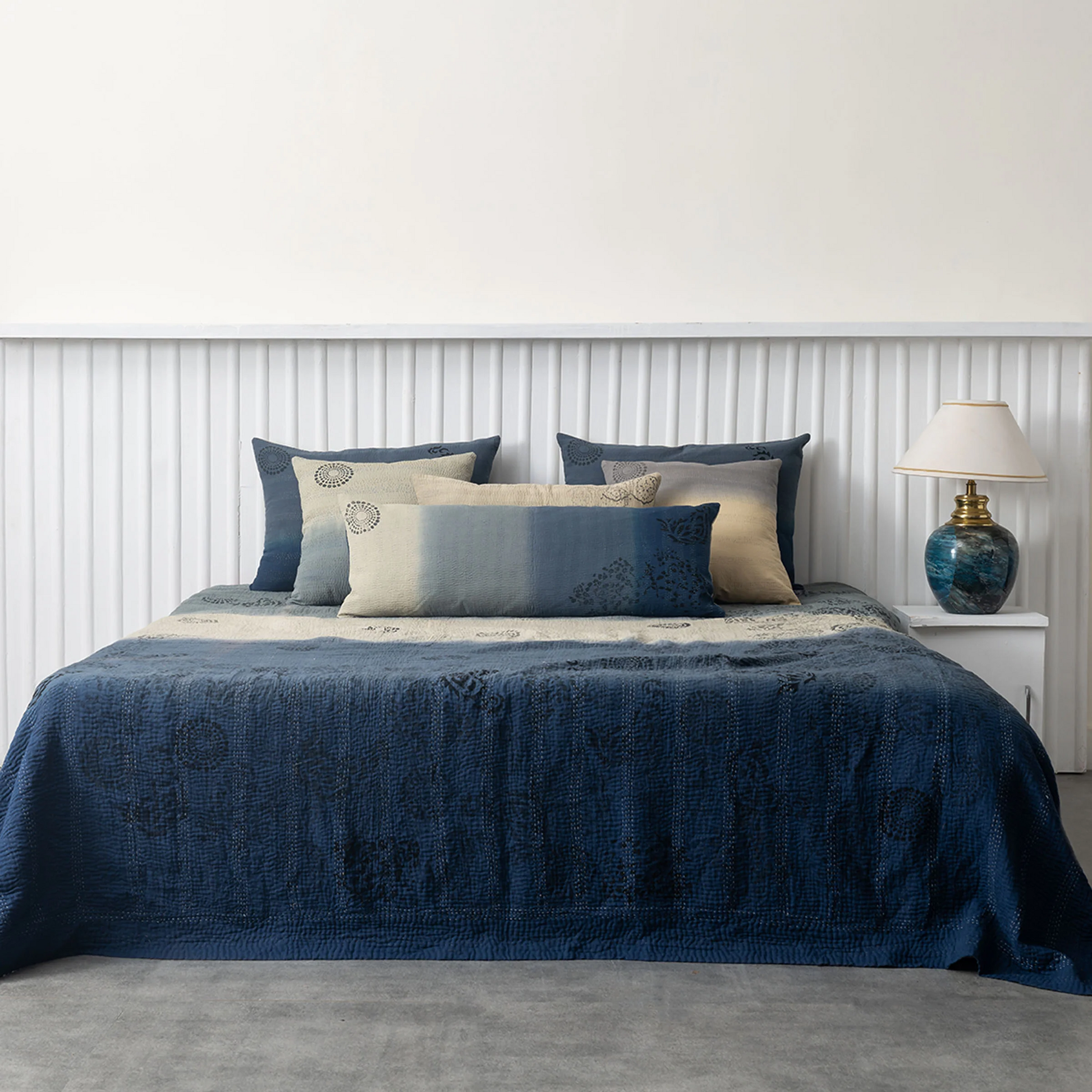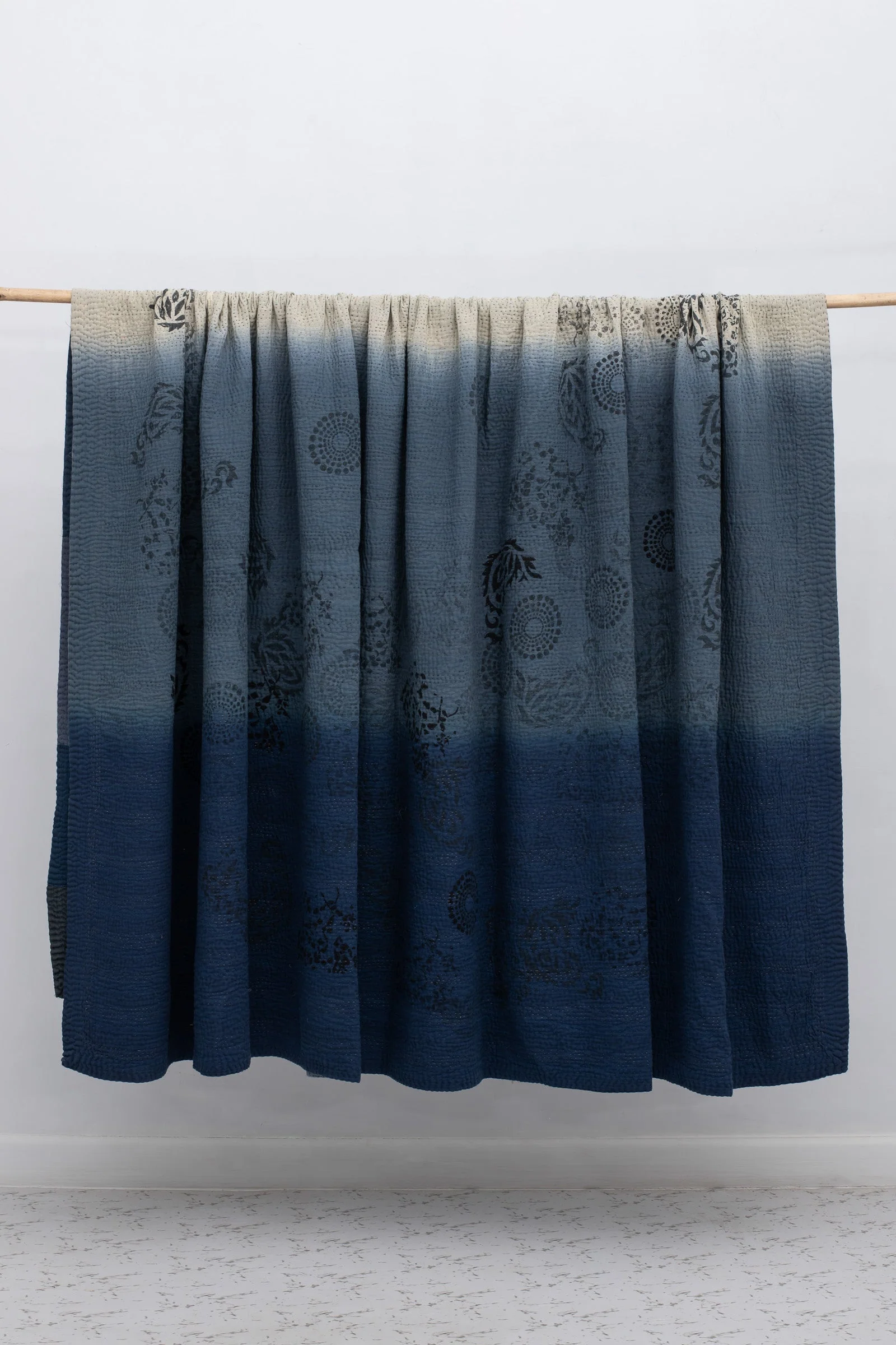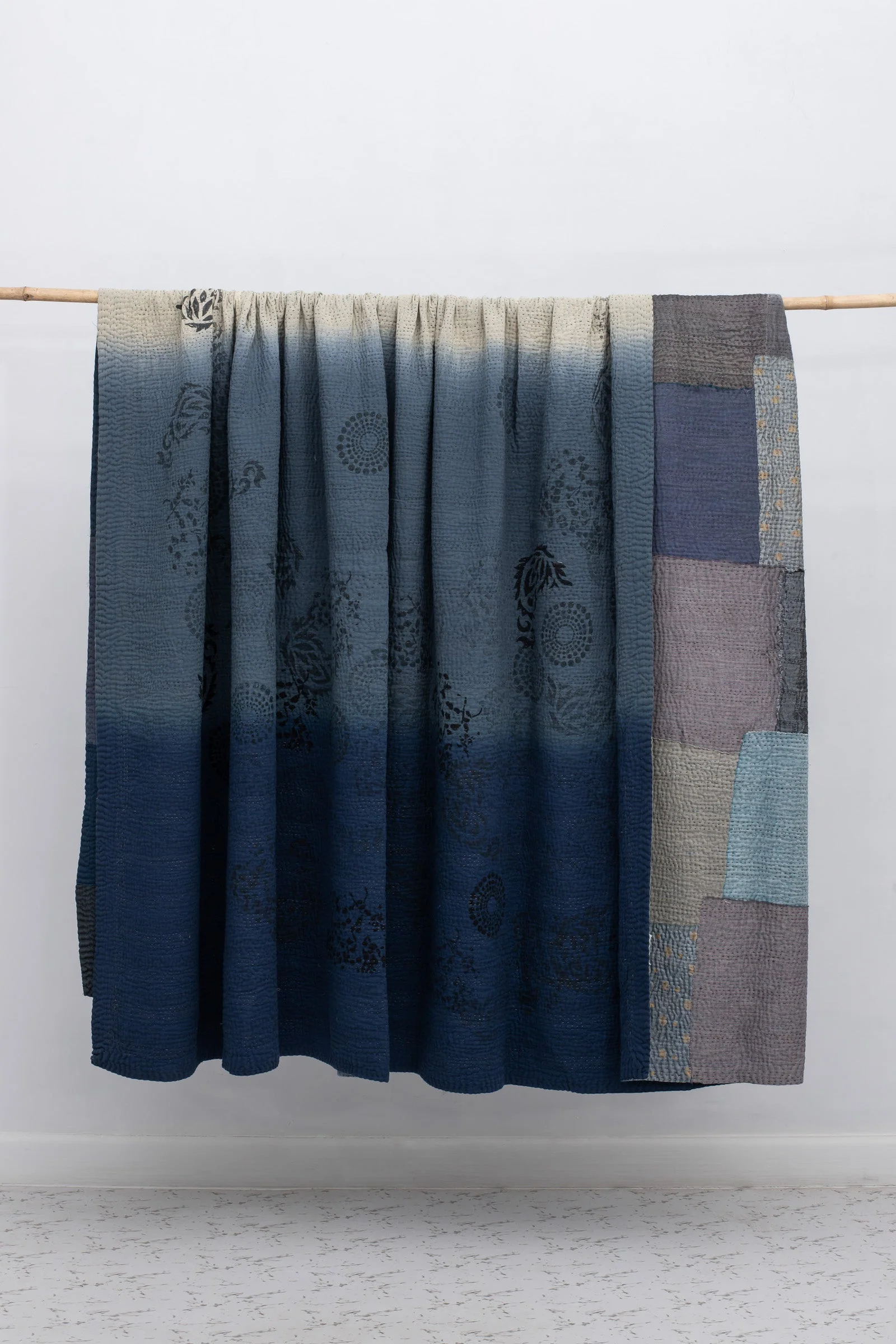Vintage Fray Patch & Ombre Kantha Bedcover -Navy -