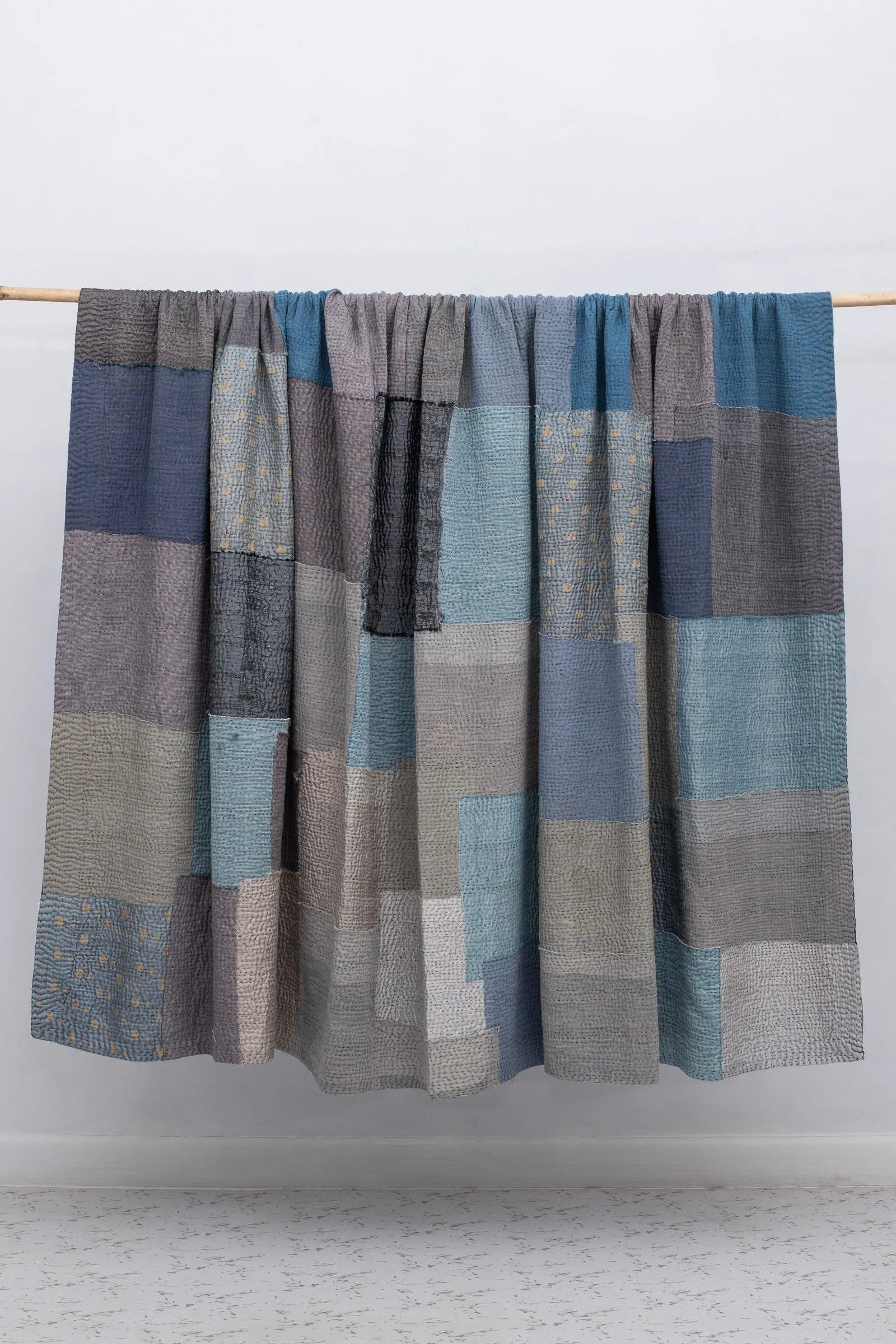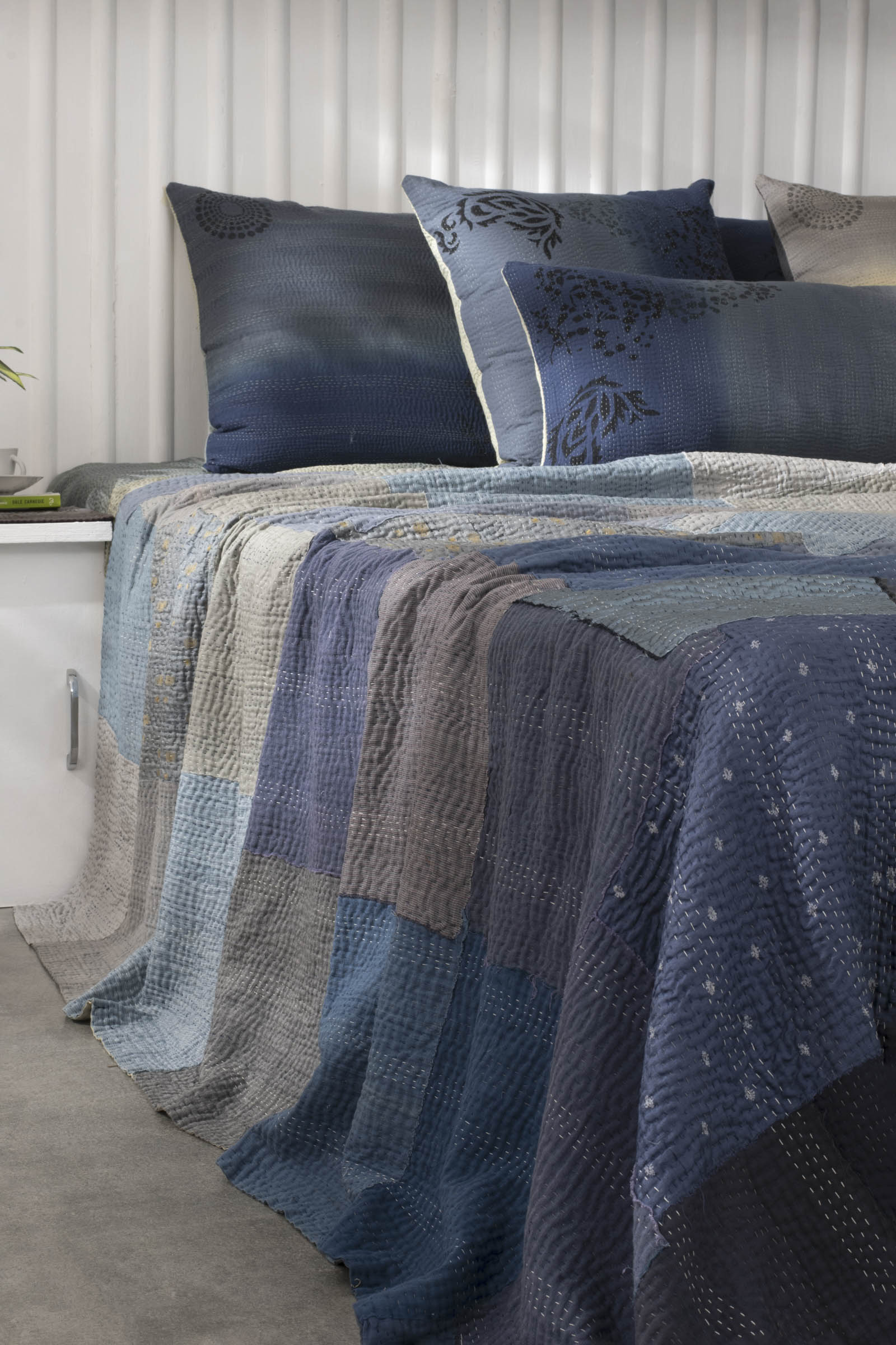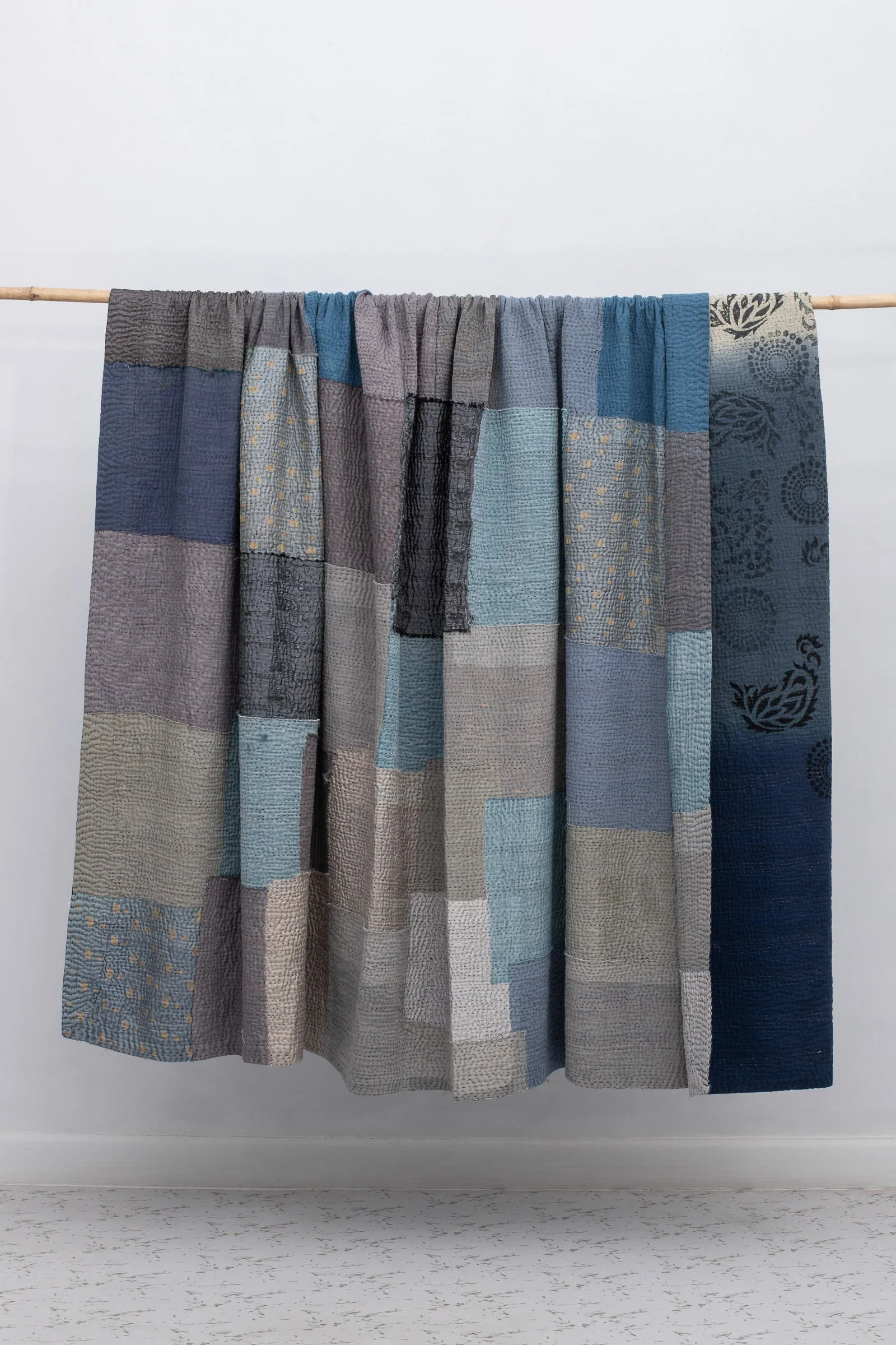 Vintage Fray Patch & Ombre Kantha Bedcover -Navy -