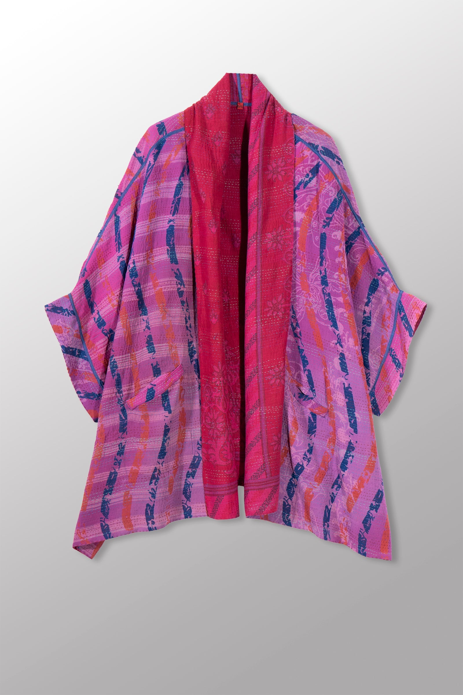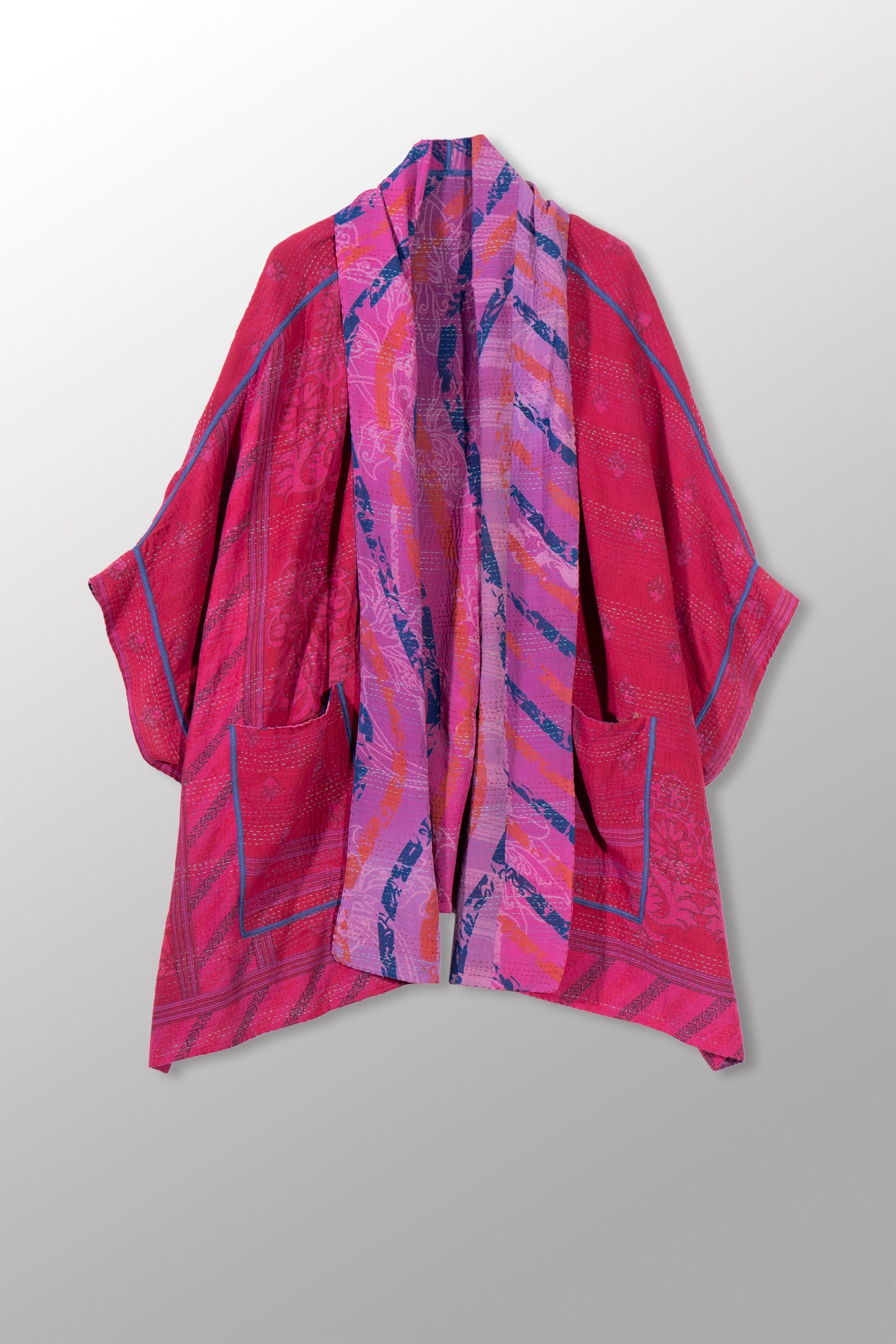 VINTAGE SILK GEORGETTE COTTON KANTHA DOUBLE COLLAR PONCHO - gc2323-0001a -