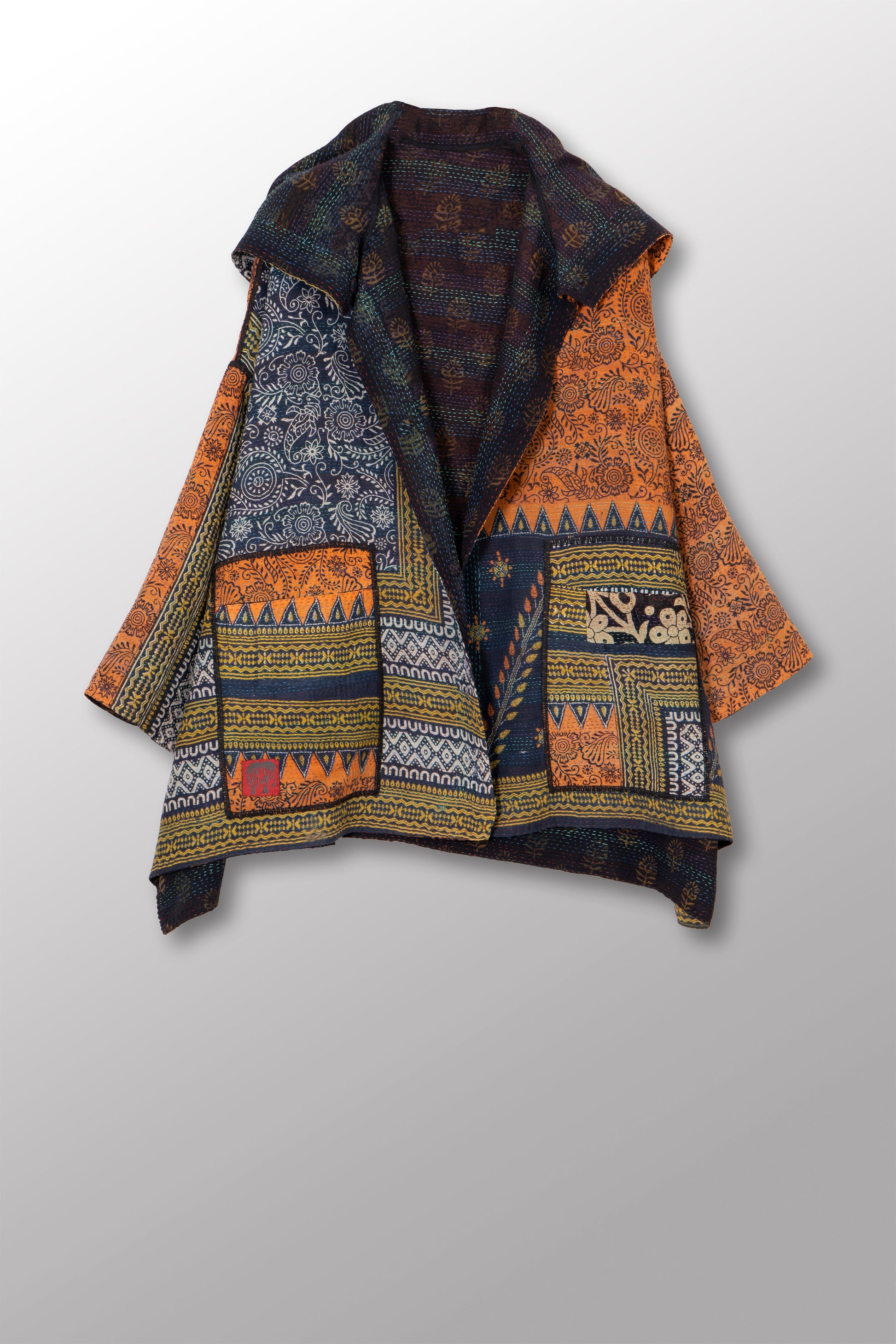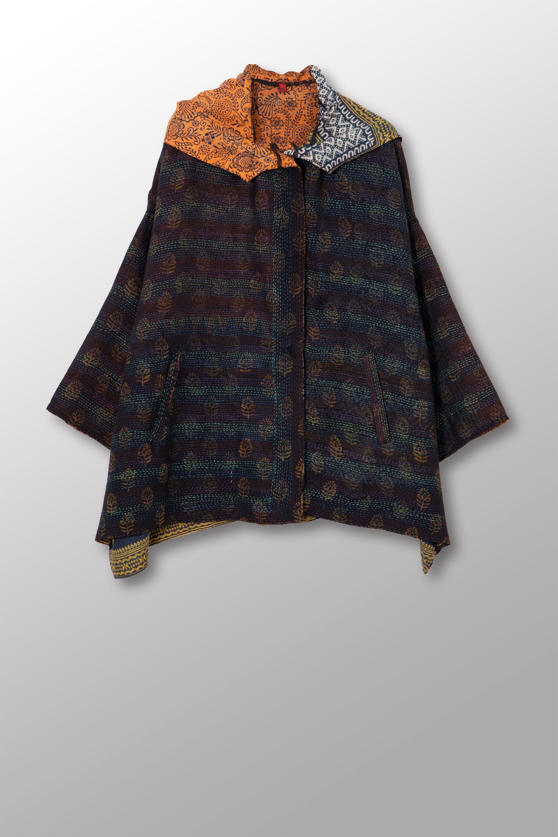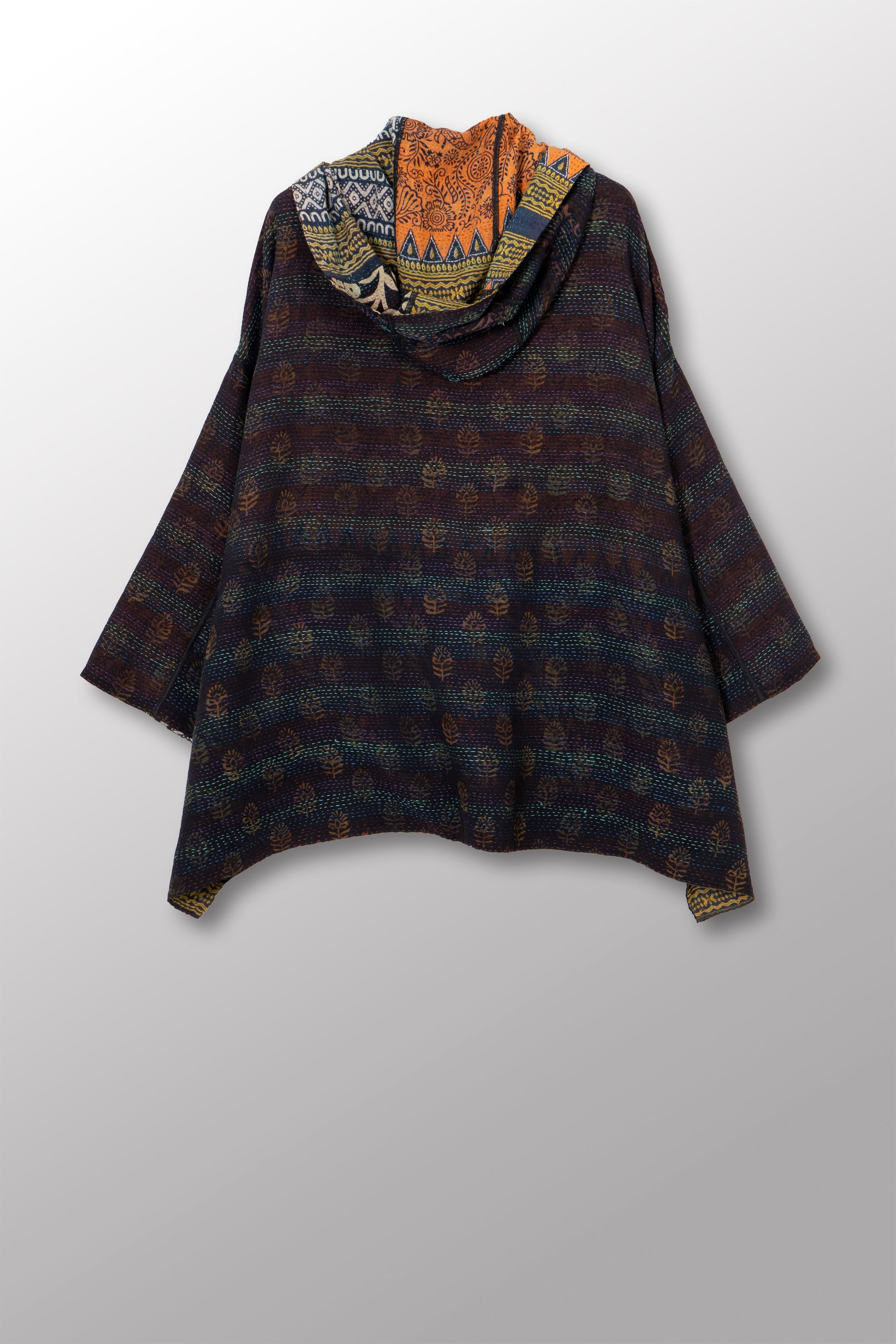 VINTAGE SILK GEORGETTE COTTON KANTHA HOODIE PONCHO - gc2064-0001a -