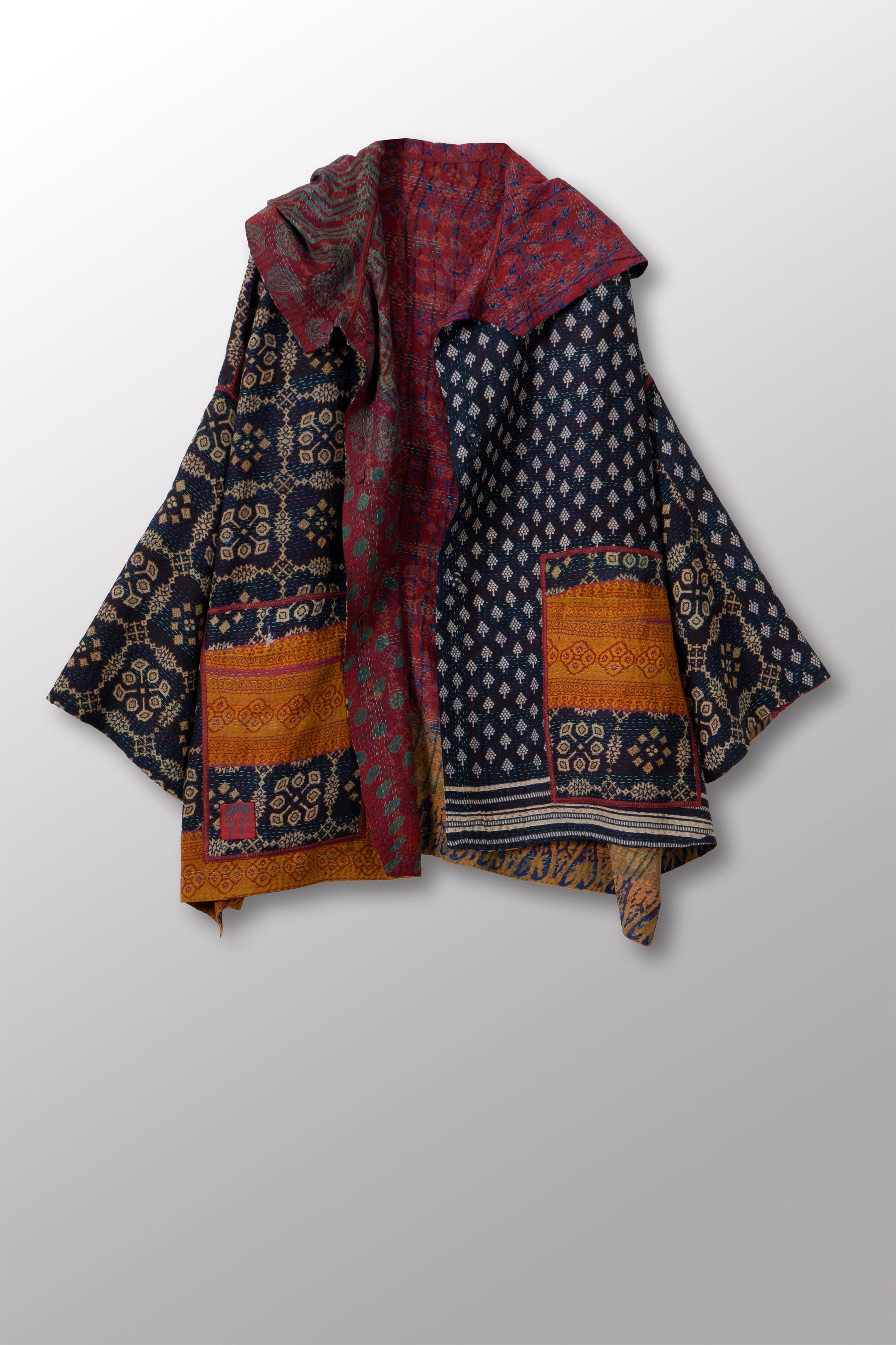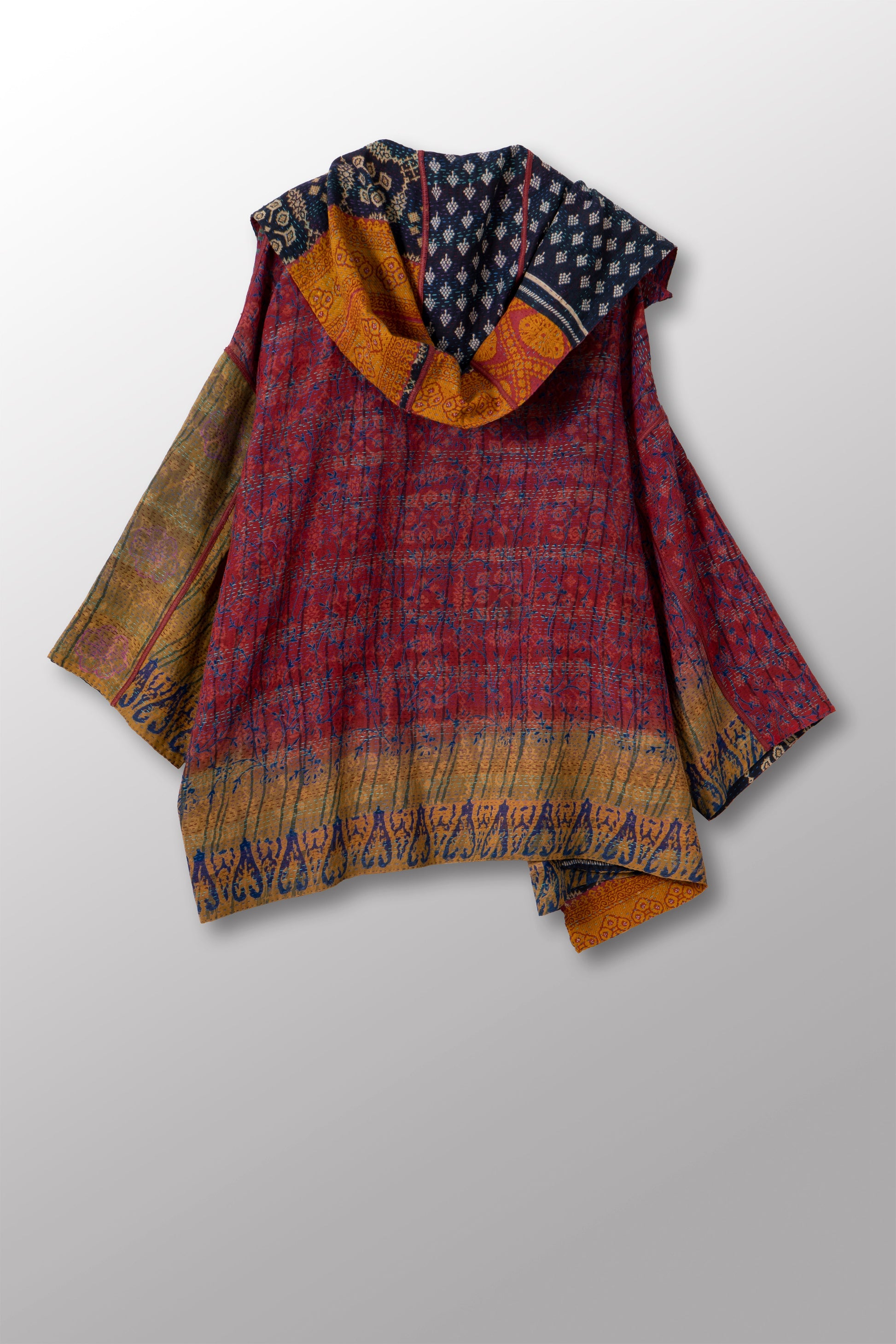 VINTAGE SILK GEORGETTE COTTON KANTHA HOODIE PONCHO - gc2064-0002a -