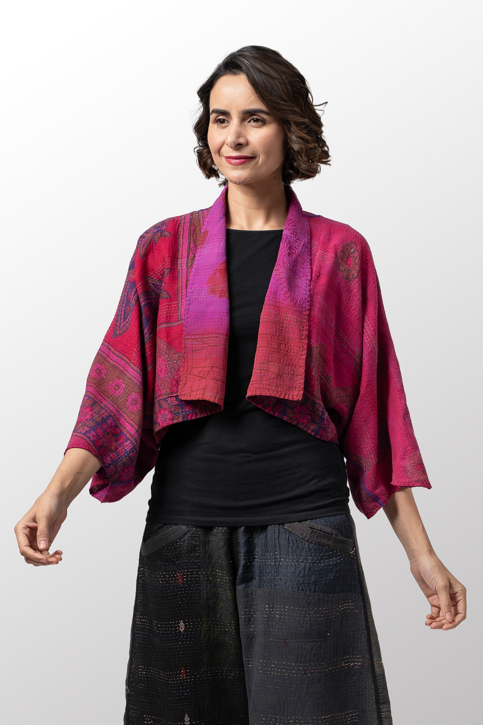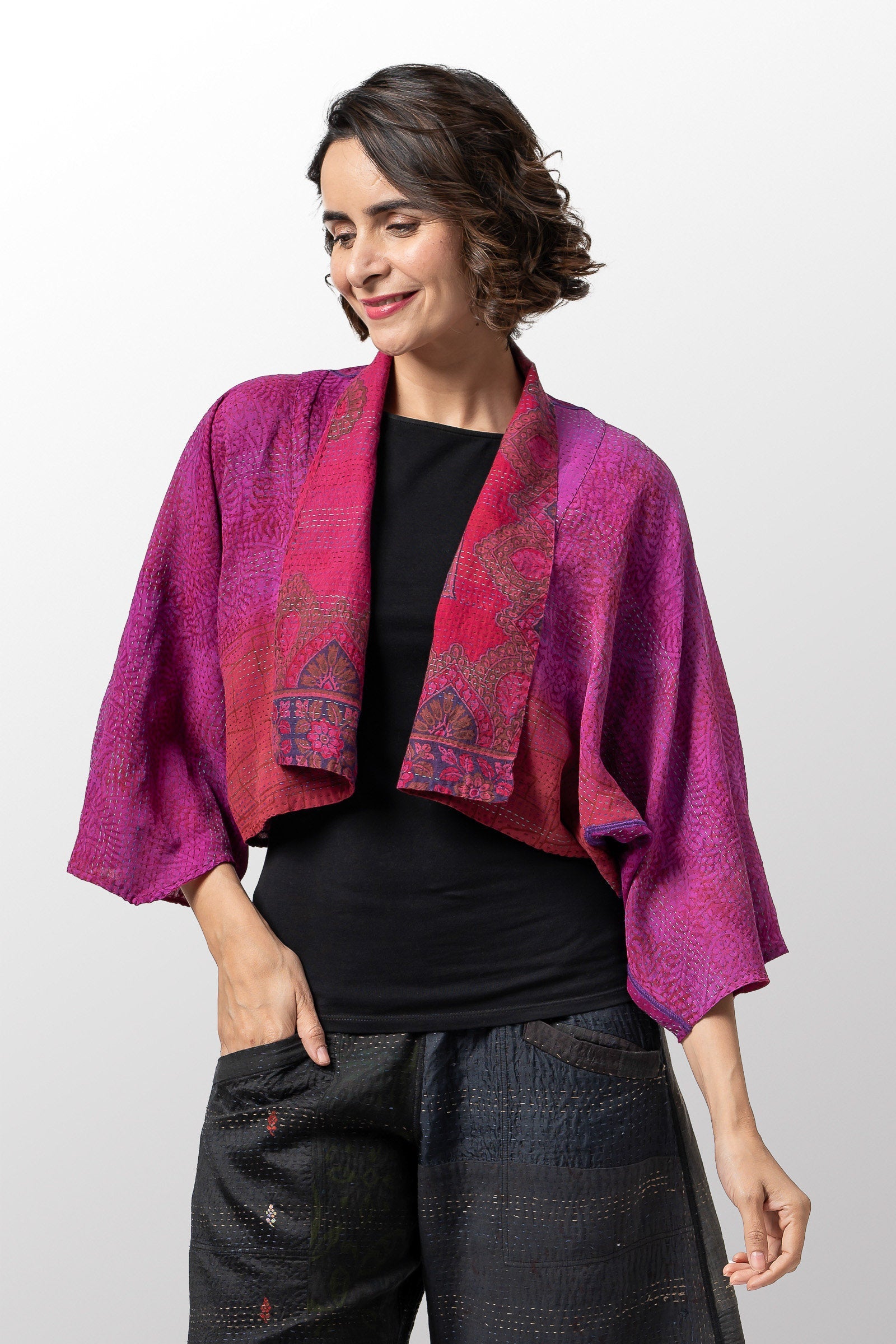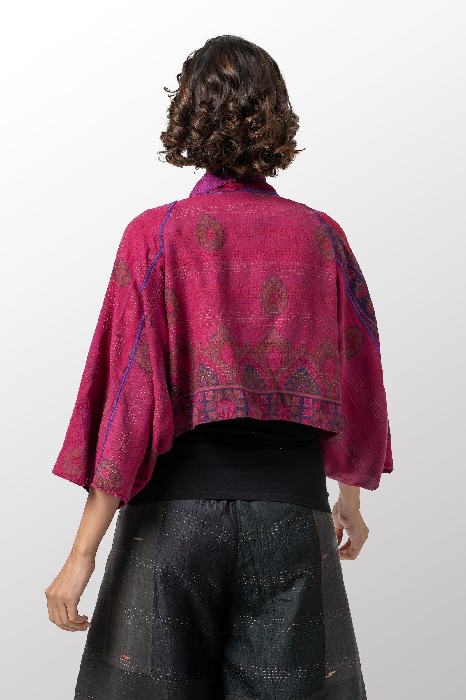 VINTAGE SILK GEORGETTE COTTON KANTHA PUFF SLV. SHRUG - gc2062-0002a -
