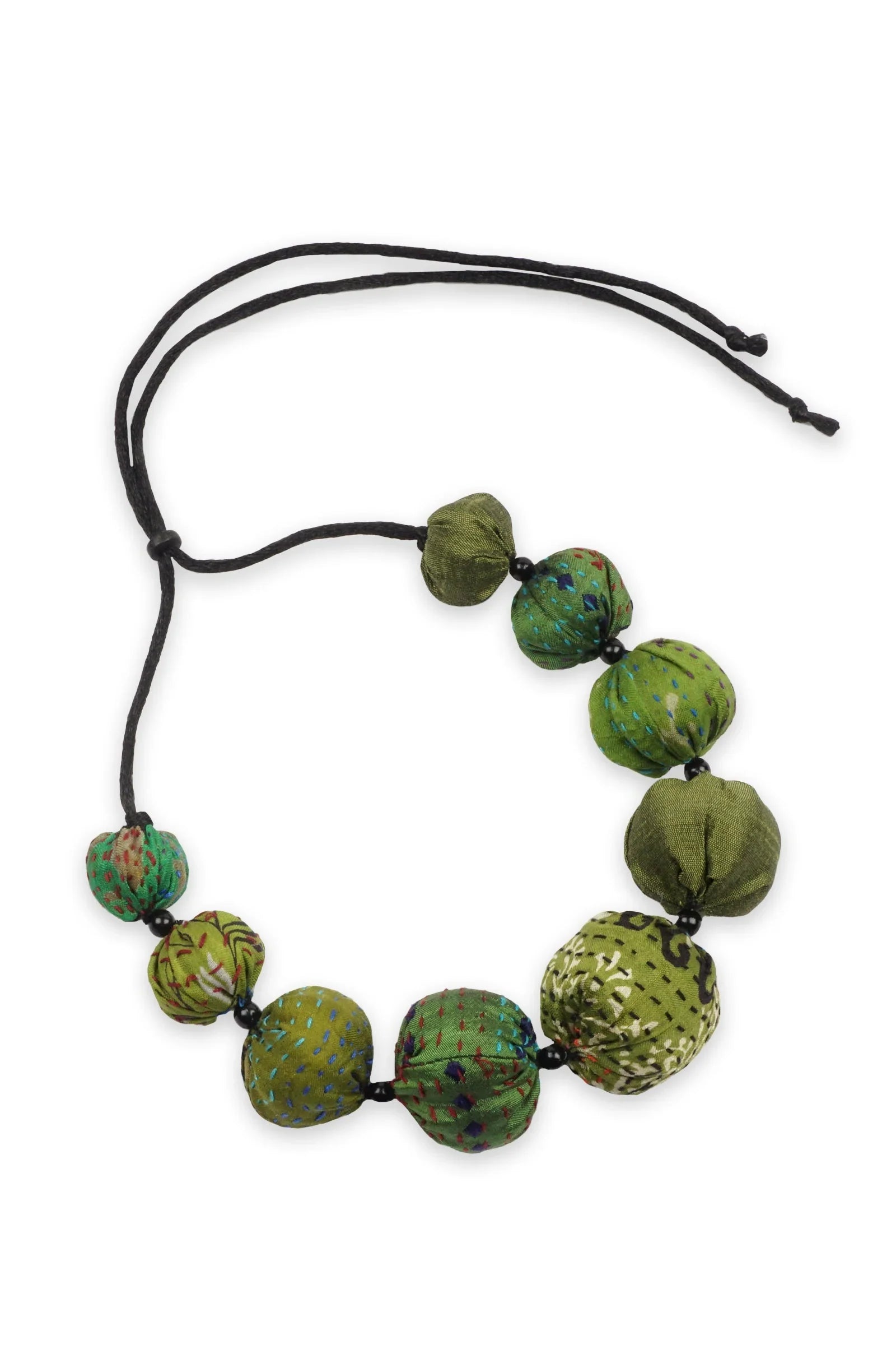 VINTAGE SILK KANTHA NUTS SHORT NECKLACE - sv2700-grn -