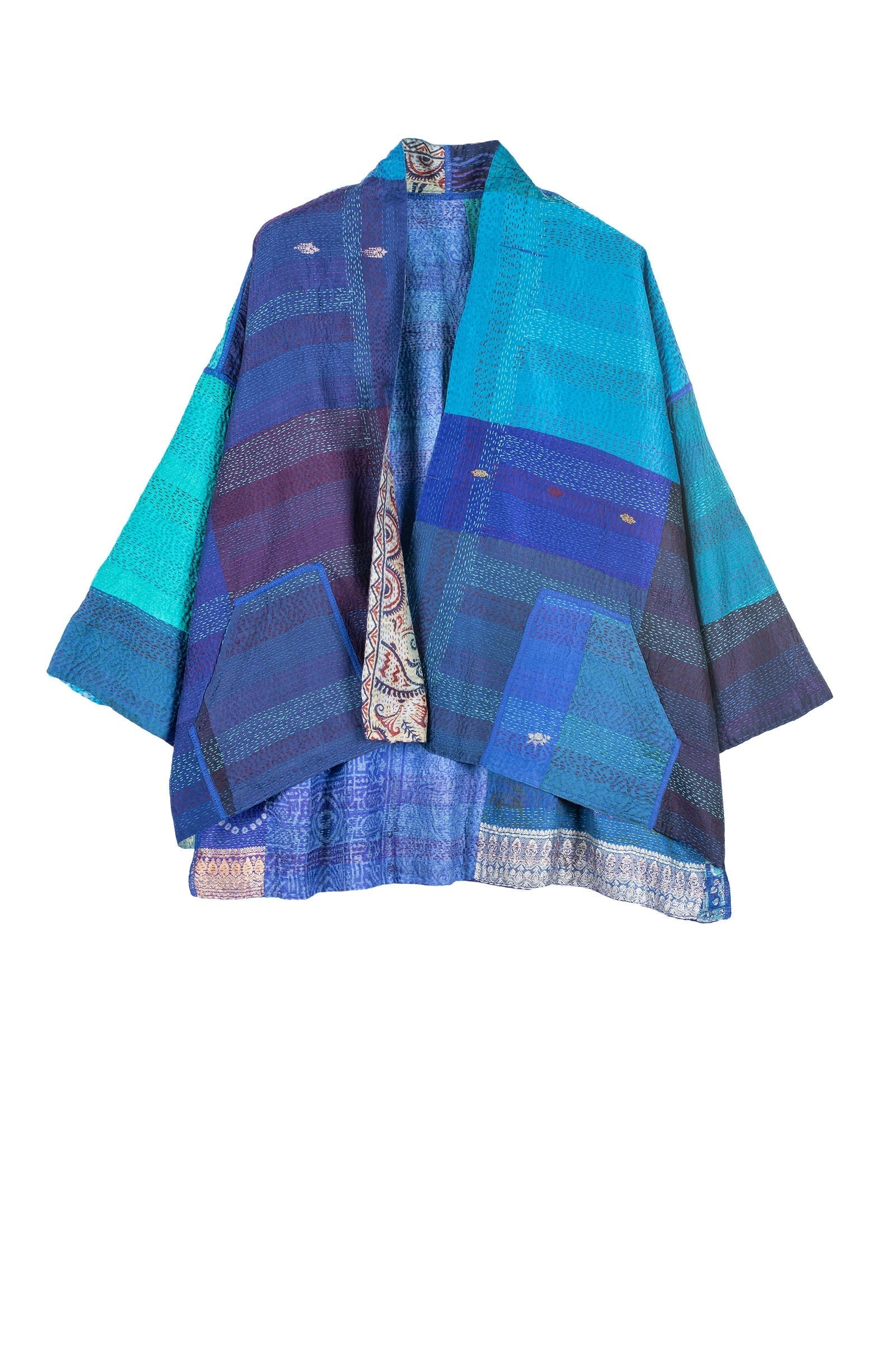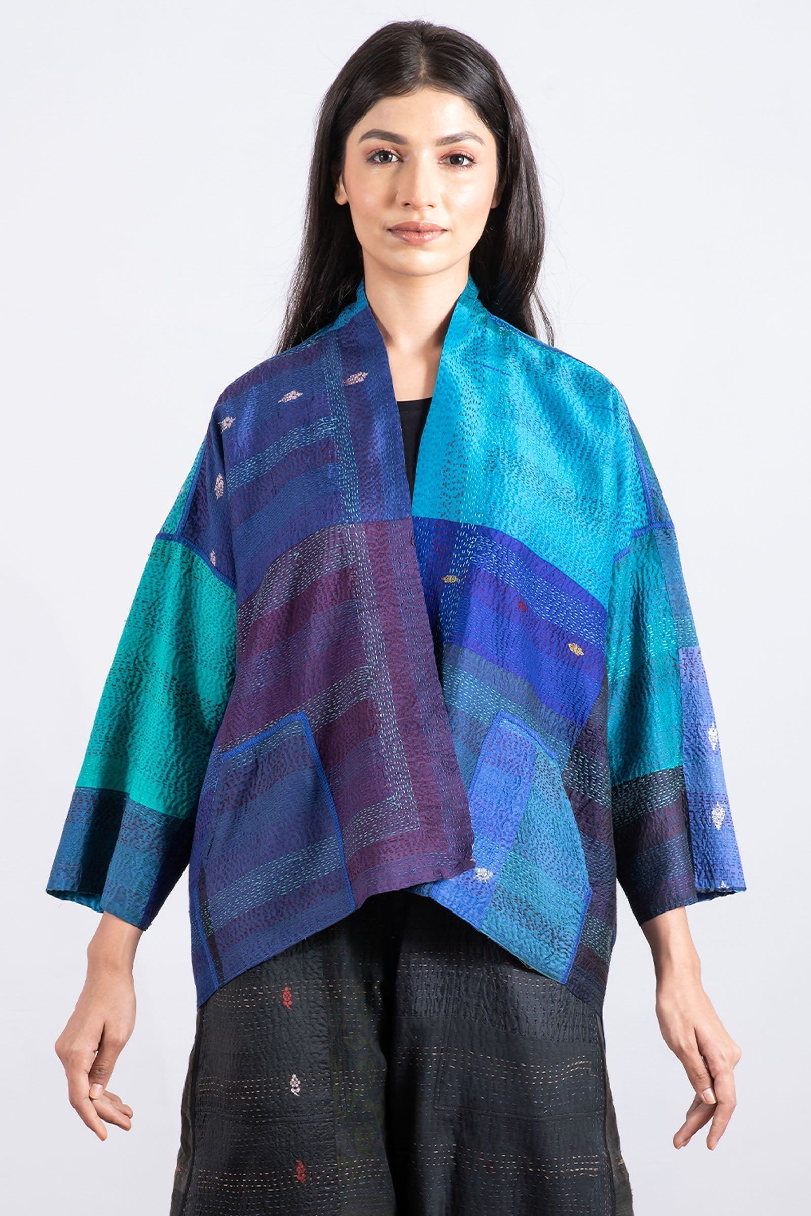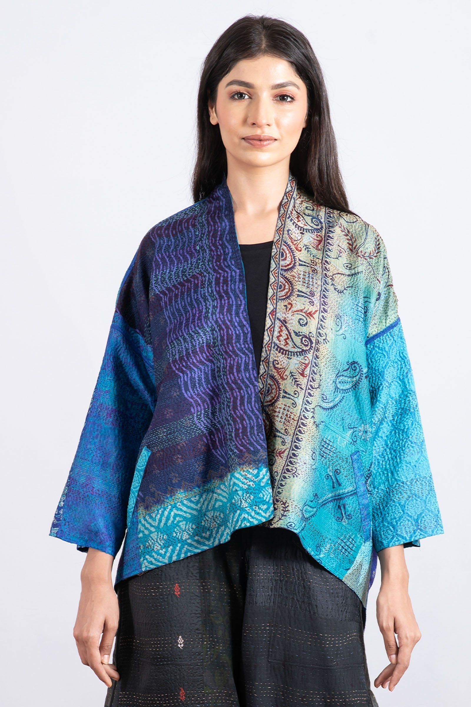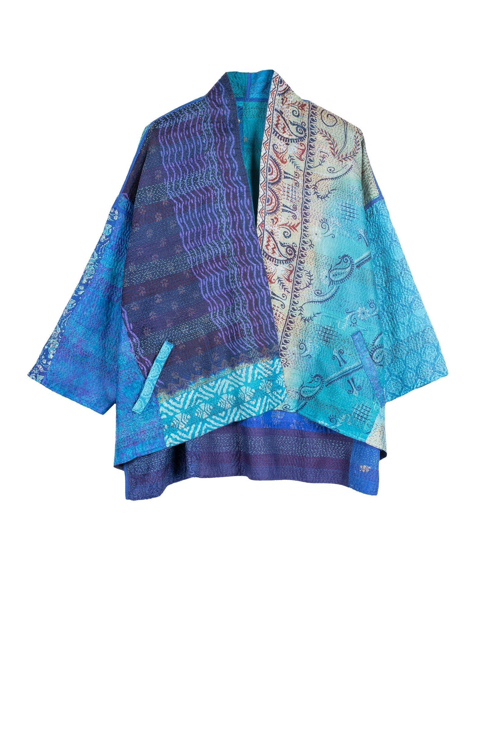 VINTAGE SILK PATCH KANTHA MINI KIMONO JKT - vp2055-blu -